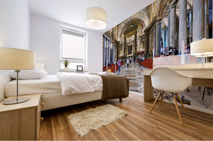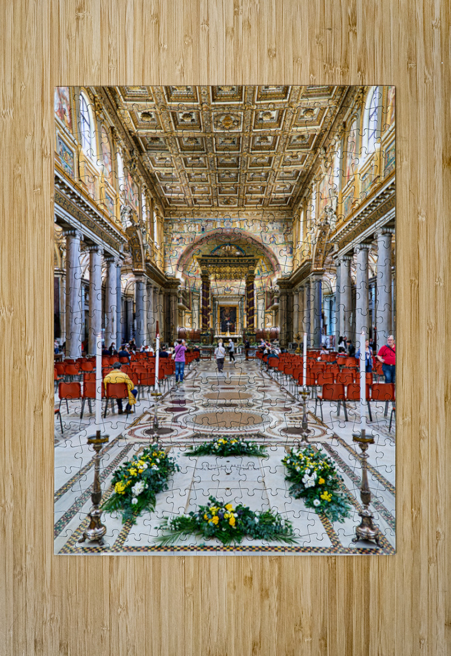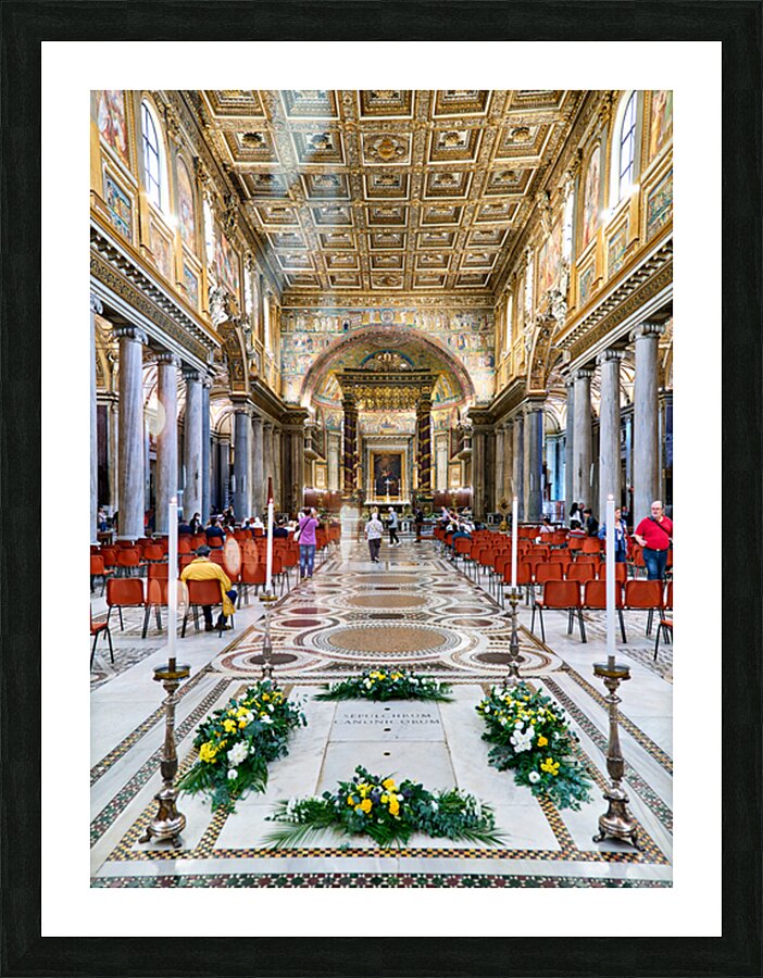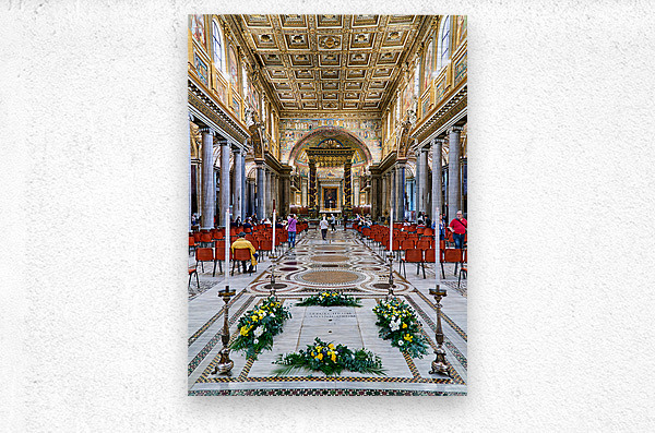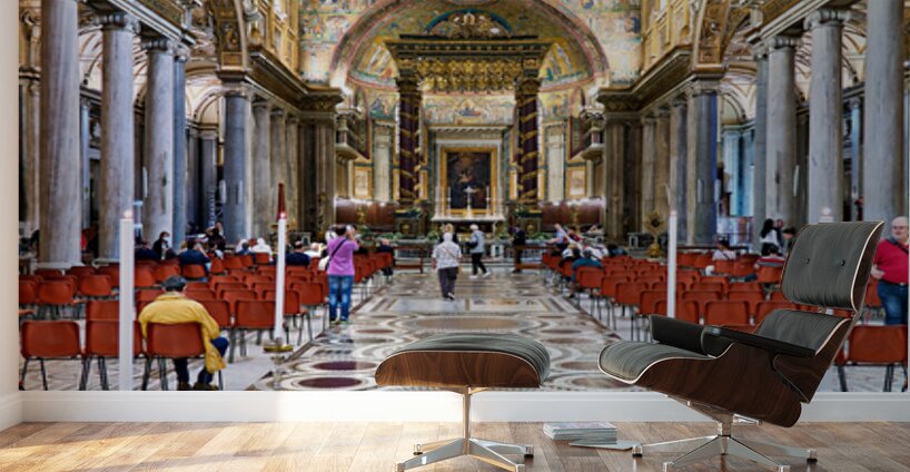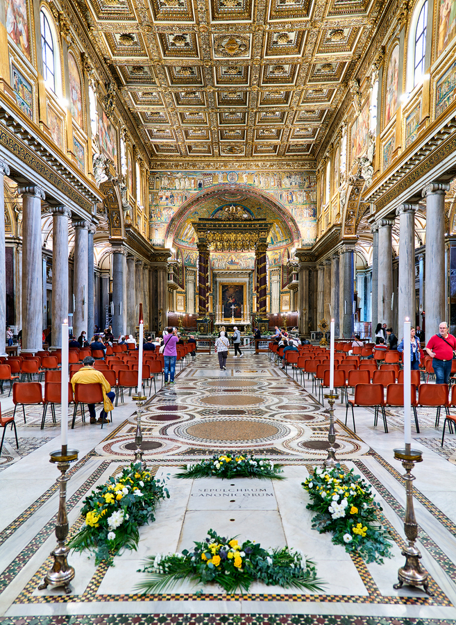 People walk inside Basilica of Saint Mary Major in Rome. The grand architecture and decorations draw attention from visitors.