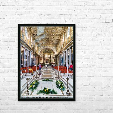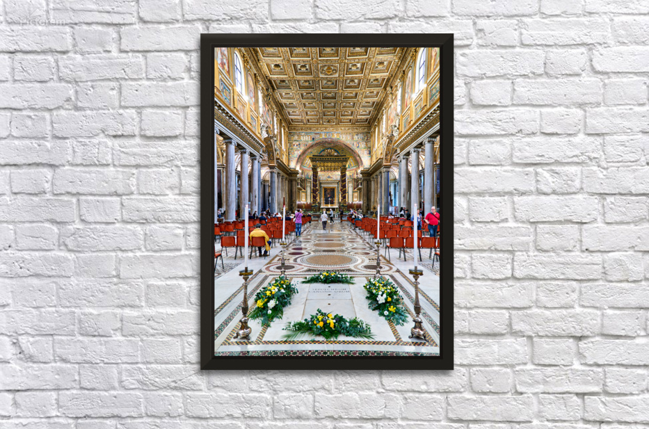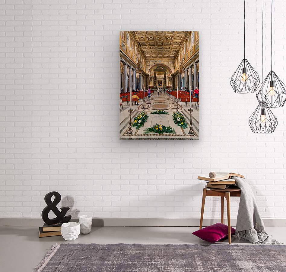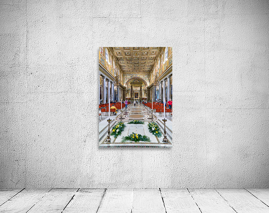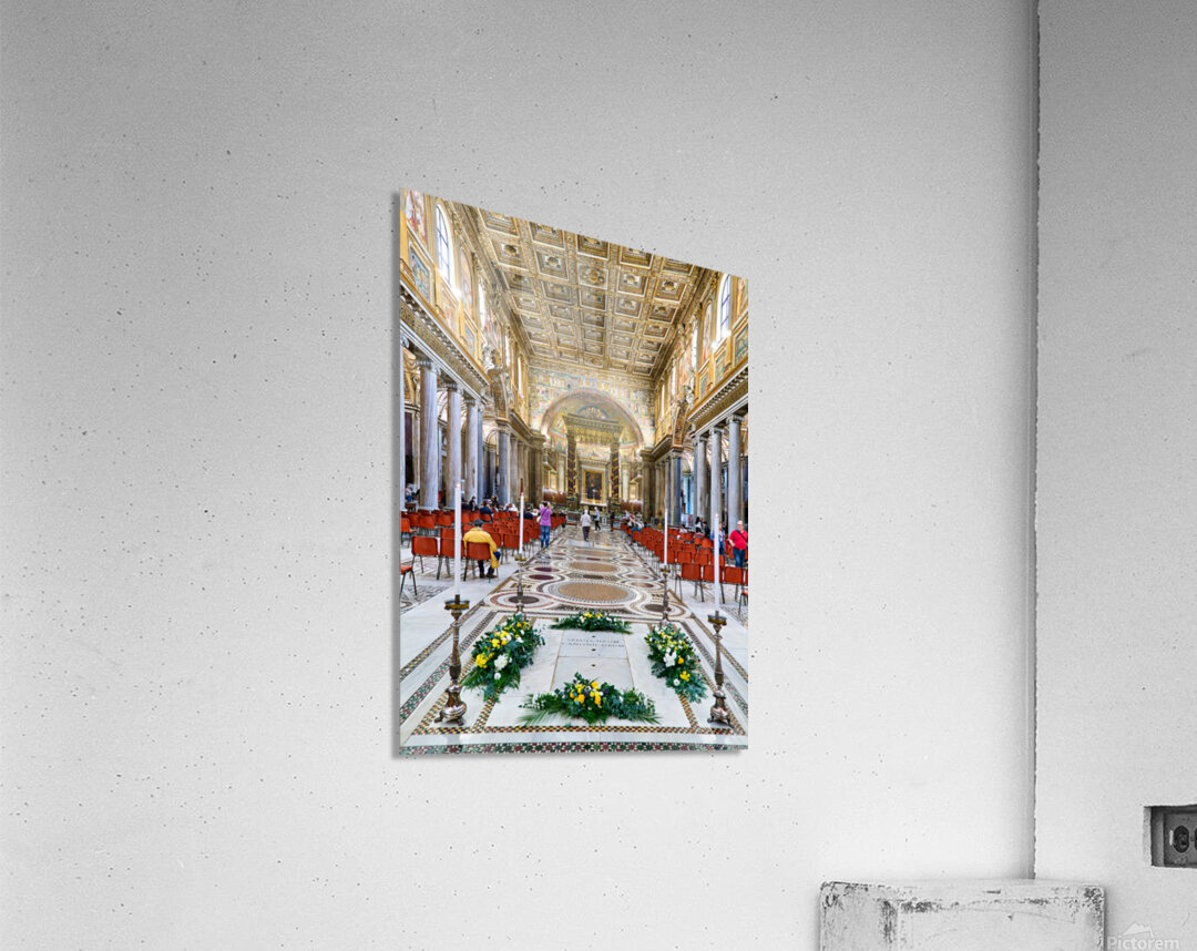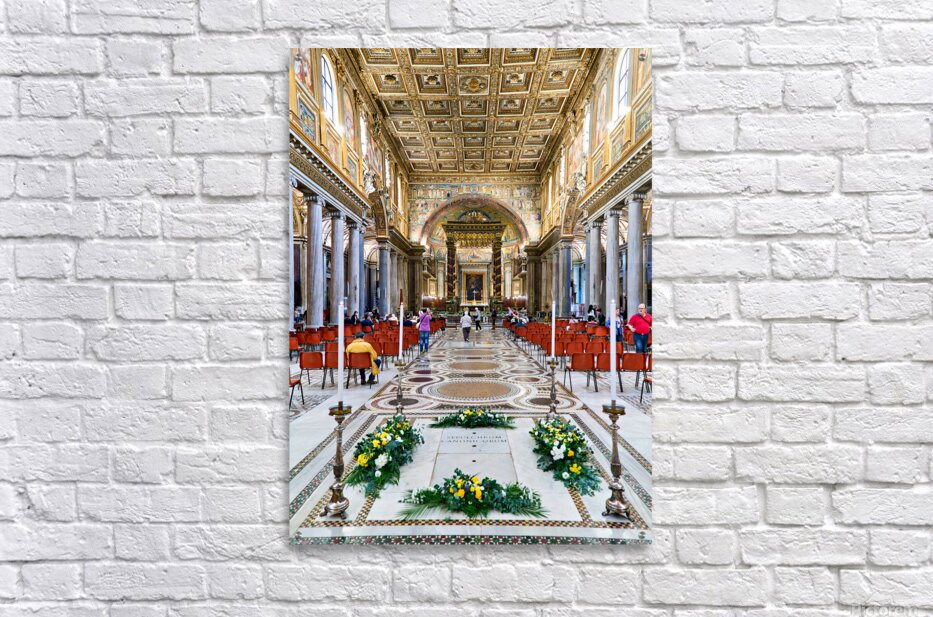 People walk inside Basilica of Saint Mary Major in Rome. The grand architecture and decorations draw attention from visitors.