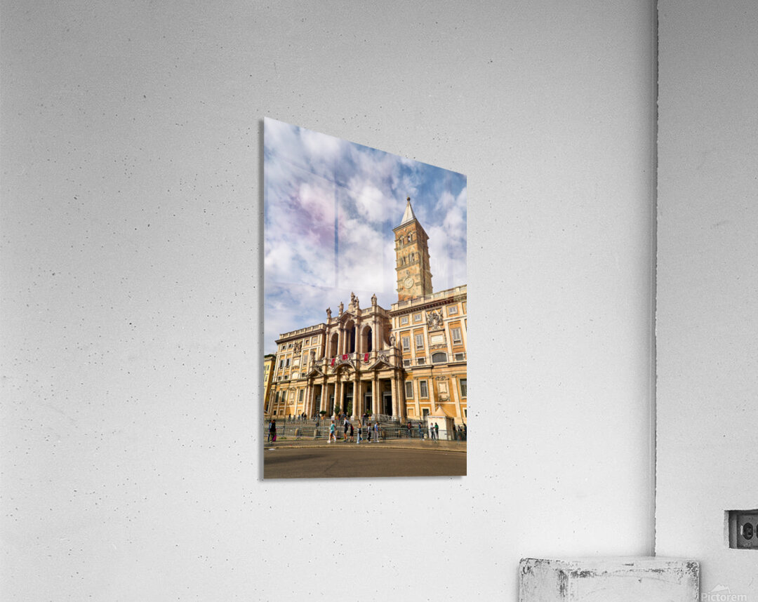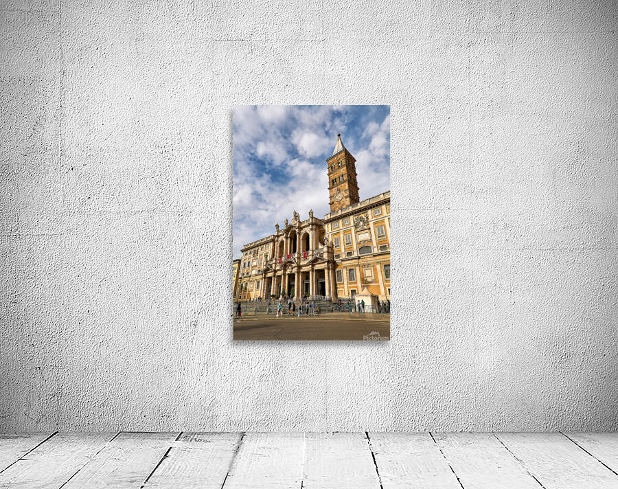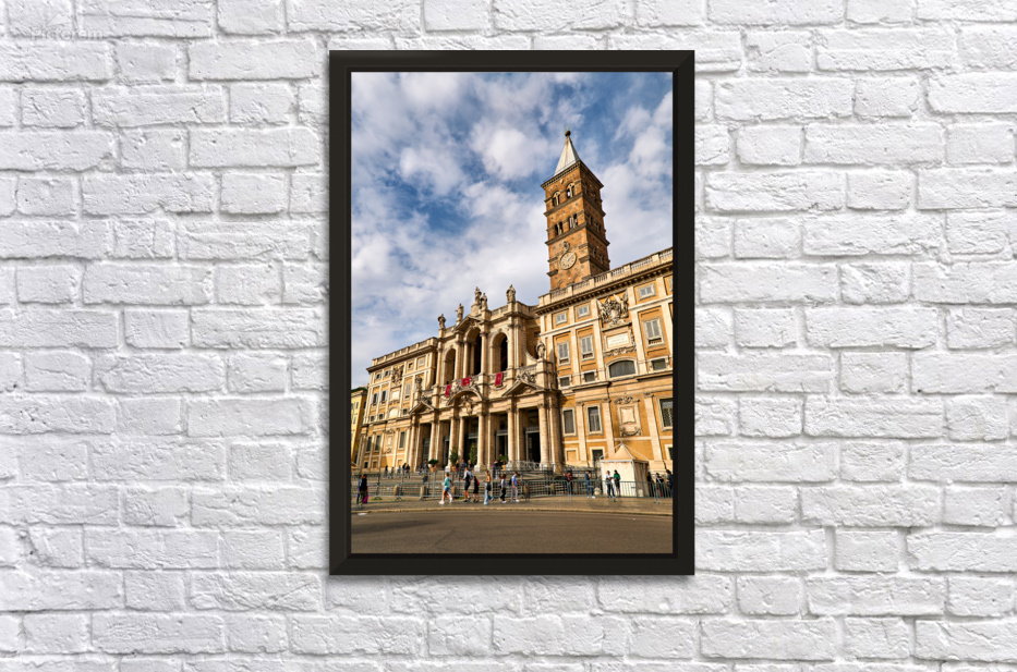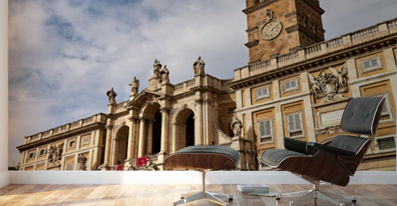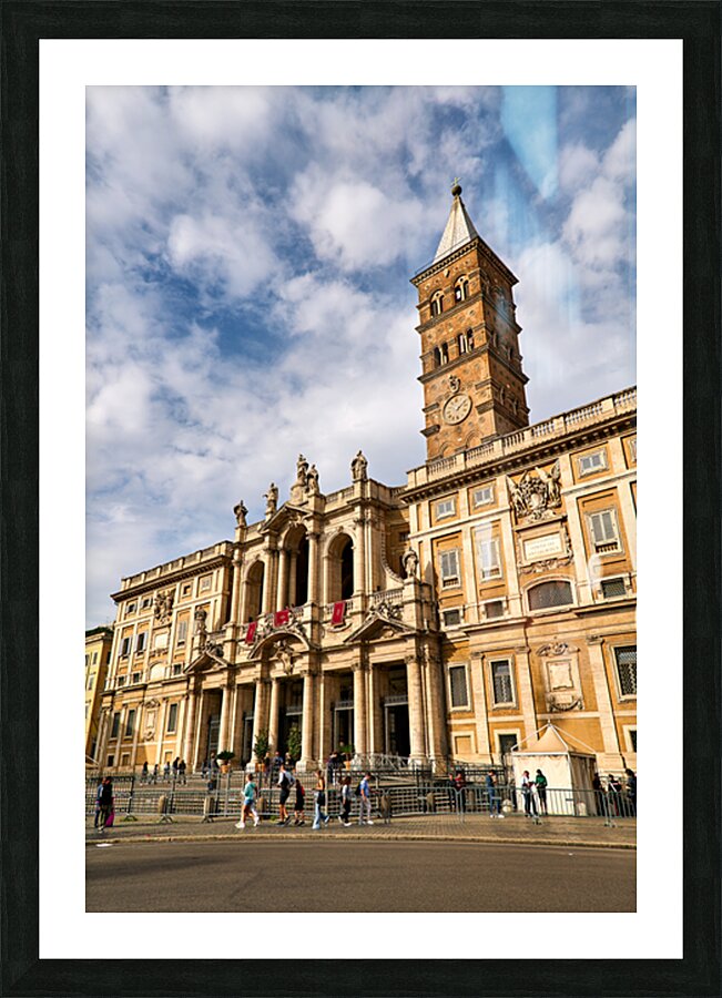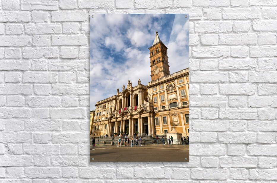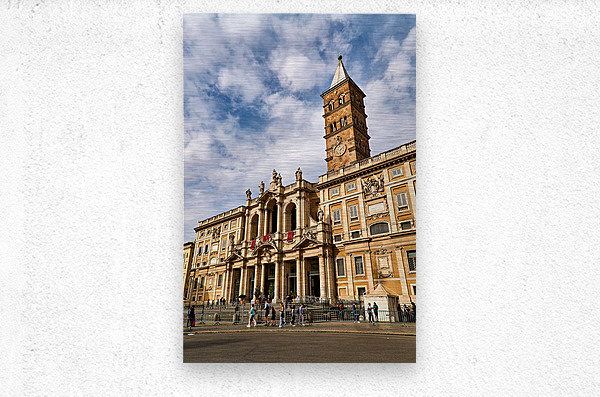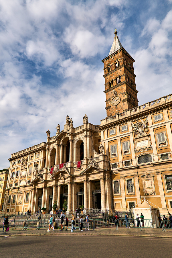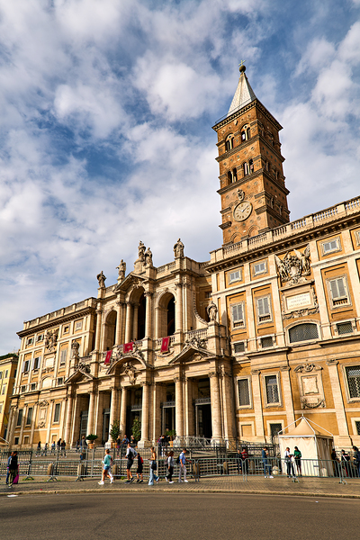 Visitors explore the Basilica of Saint Mary Major in Rome Lazio Italy. The sun shines on its historic architecture and clock tower.