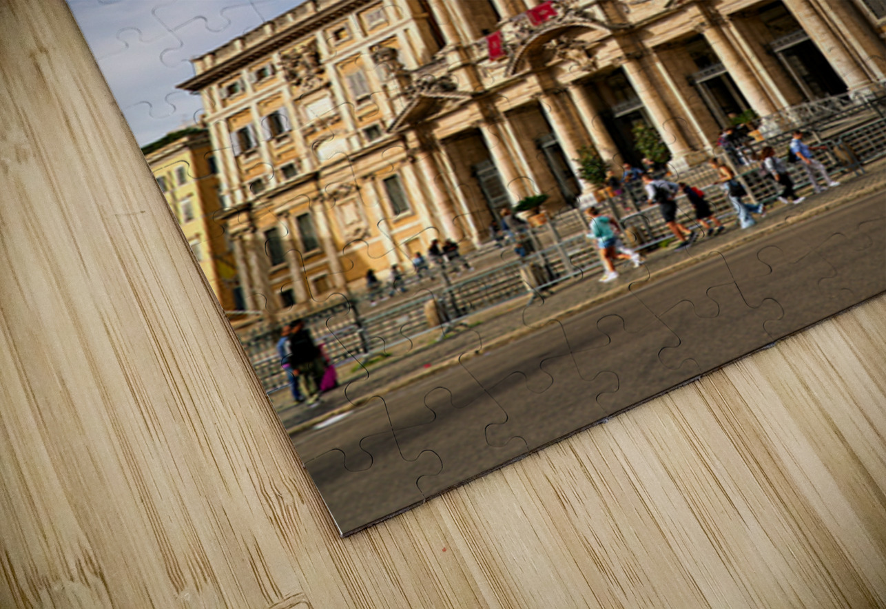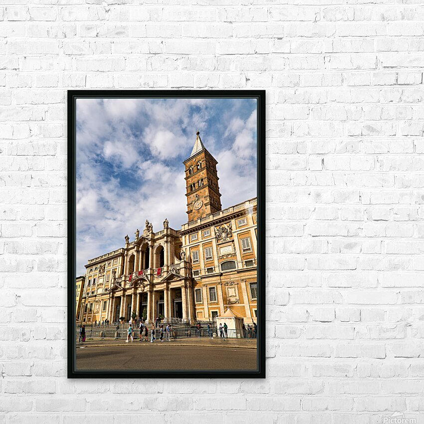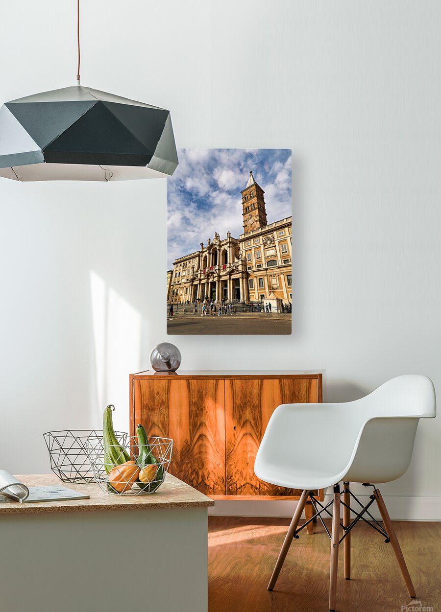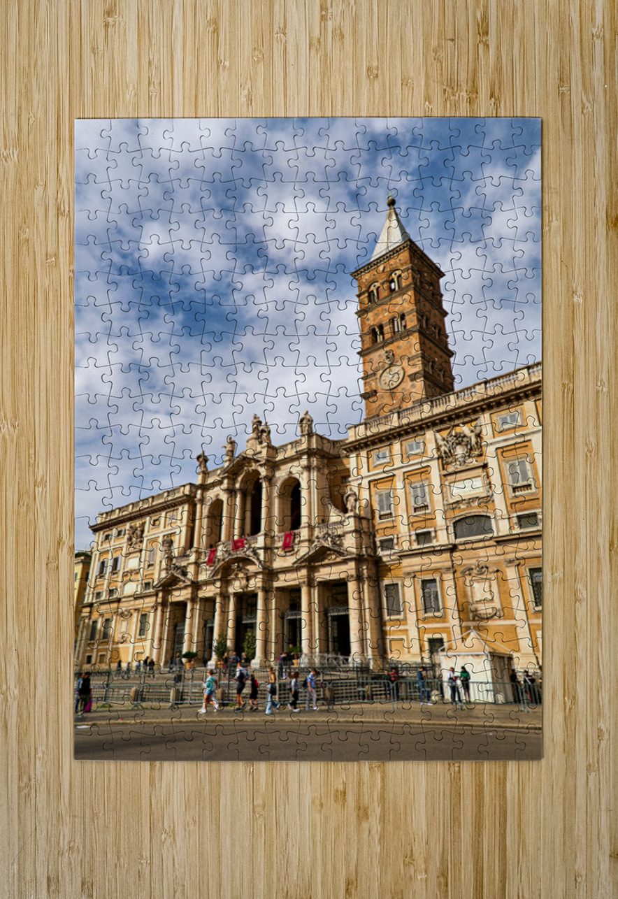 Visitors explore the Basilica of Saint Mary Major in Rome Lazio Italy. The sun shines on its historic architecture and clock tower.