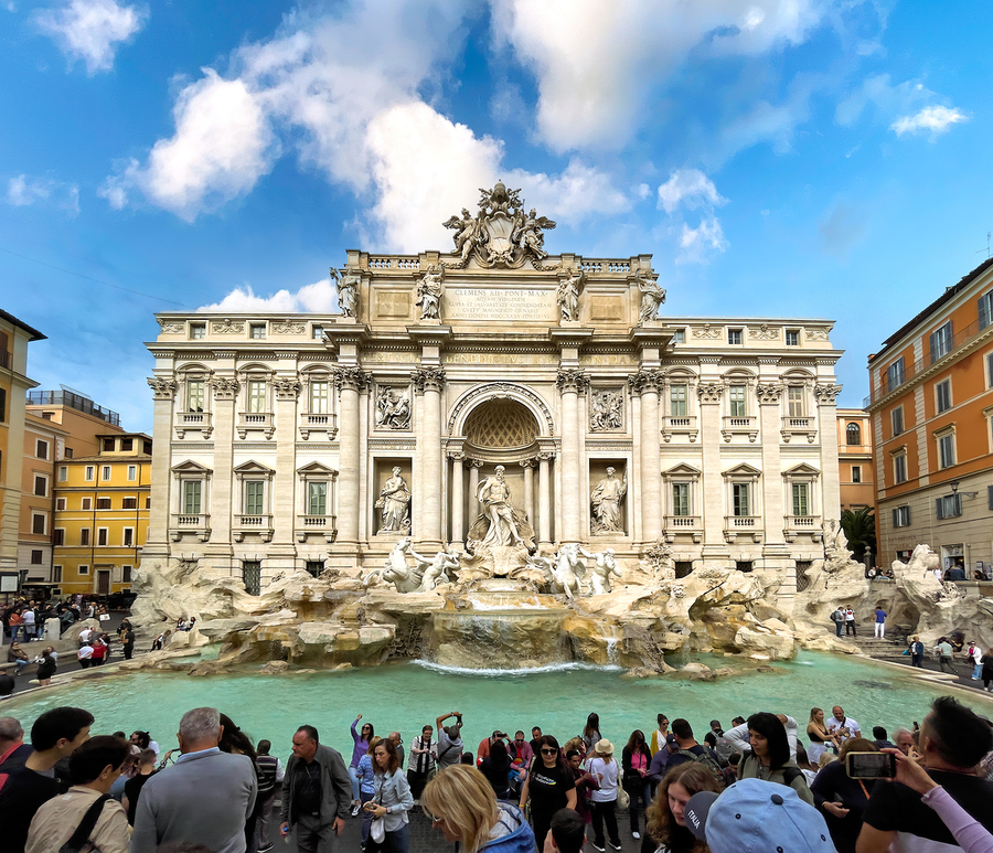 Tourists gather at Trevi fountain in Rome enjoying the view and taking photos with friends in the afternoon light.