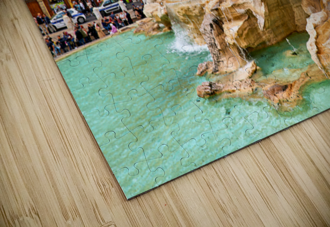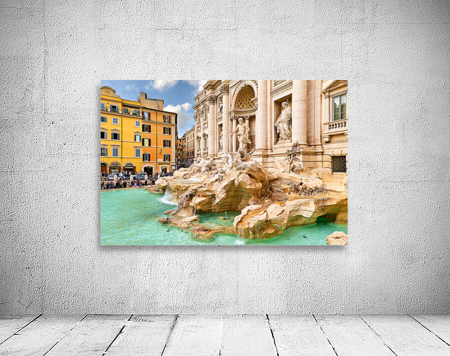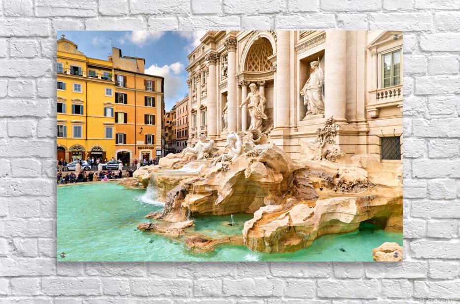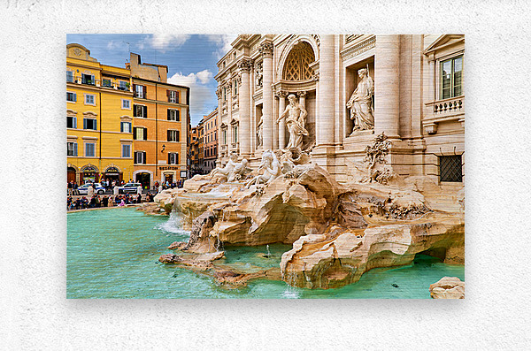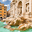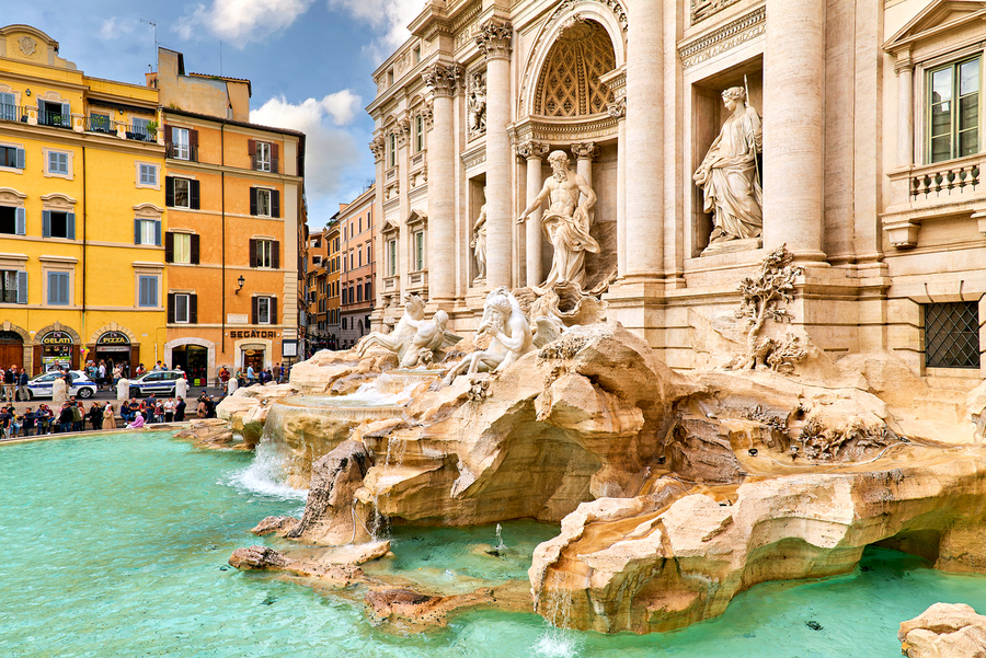 People enjoy the view of Trevi Fountain in Rome while taking photos and tossing coins into the water. The sun shines brightly on the scene.
