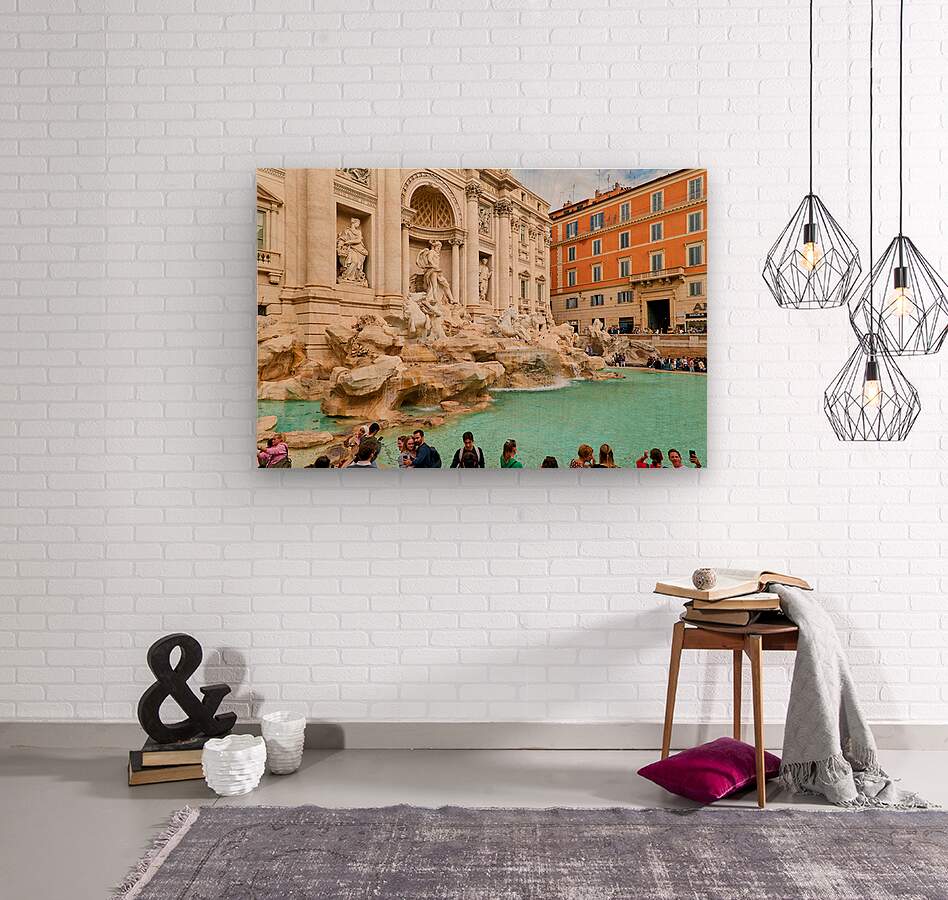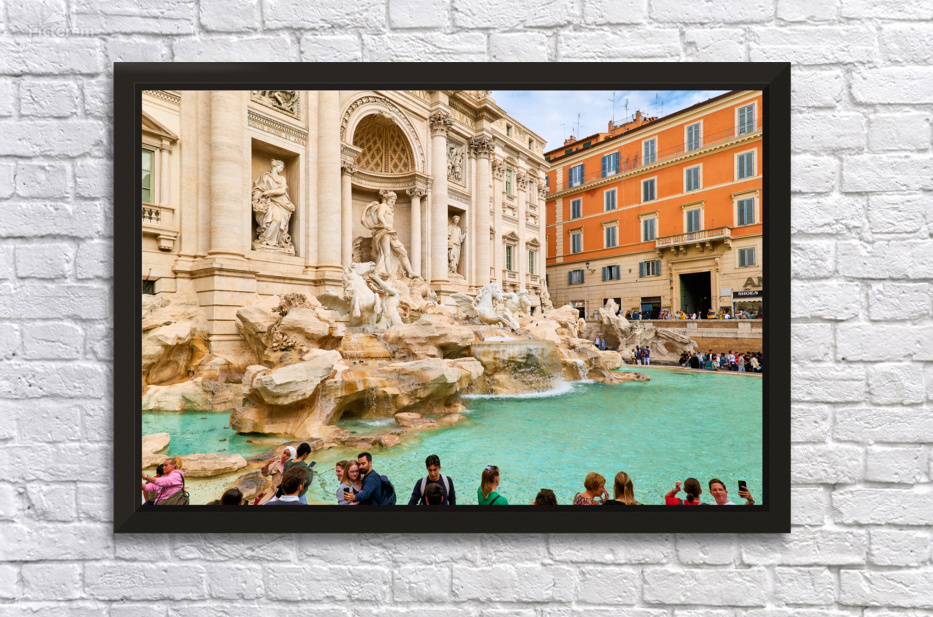 People stand near the Trevi Fountain in Rome. Water flows from the fountain as tourists enjoy the scene and take pictures.