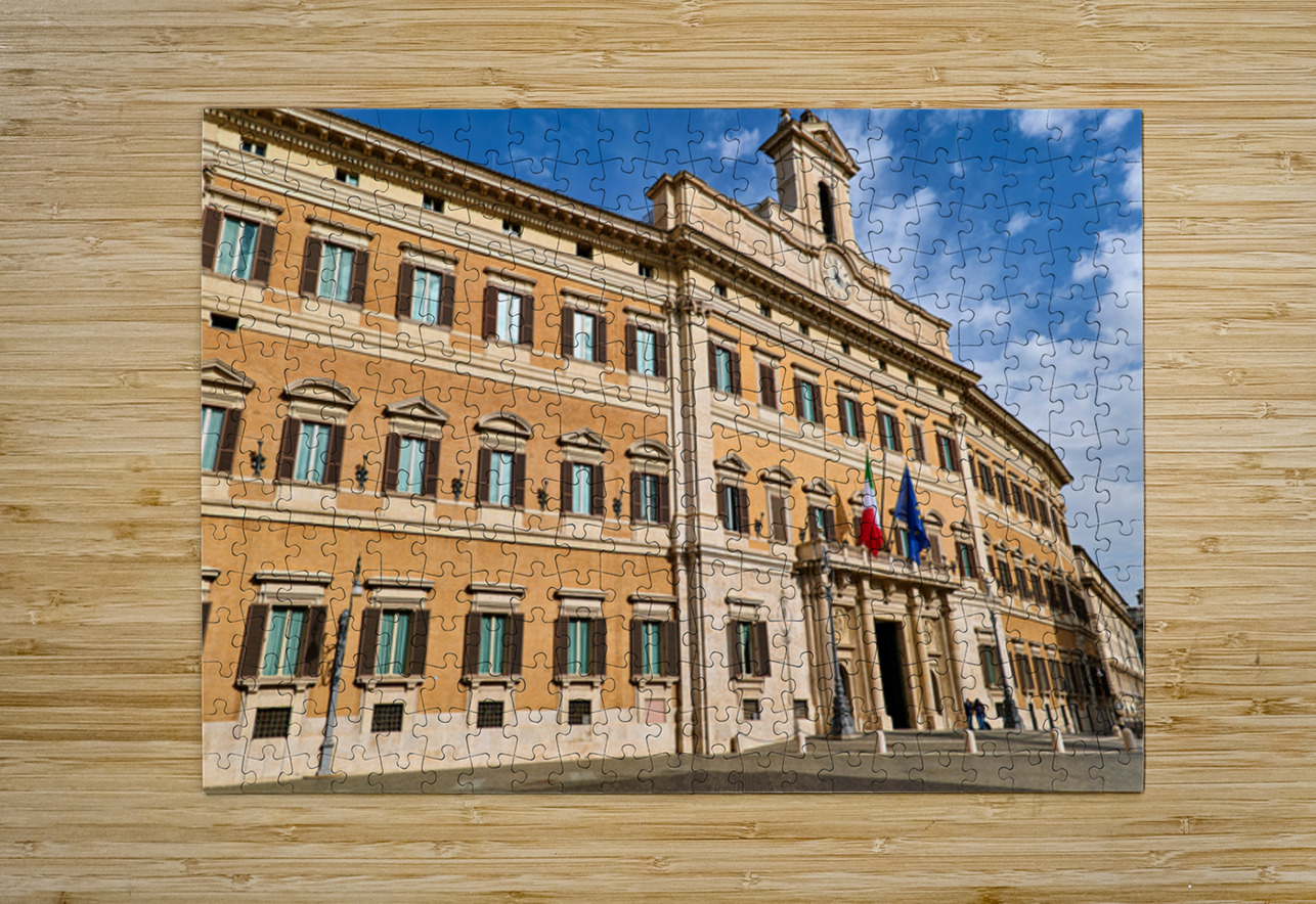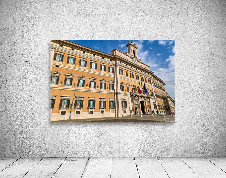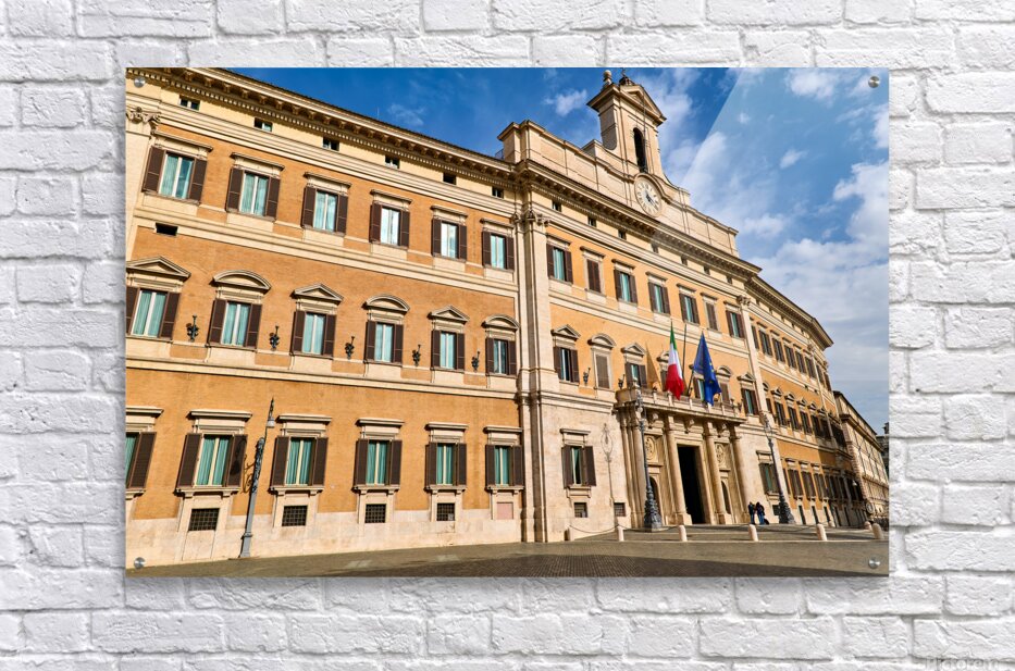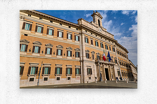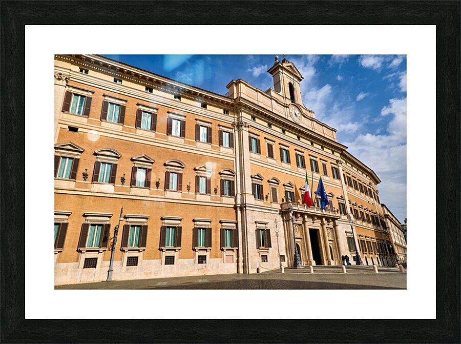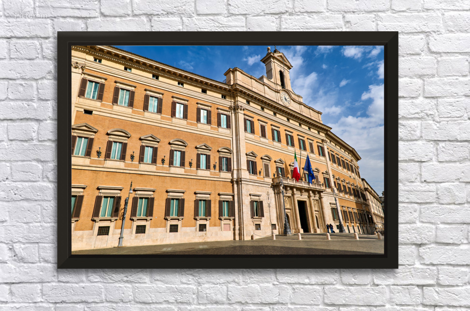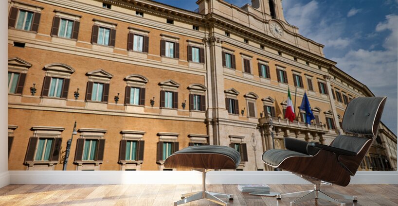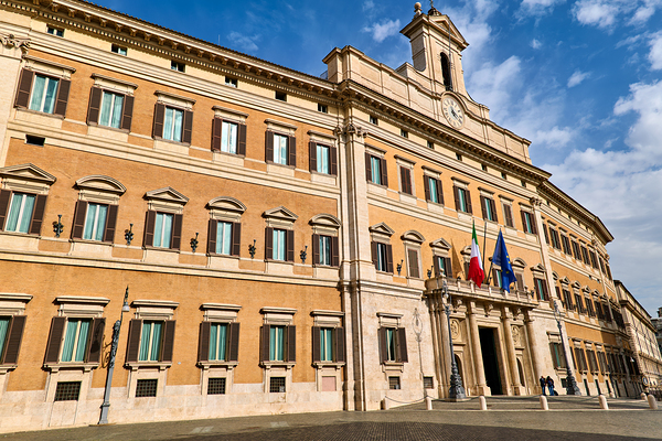 The image shows Palazzo Montecitorio in Rome. People walk near the building. Flags are displayed on the façade.