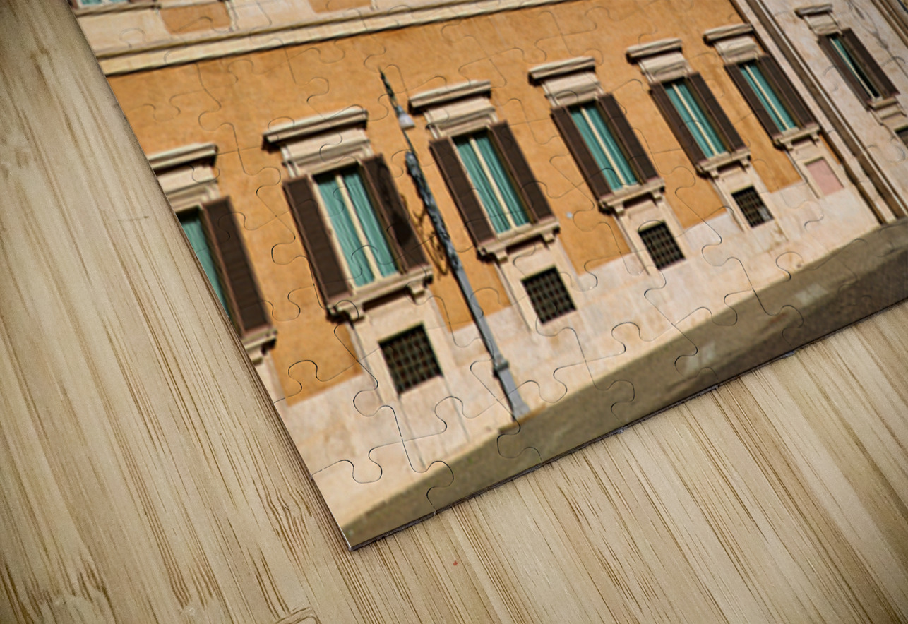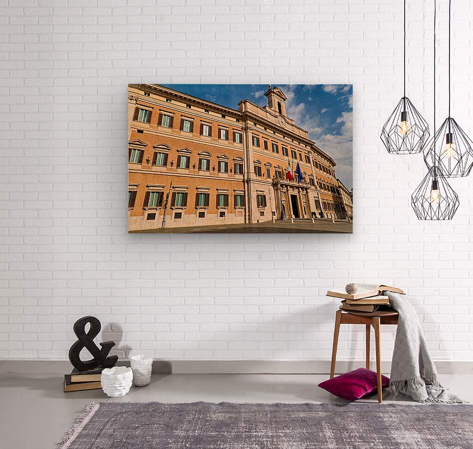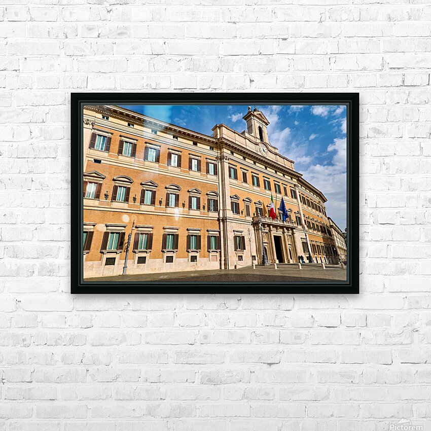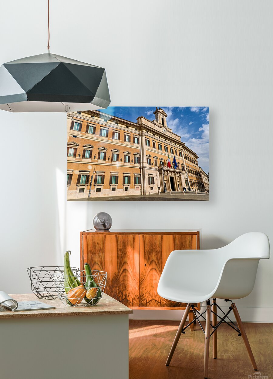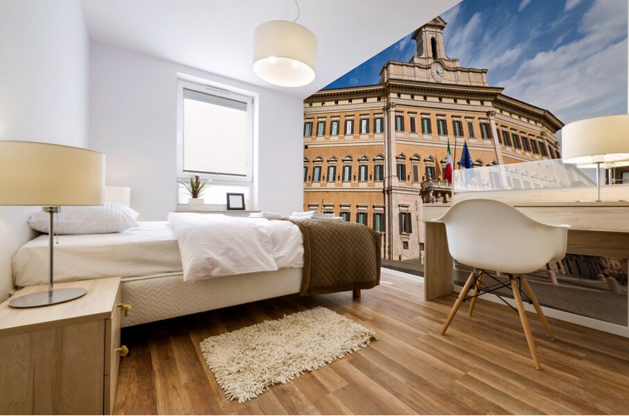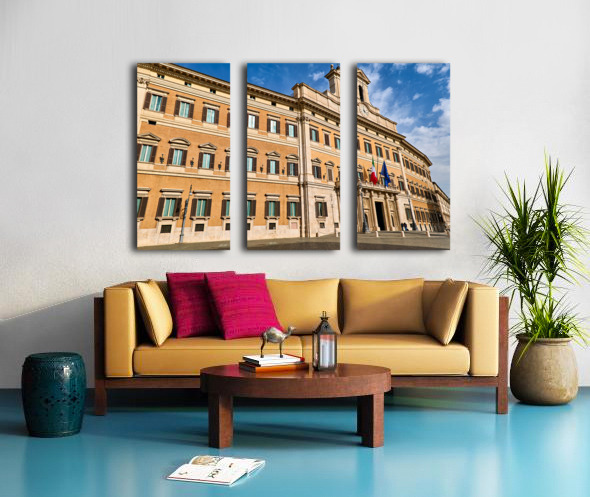 The image shows Palazzo Montecitorio in Rome. People walk near the building. Flags are displayed on the façade.