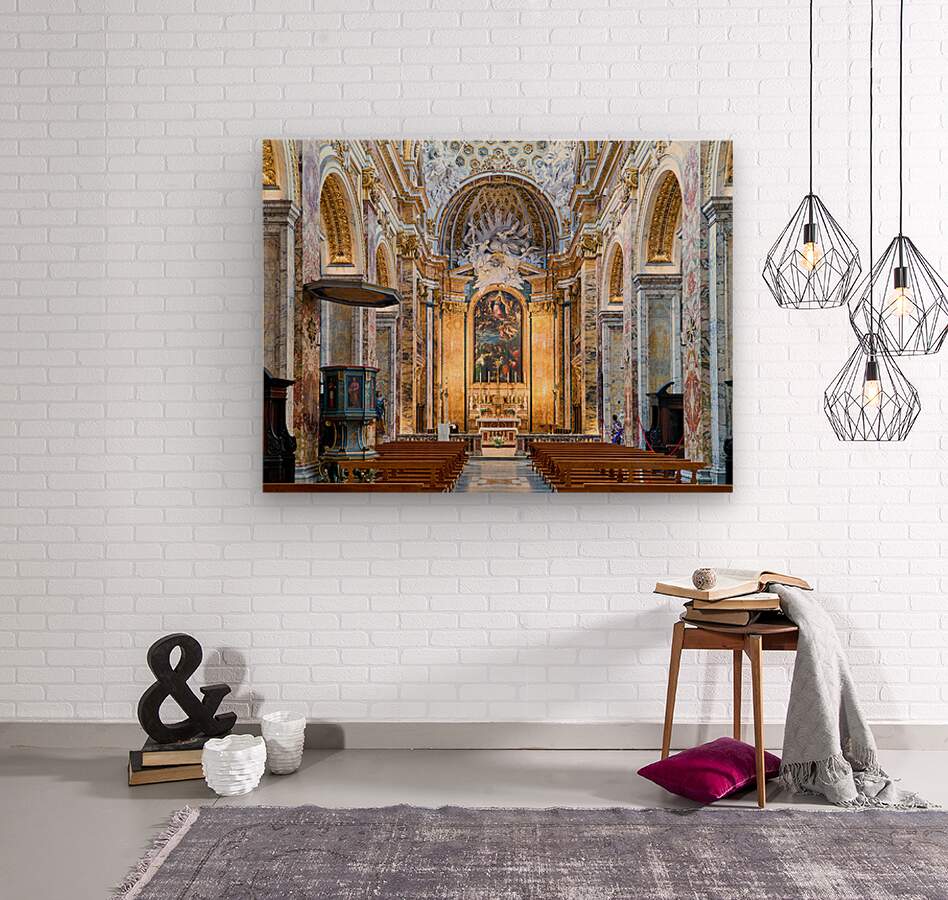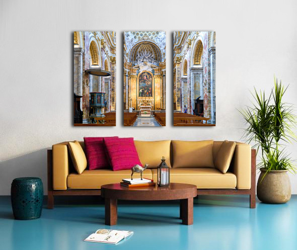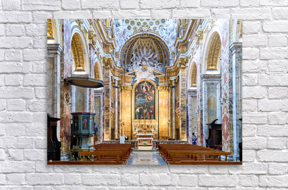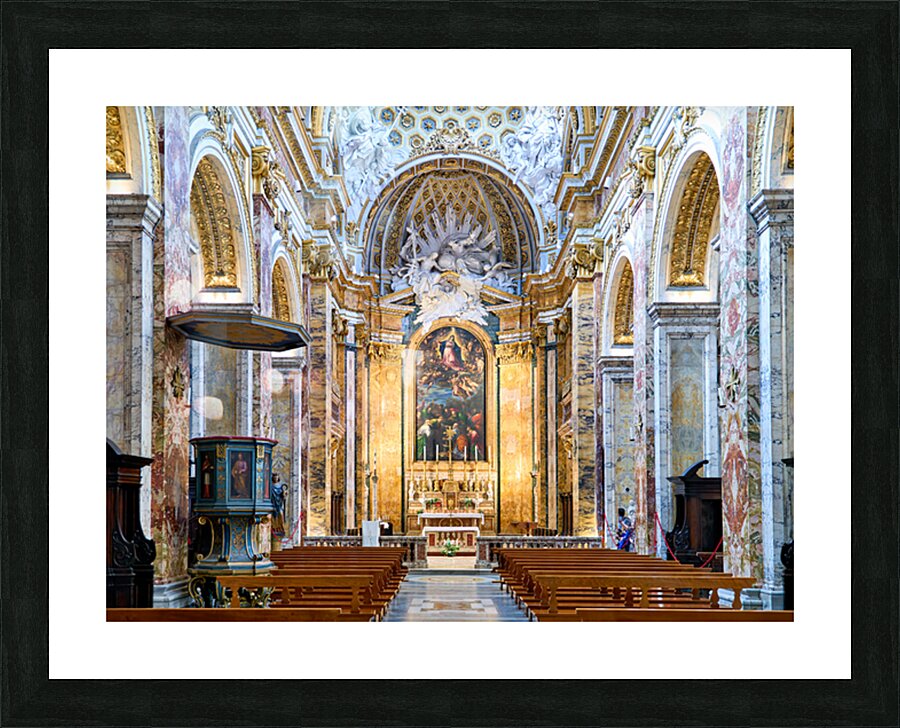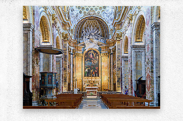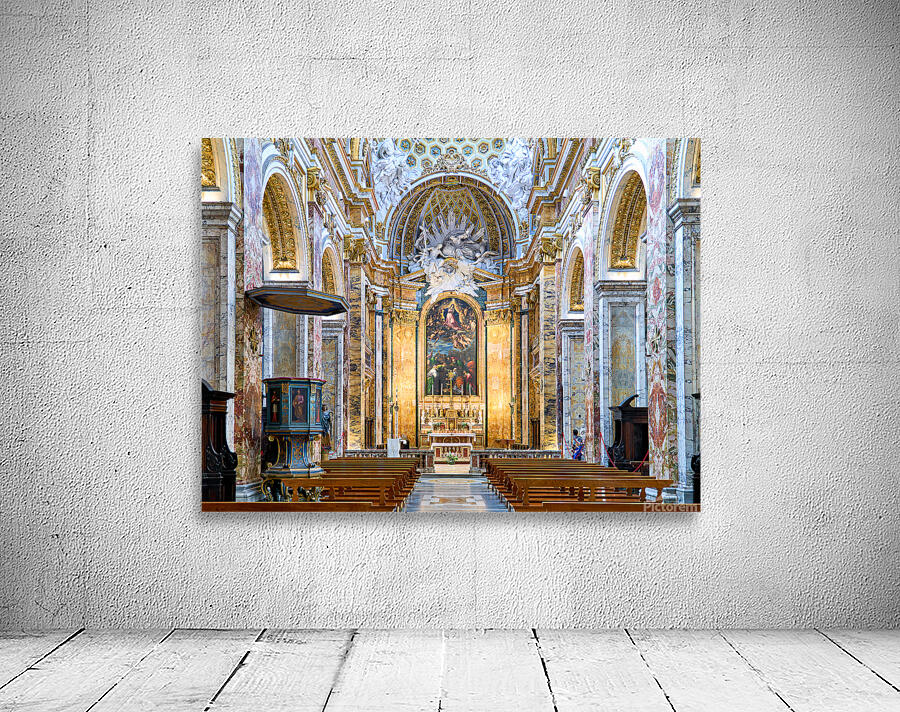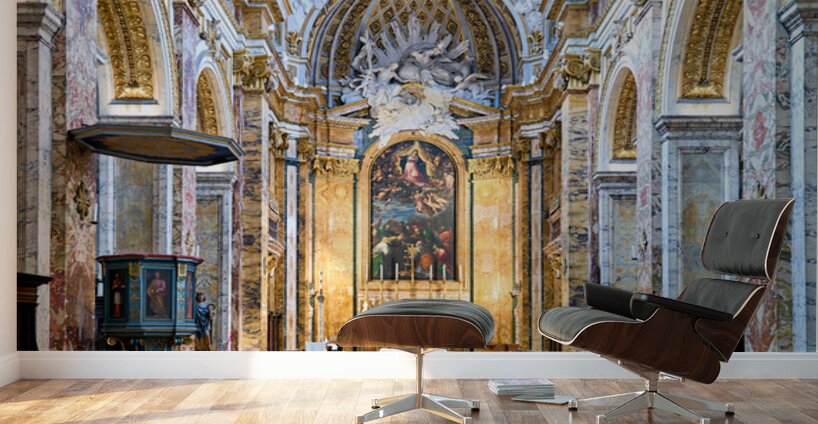 Visitors explore the Church of St. Louis of the French in Rome. They observe the detailed architecture and artwork inside the church.