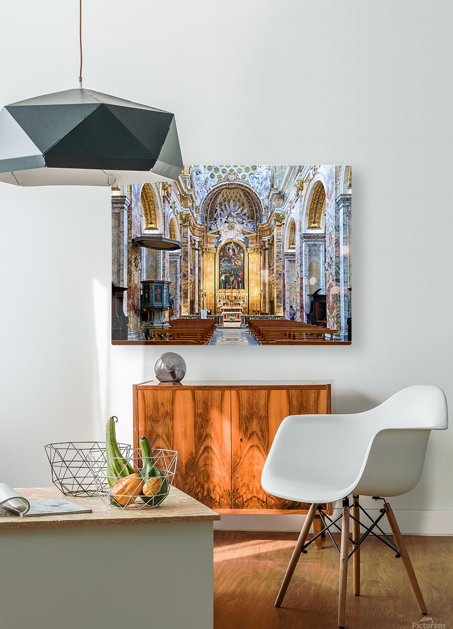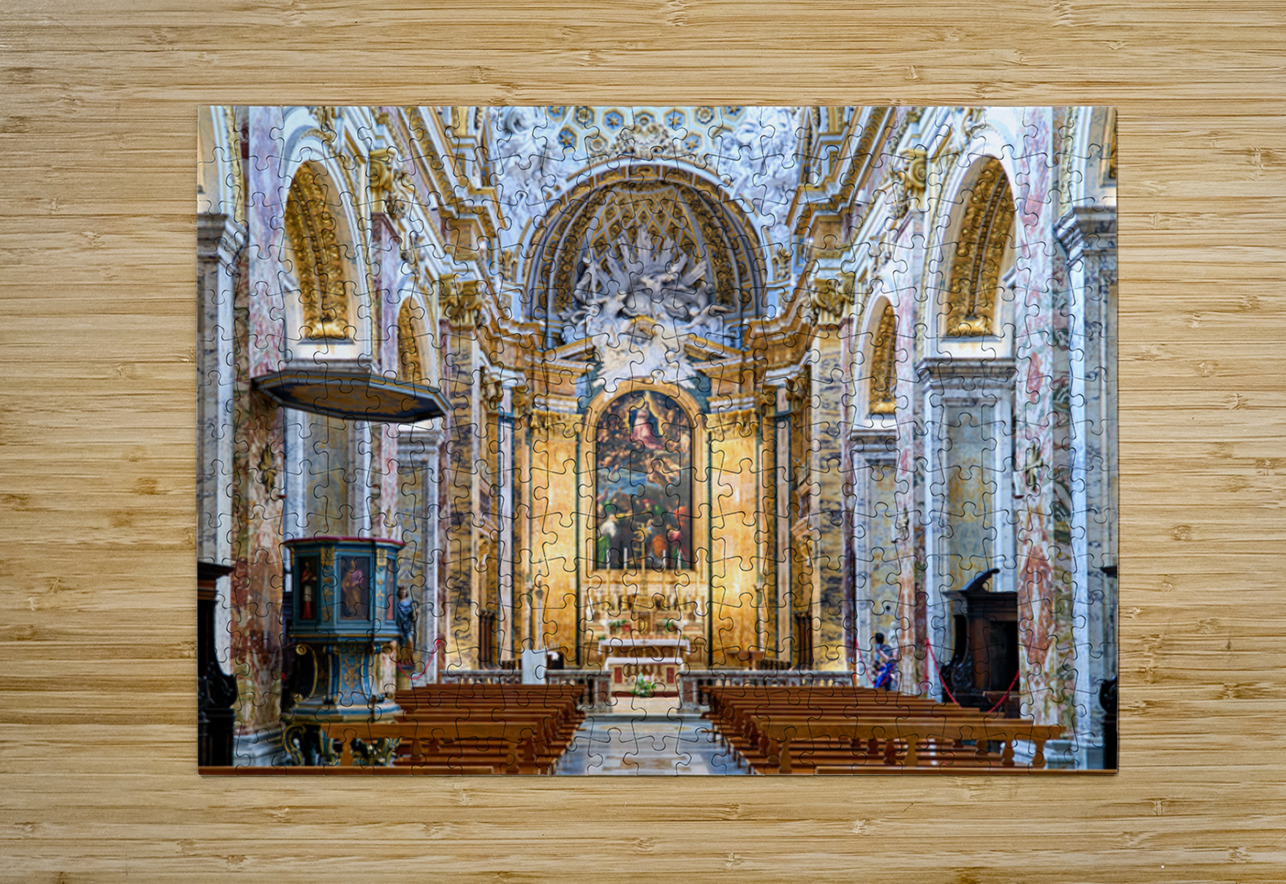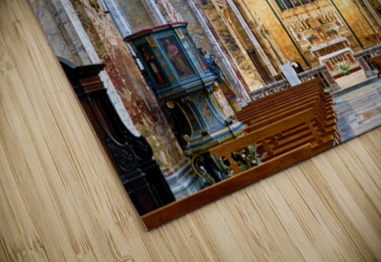 Visitors explore the Church of St. Louis of the French in Rome. They observe the detailed architecture and artwork inside the church.