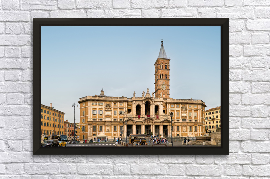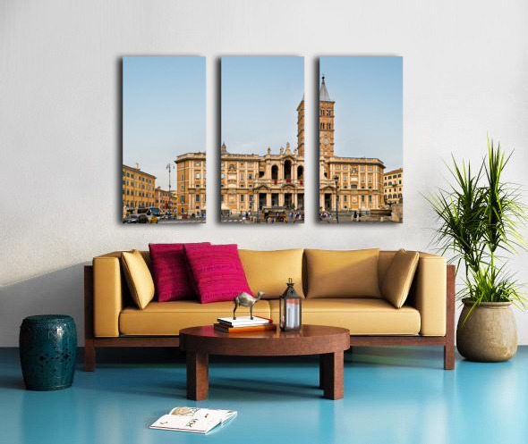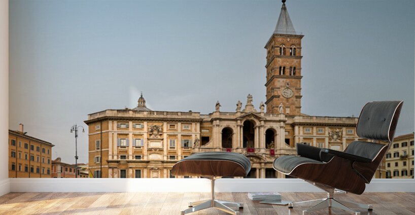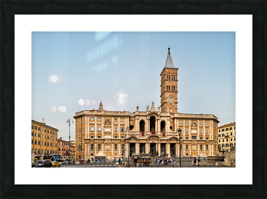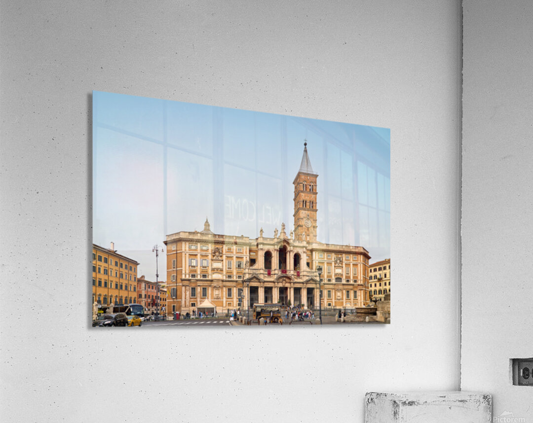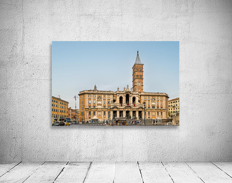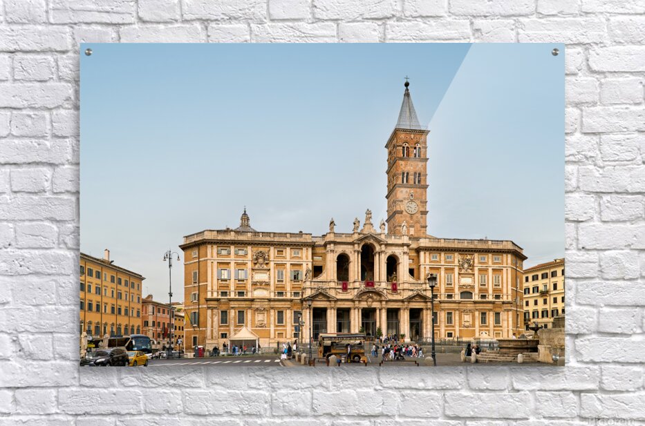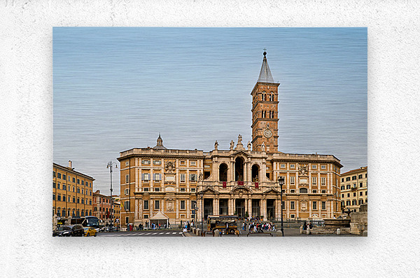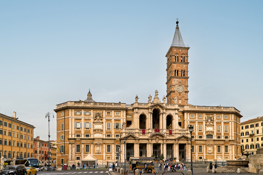 People walk near the Basilica of Saint Mary Major in Rome Italy. The sun shines on the historic building and the surrounding area.