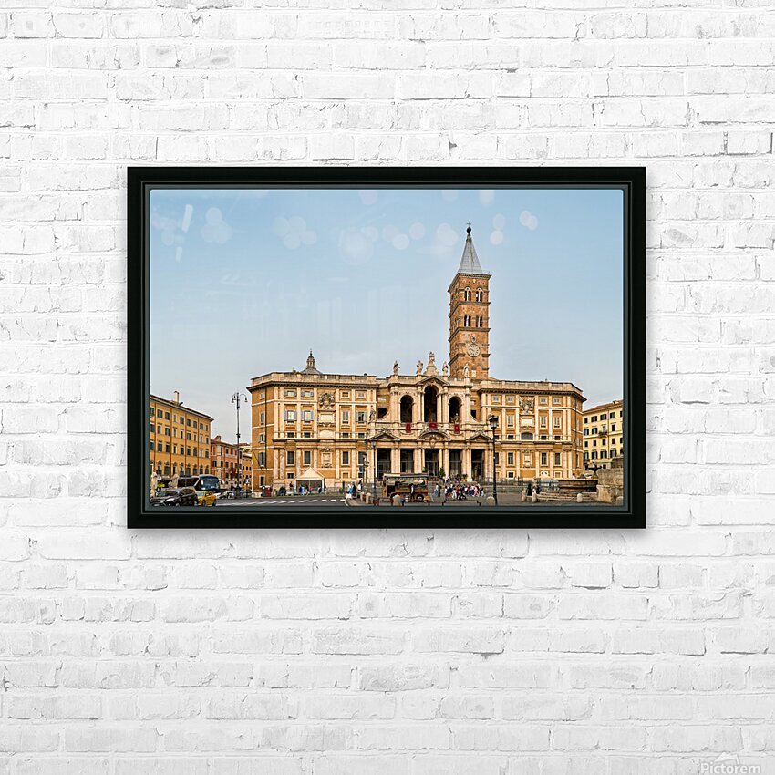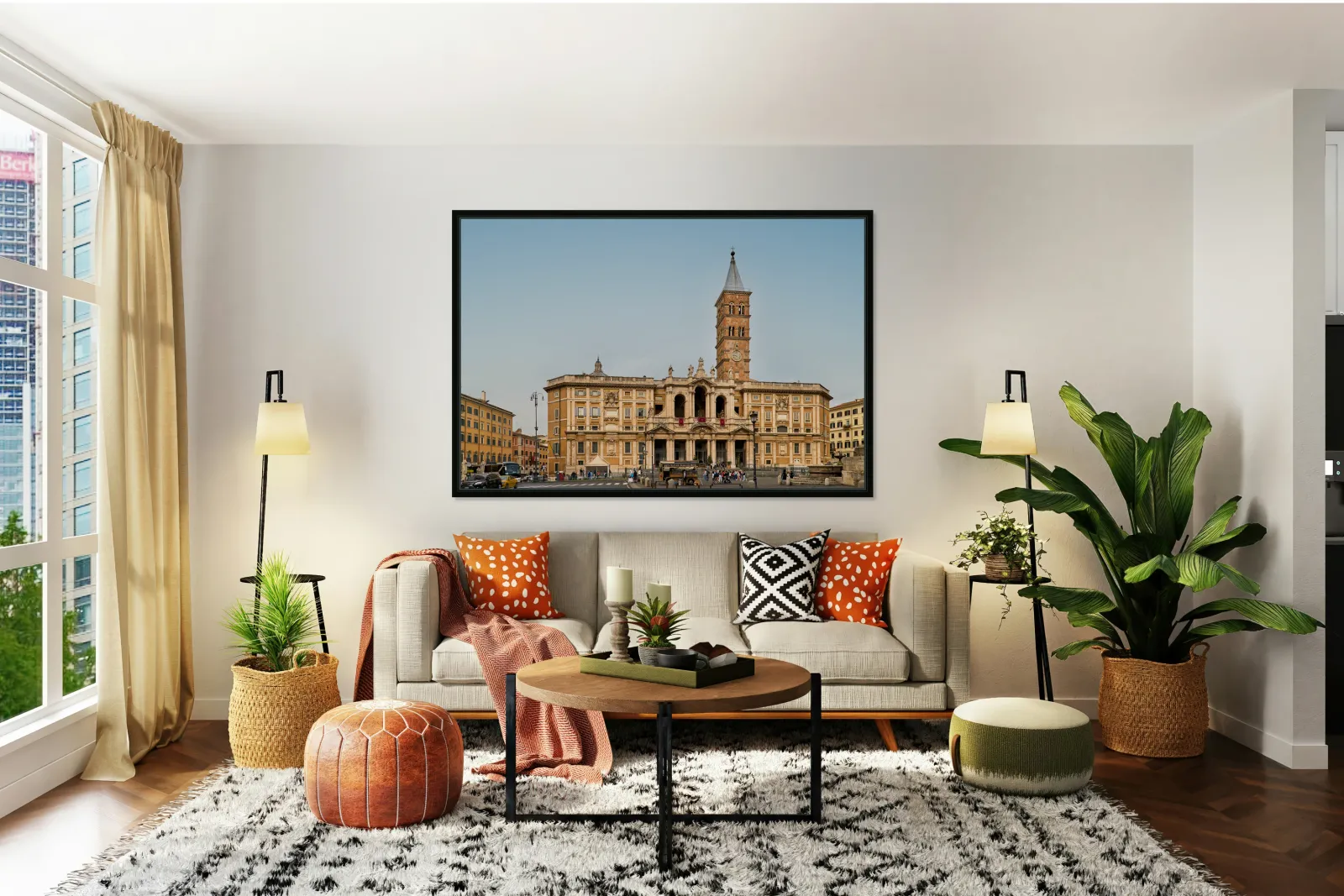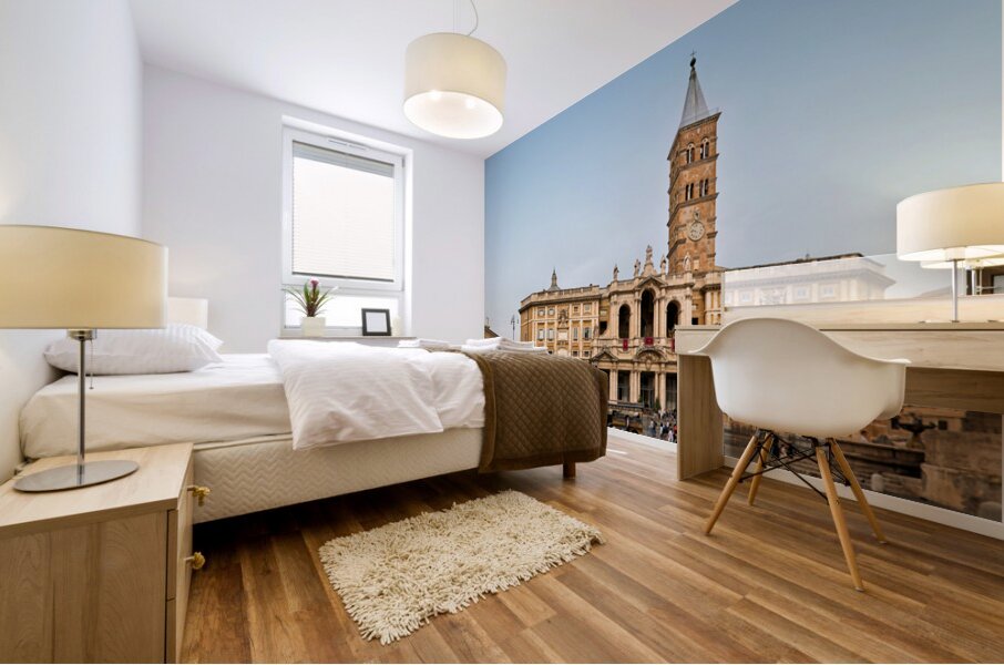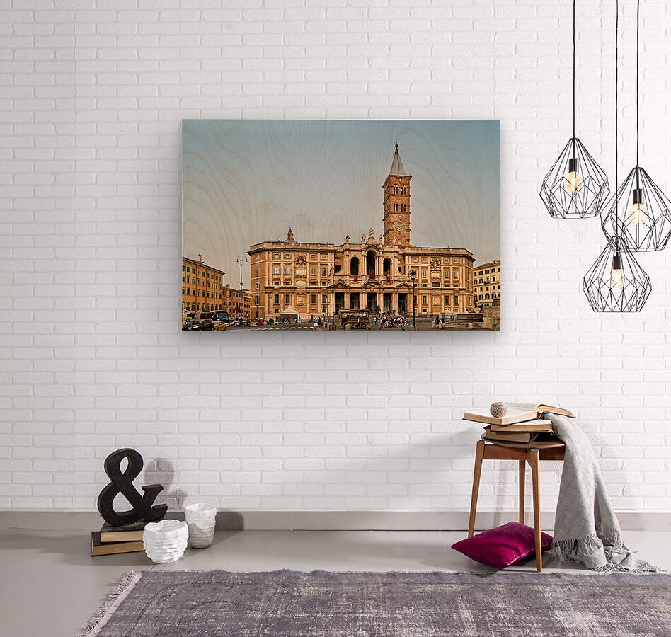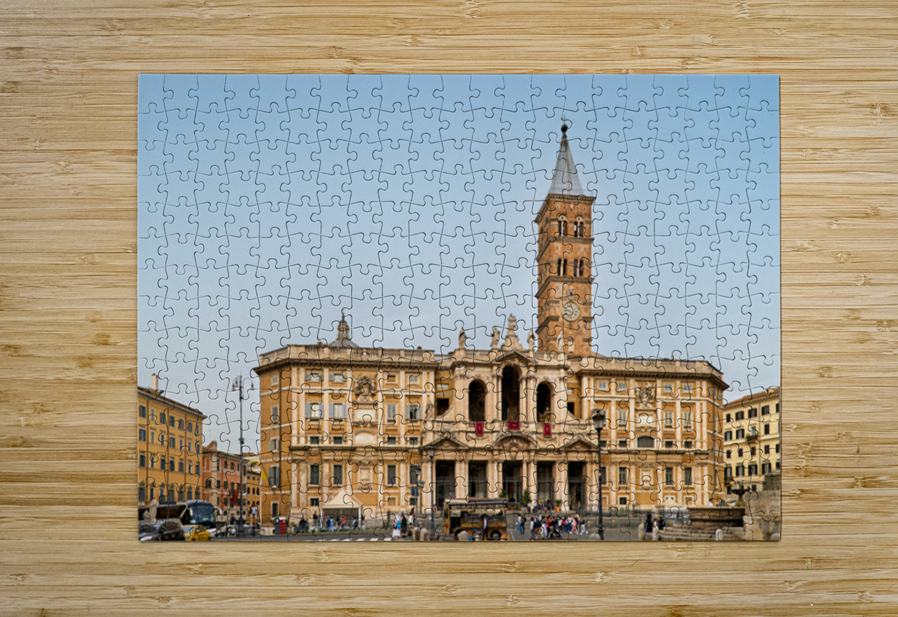 People walk near the Basilica of Saint Mary Major in Rome Italy. The sun shines on the historic building and the surrounding area.