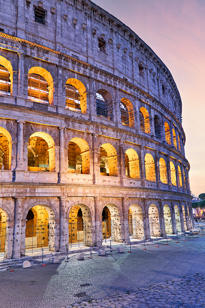 Visitors observe the Colosseum as evening approaches highlighting its ancient architecture in Rome. A historic site draws crowds at dusk.