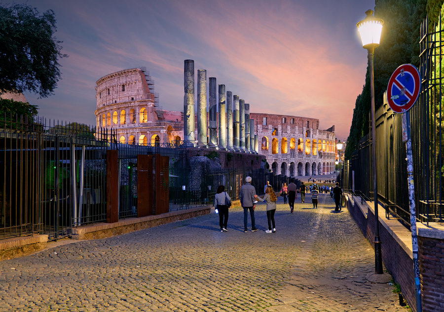 Visitors stroll along Via Sacra while enjoying views of the Colosseum in Rome Italy during the evening hours.