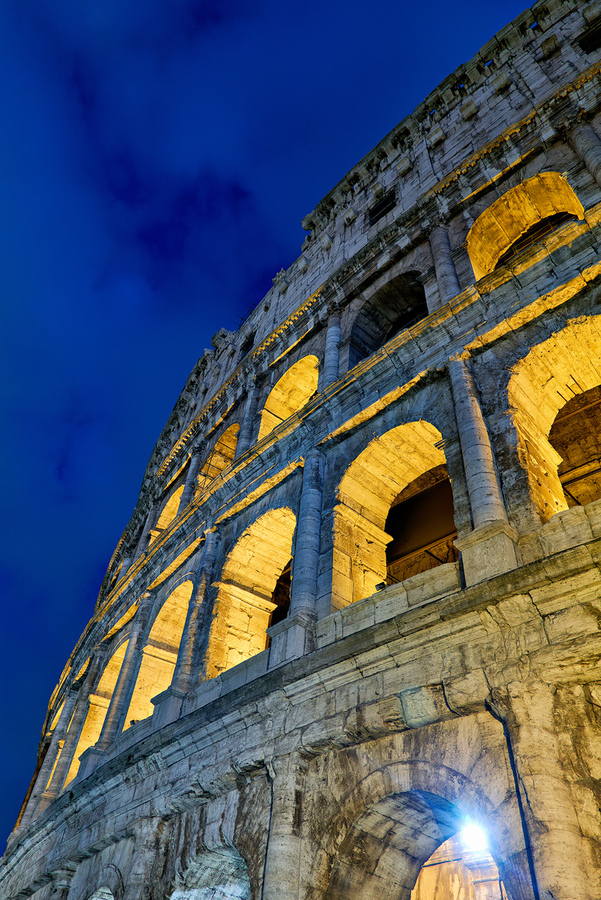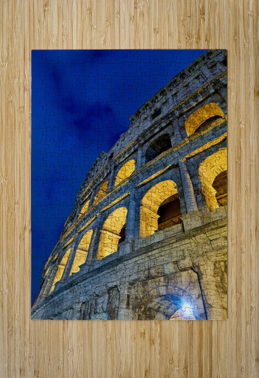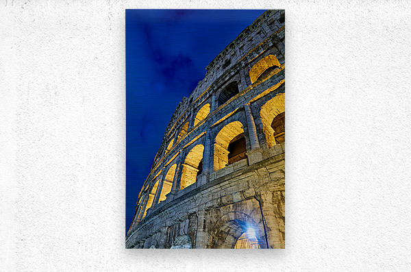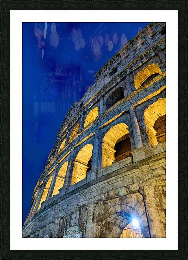 Colosseum stands tall in Rome illuminated at night. Visitors admire the ancient architecture. The atmosphere is lively and filled with history.