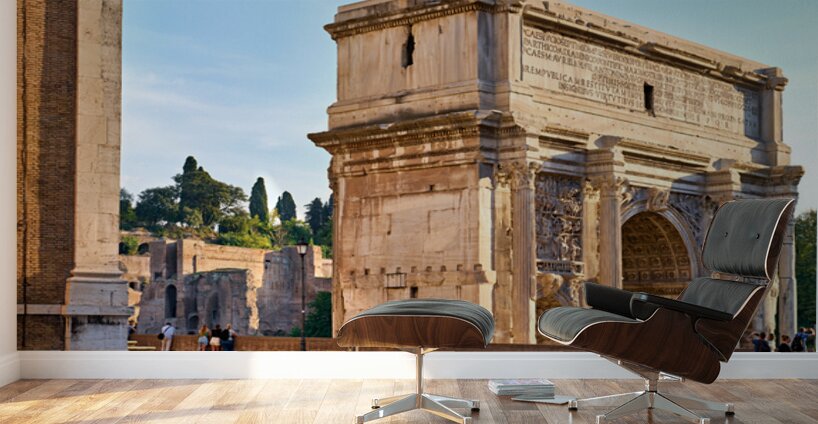 Visitors walk around the Arch of Septimus Severus in the Roman Forum. This historic structure shows ancient architecture in Rome.
