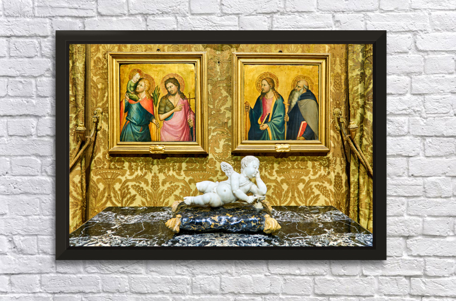 Various artworks are displayed in Doria Pamphilj Gallery. Paintings hang on the wall and a sculpture is placed on a table.