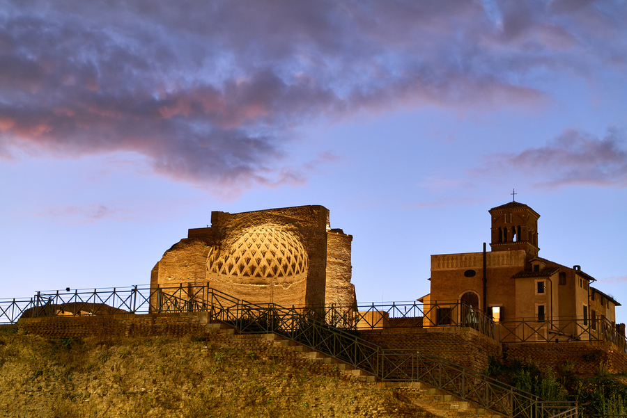 Visitors explore the Temple of Venus and Roma in Rome Lazio during dusk with clouds in the sky creating a dramatic view.