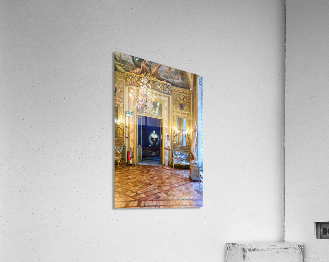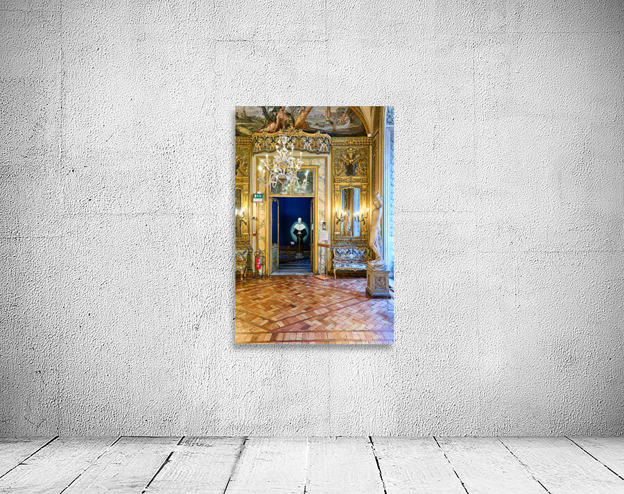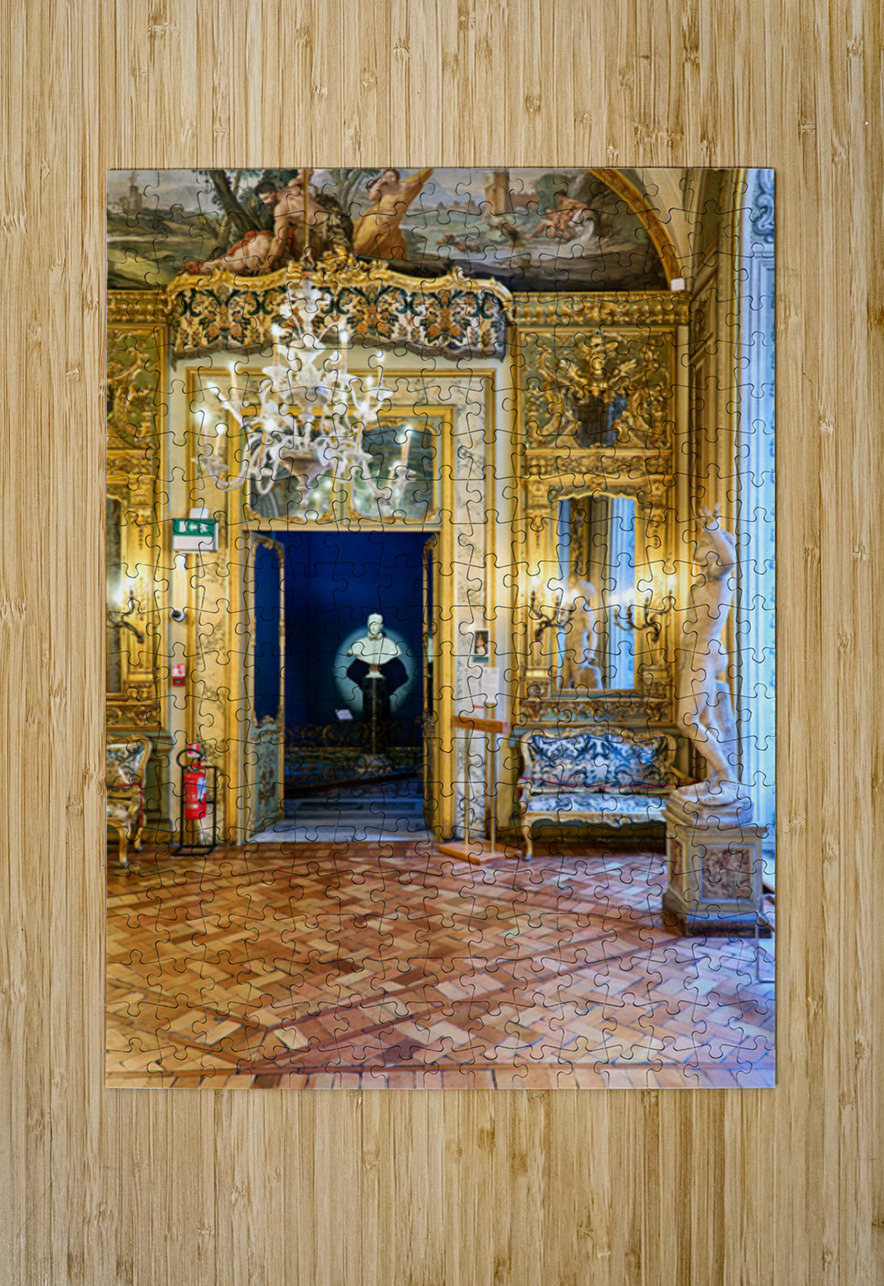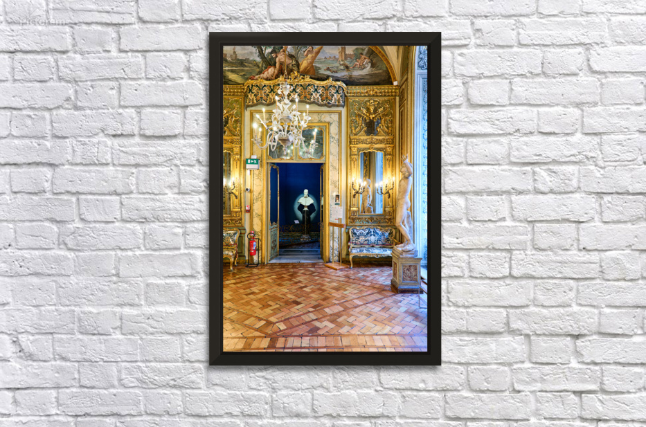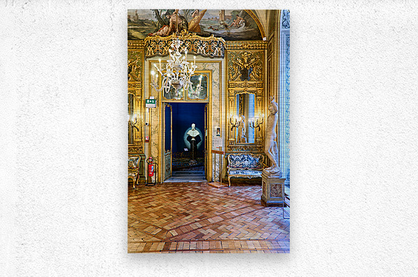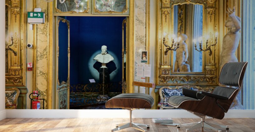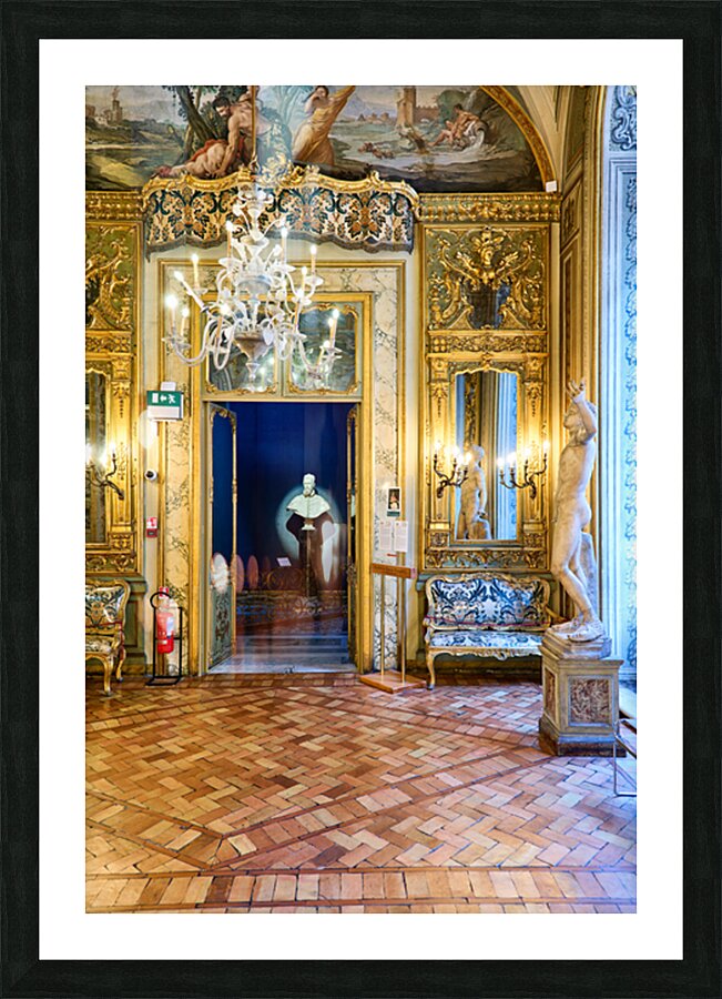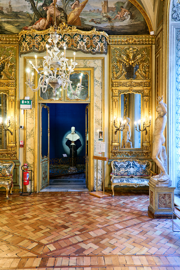 Inside the Doria Pamphilj Gallery in Rome the statue of Pope Innocent X stands in view surrounded by ornate decor and rich history.