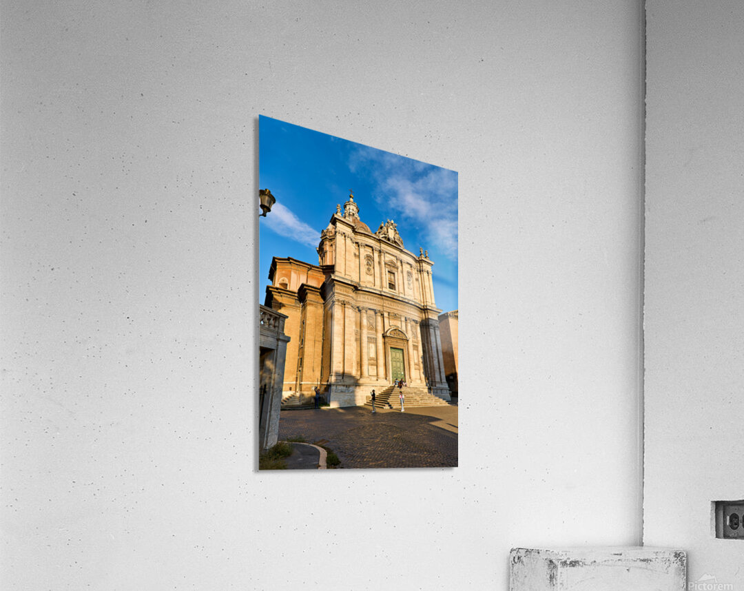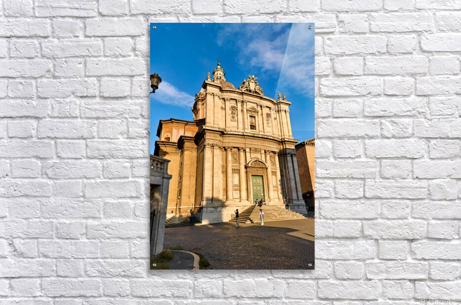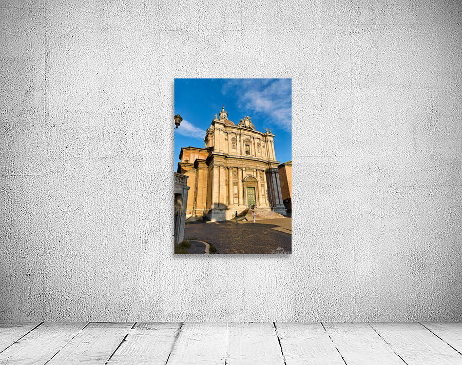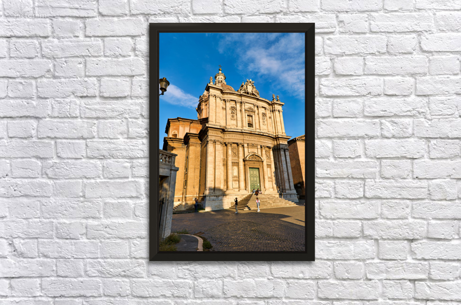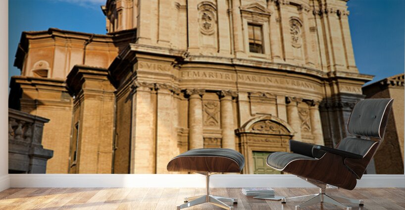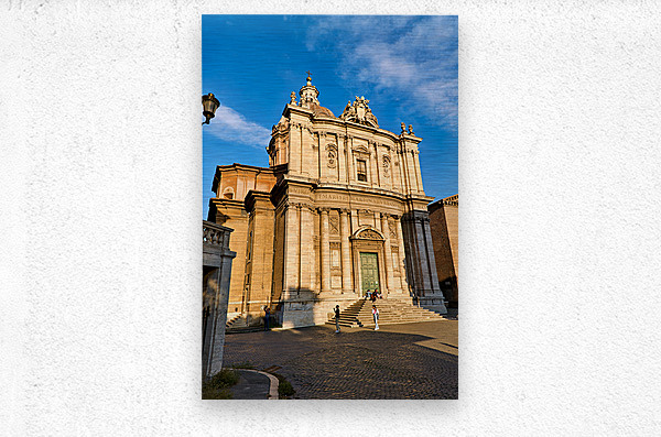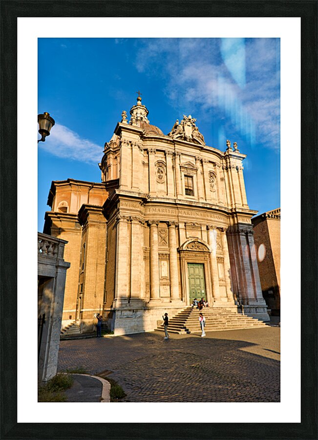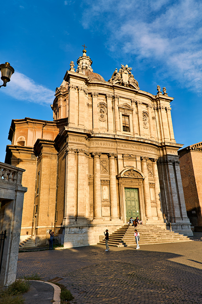 Visitors walk near Santi Luca e Martina church in Rome located between the Roman Forum and Forum of Caesar on a sunny day.