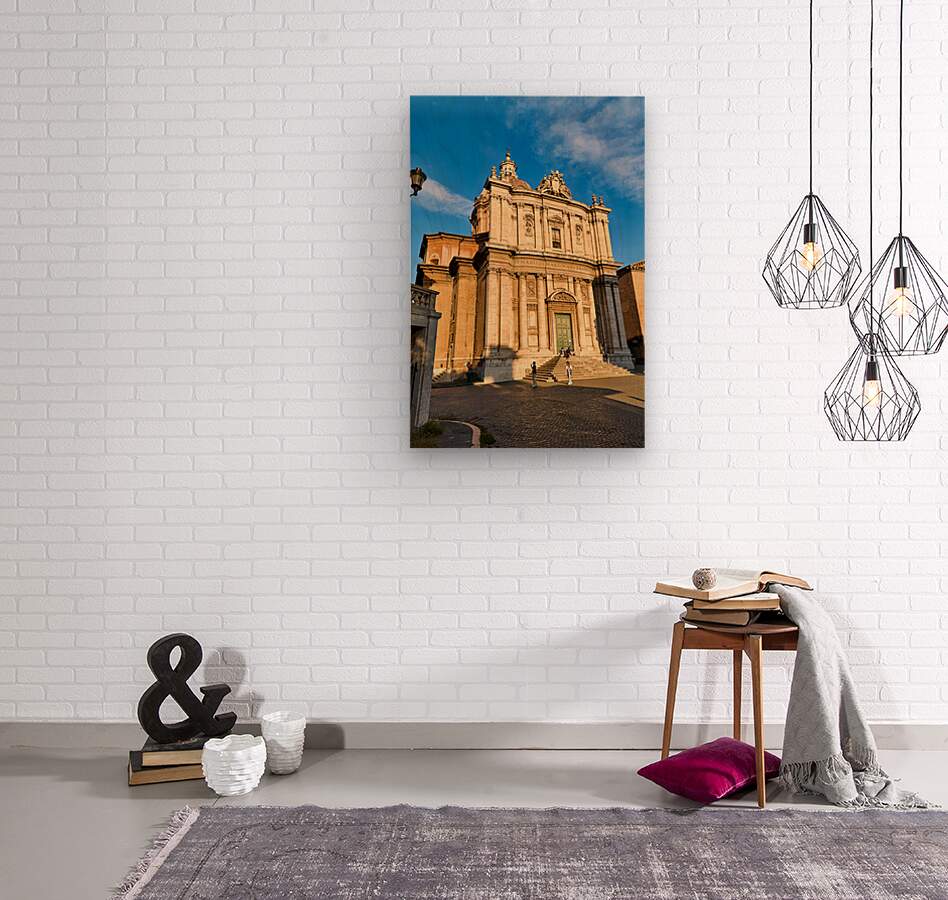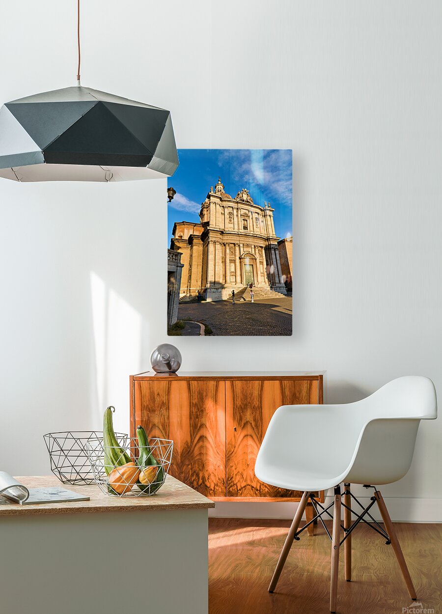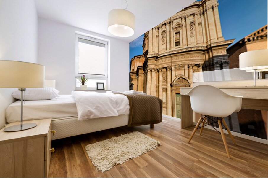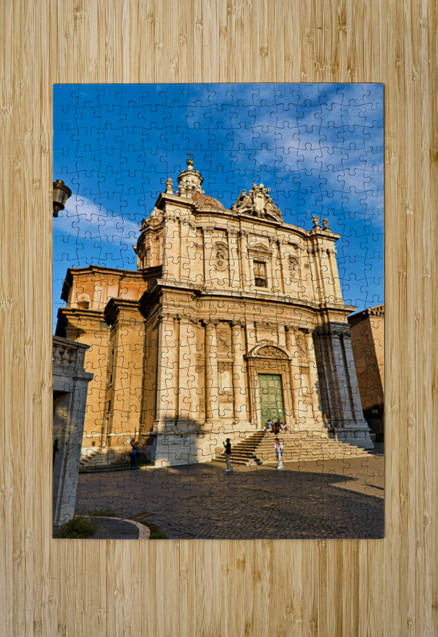 Visitors walk near Santi Luca e Martina church in Rome located between the Roman Forum and Forum of Caesar on a sunny day.