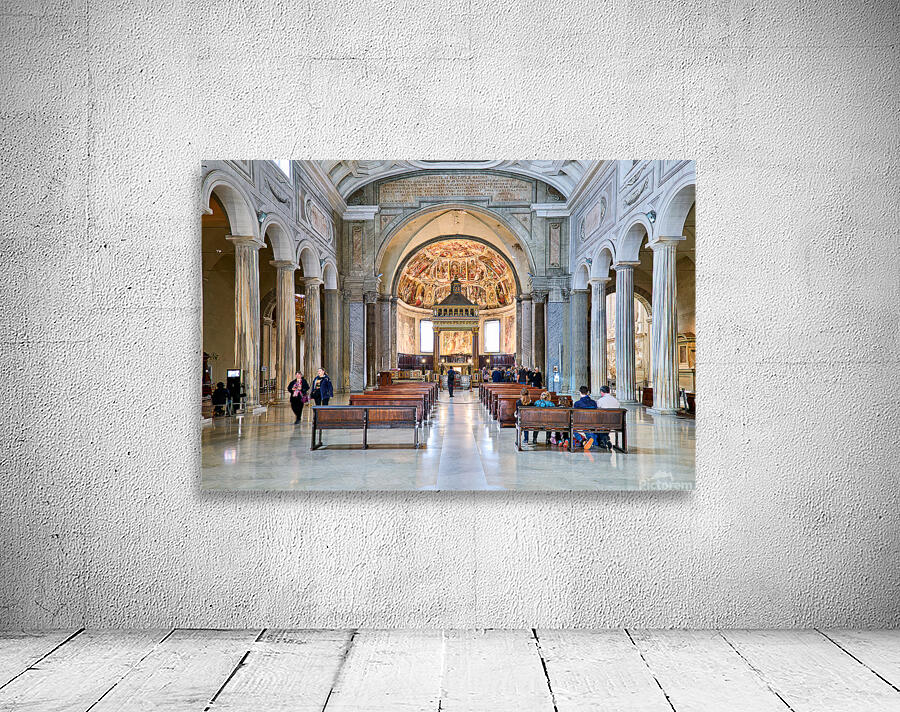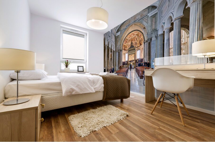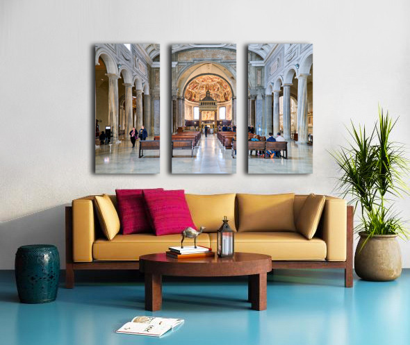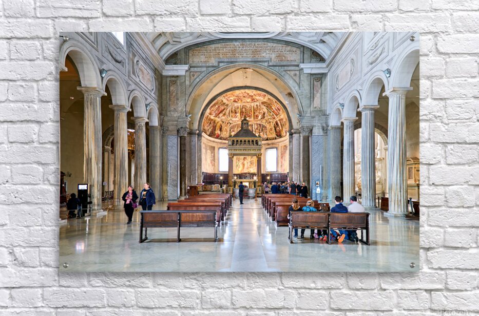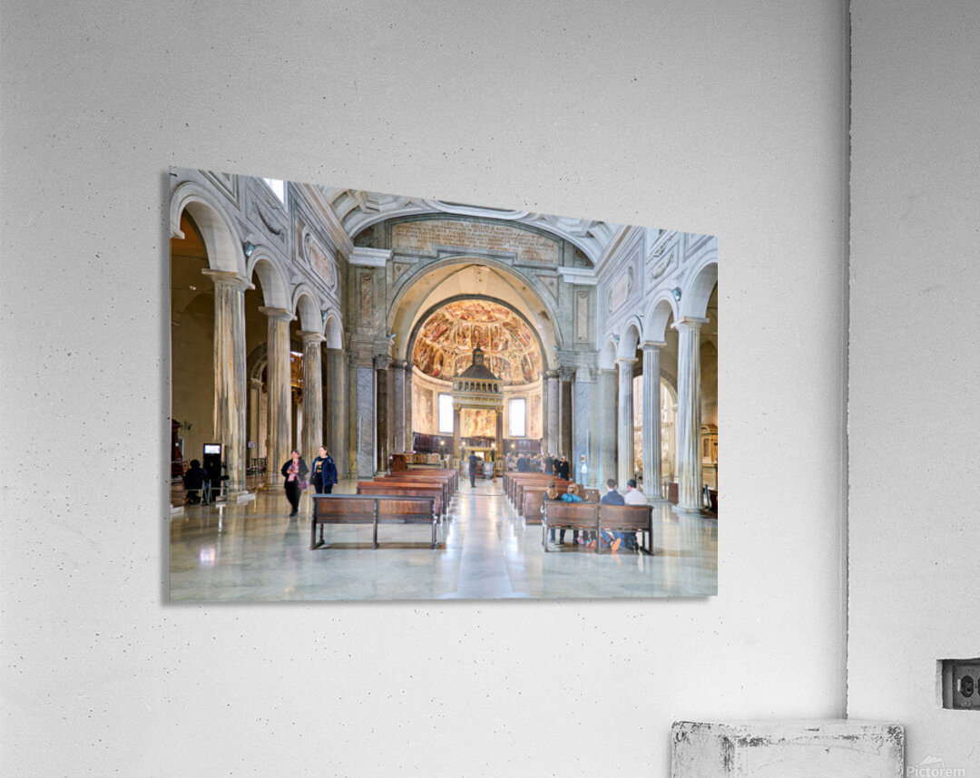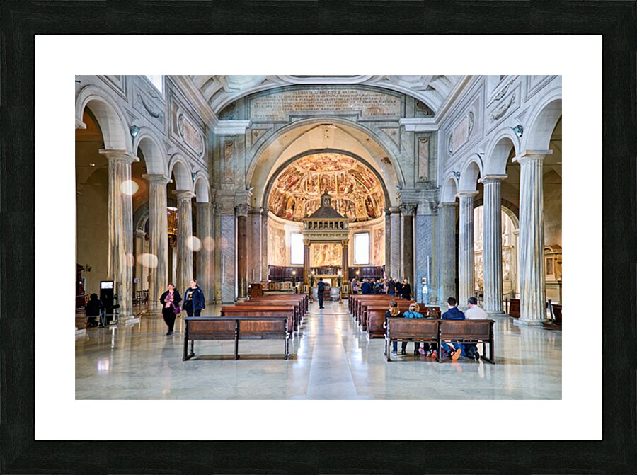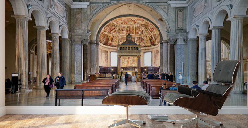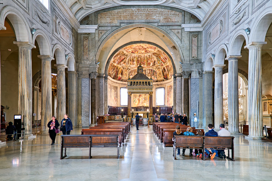 People explore San Pietro in Vincoli church in Rome Italy. Visitors admire the architecture and artwork inside the basilica during daytime.