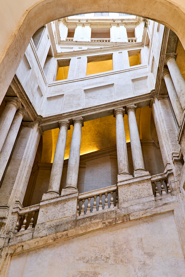 Visitors look up at the stunning staircase in Galleria Nazionale dArte Antica located in Palazzo Barberini Rome Italy.