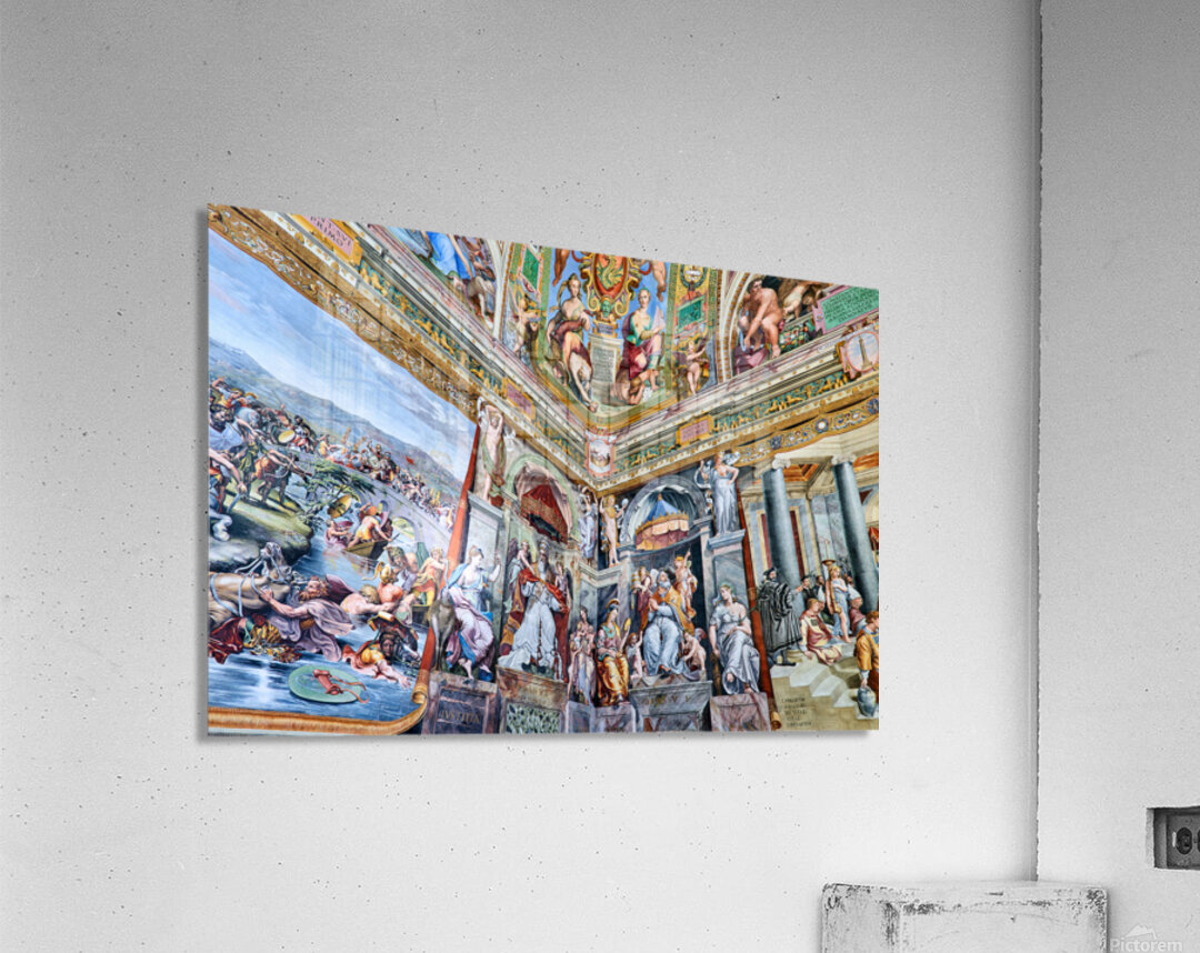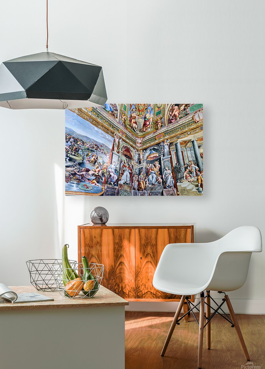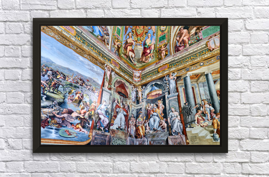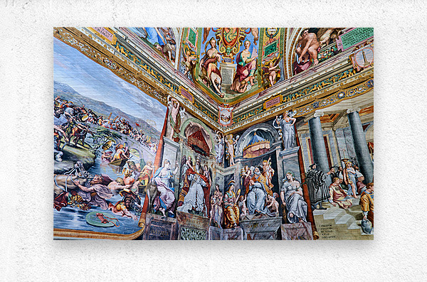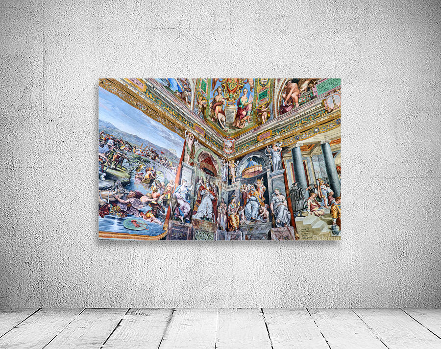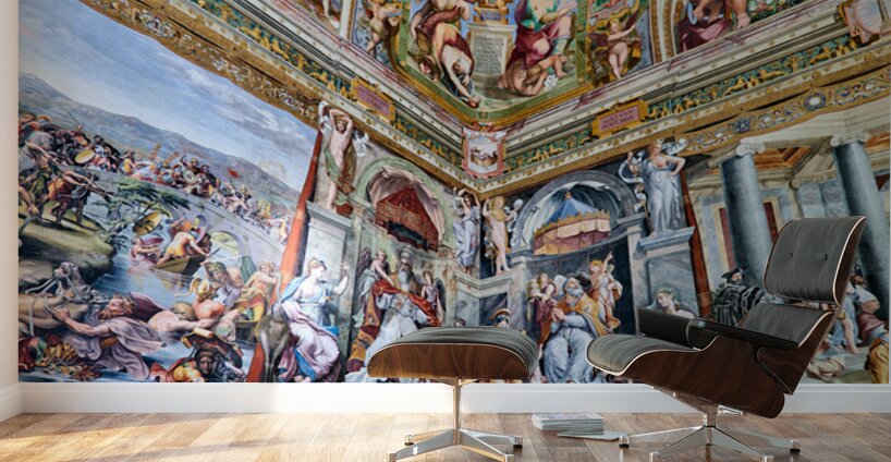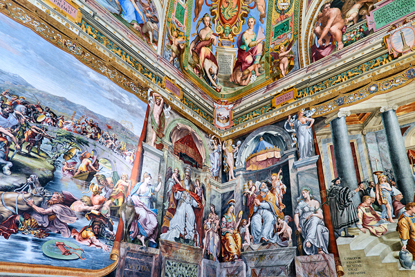Visitors view detailed frescoes by Raphael in the Vatican Museums. The artwork shows various scenes and figures from history and mythology.