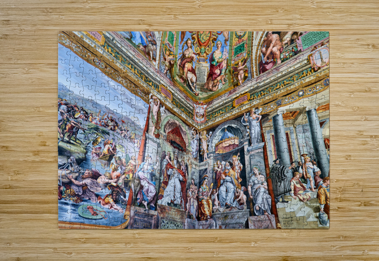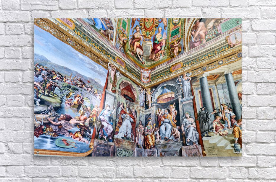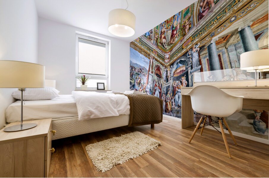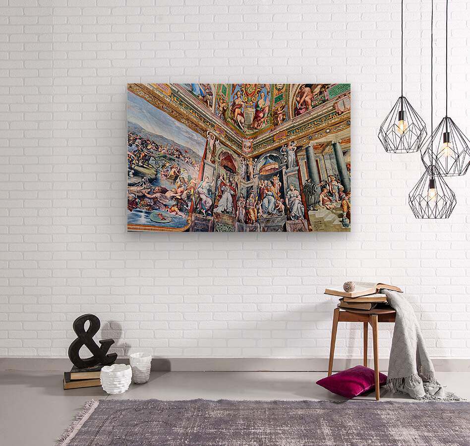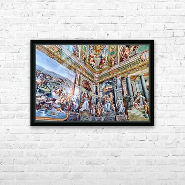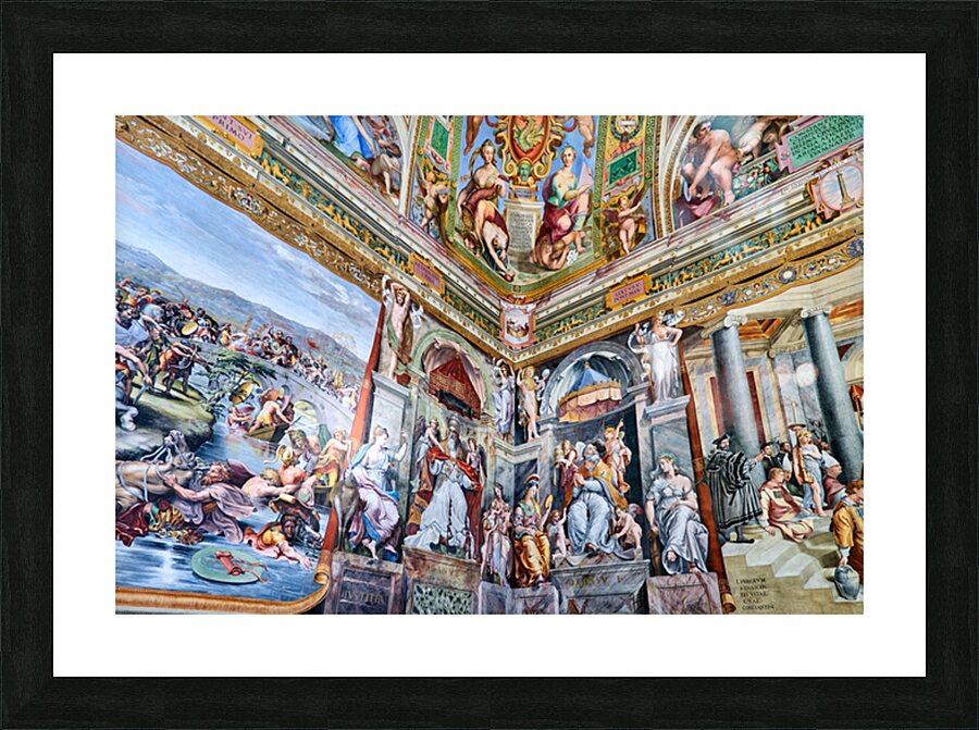 Visitors view detailed frescoes by Raphael in the Vatican Museums. The artwork shows various scenes and figures from history and mythology.