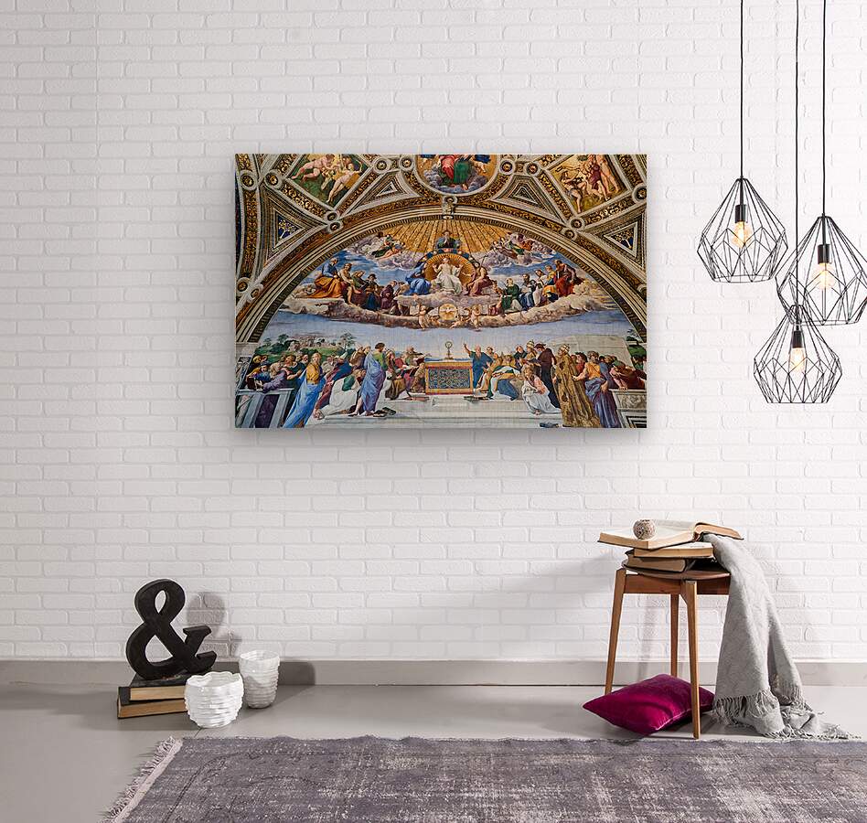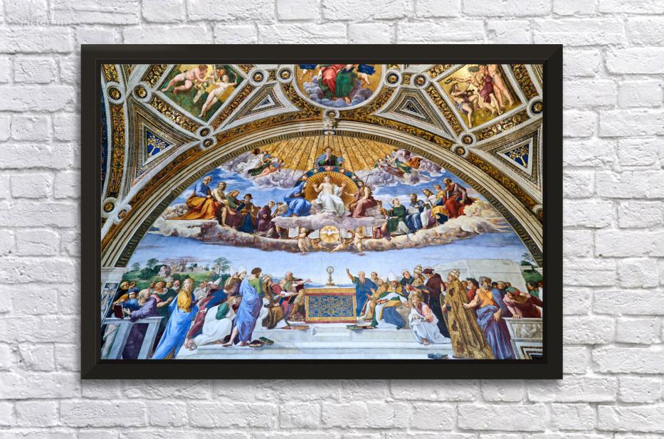 Visitors view frescoes in the Raphael rooms at the Vatican Museums in Vatican City. The art shows figures in detailed scenes.