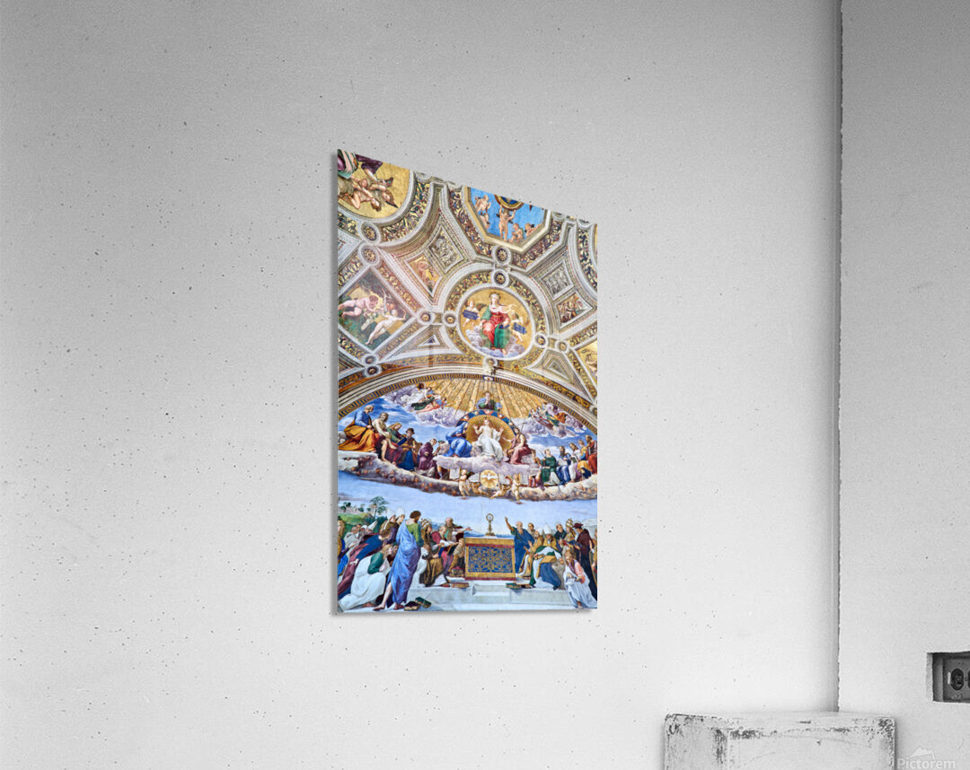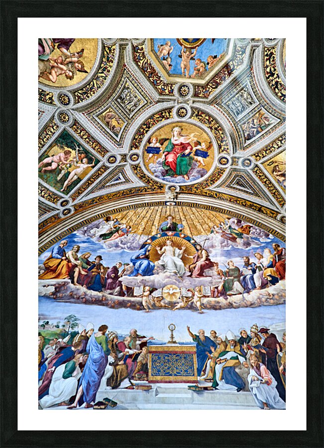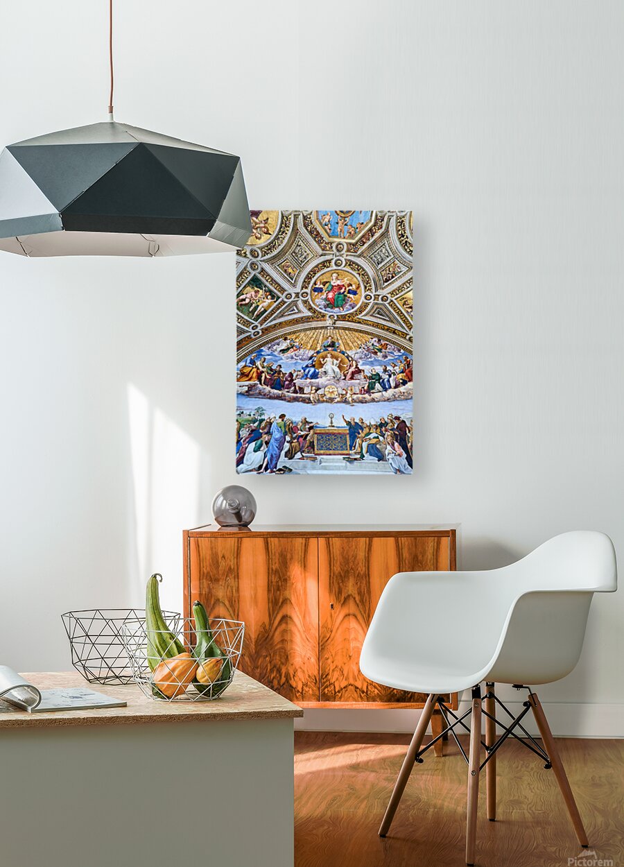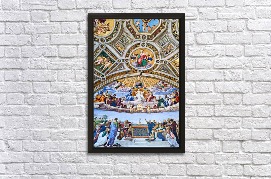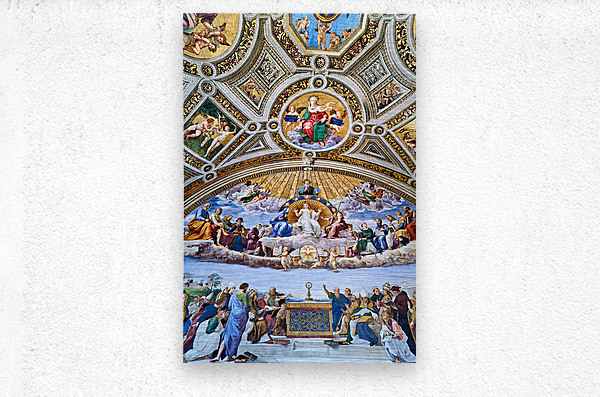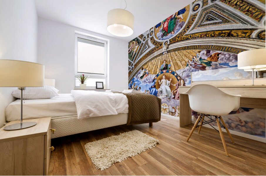 Visitors admire the famous frescoes on the ceilings in the Raphael rooms at the Vatican Museums in Vatican City Rome during a cultural tour.
