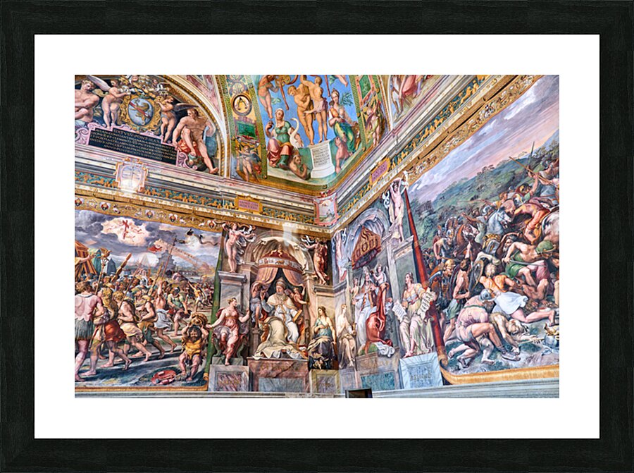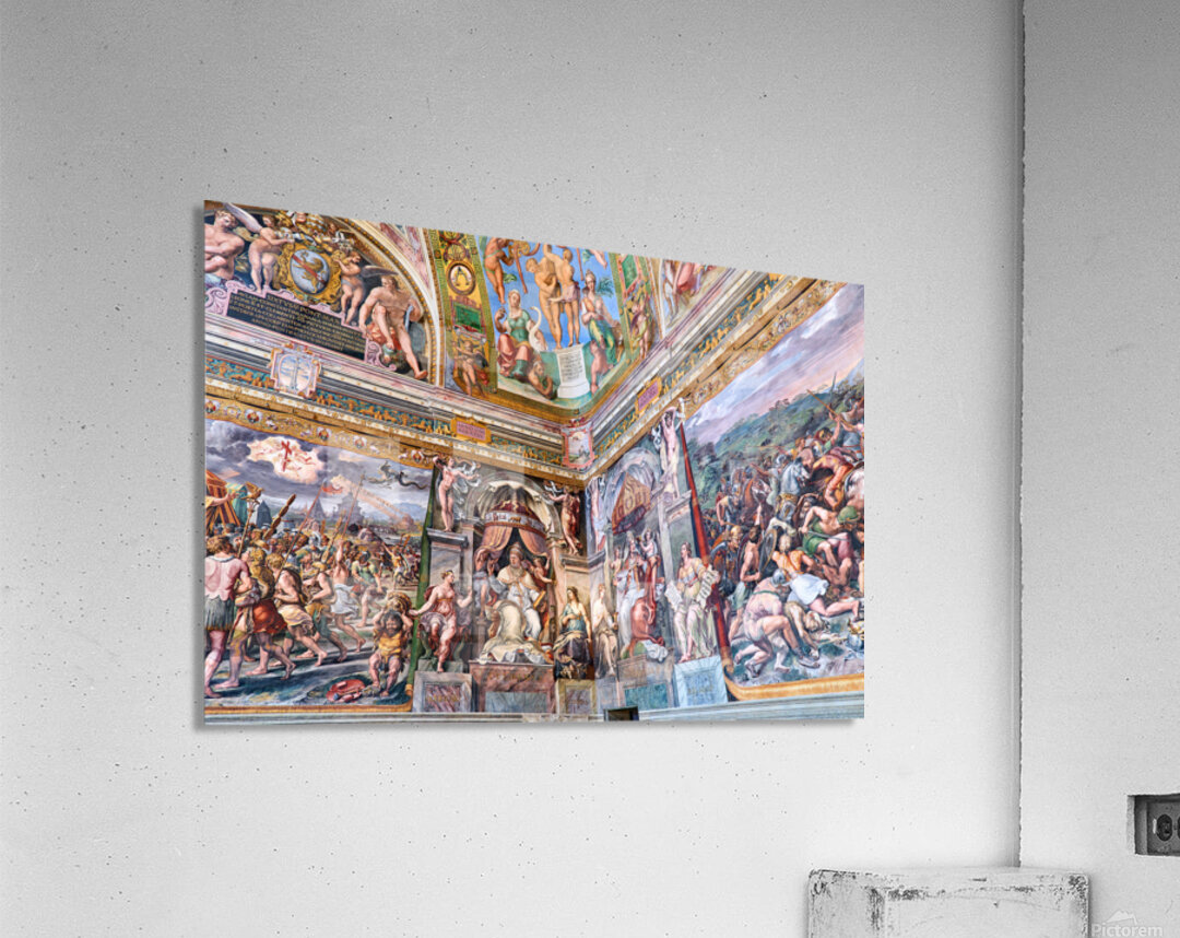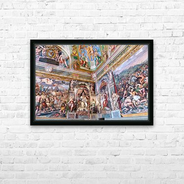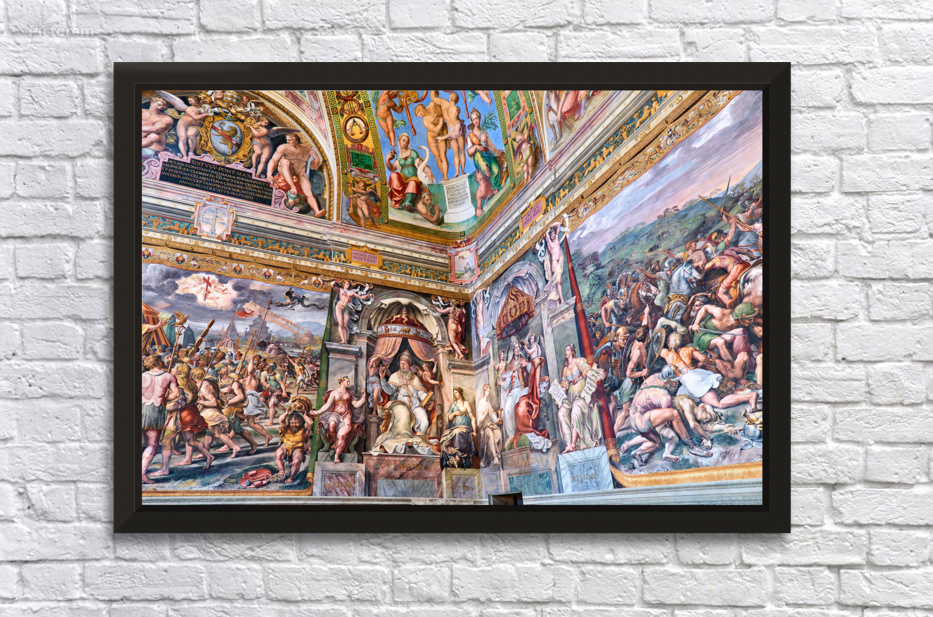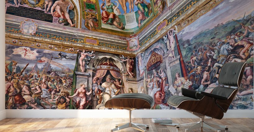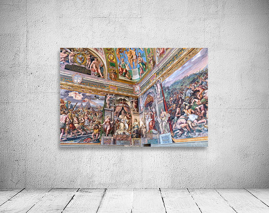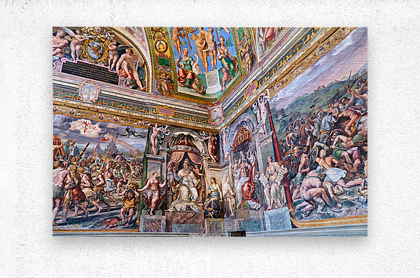 Visitors view ornate frescoes on walls and ceilings in the Raphael rooms at the Vatican Museums in Vatican City Rome during the day.
