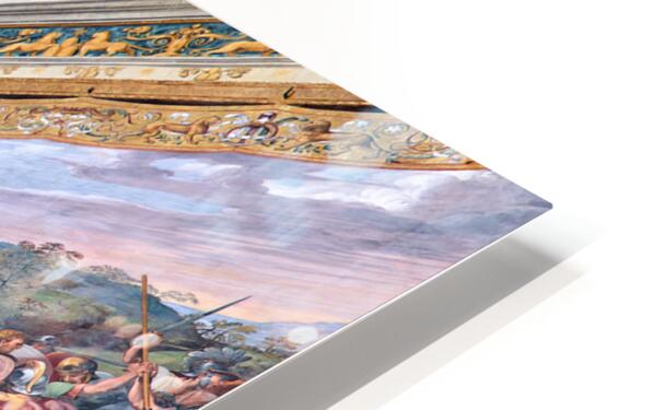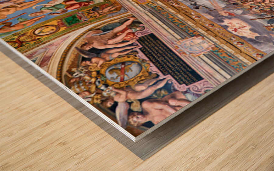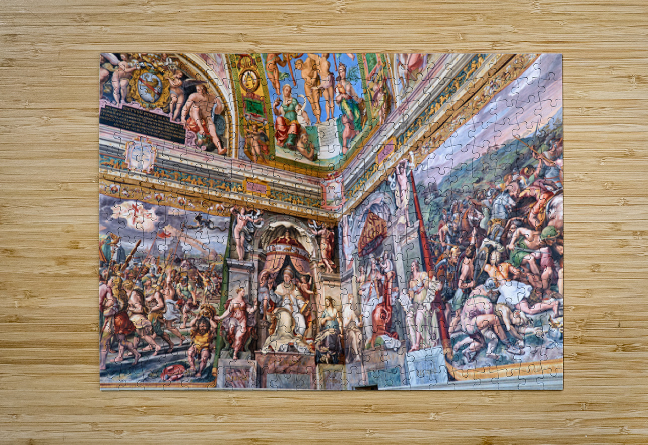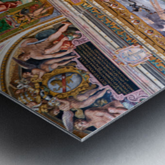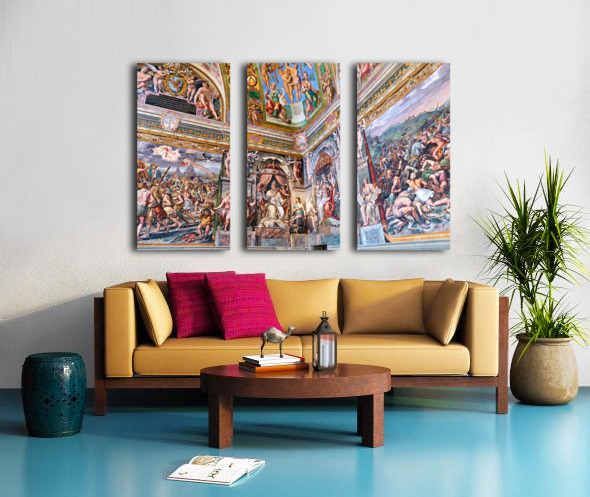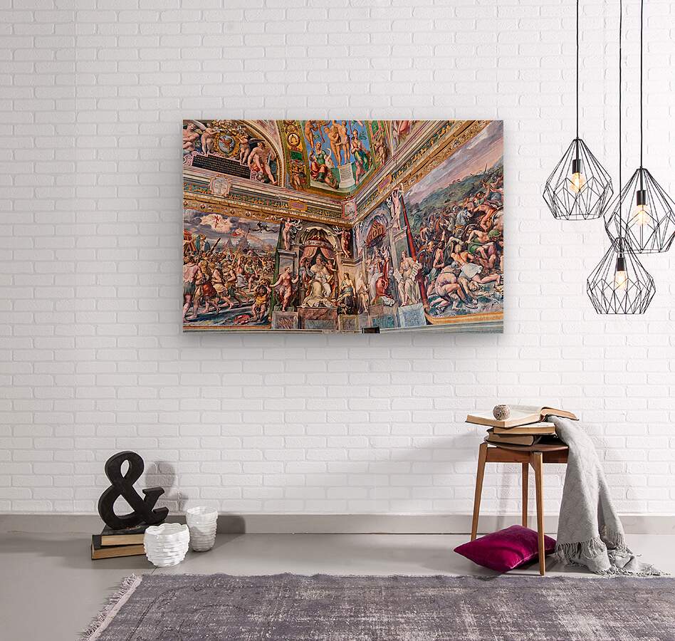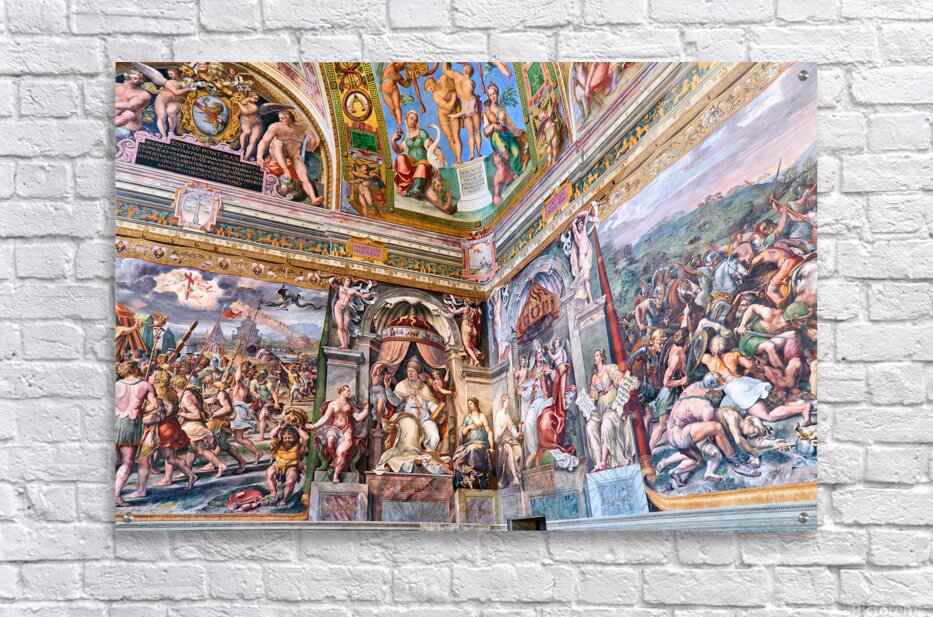 Visitors view ornate frescoes on walls and ceilings in the Raphael rooms at the Vatican Museums in Vatican City Rome during the day.