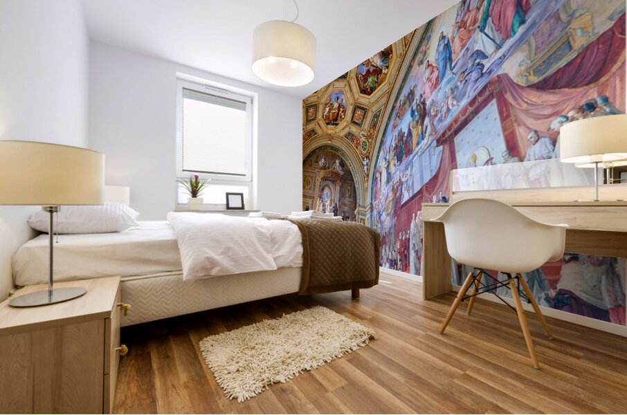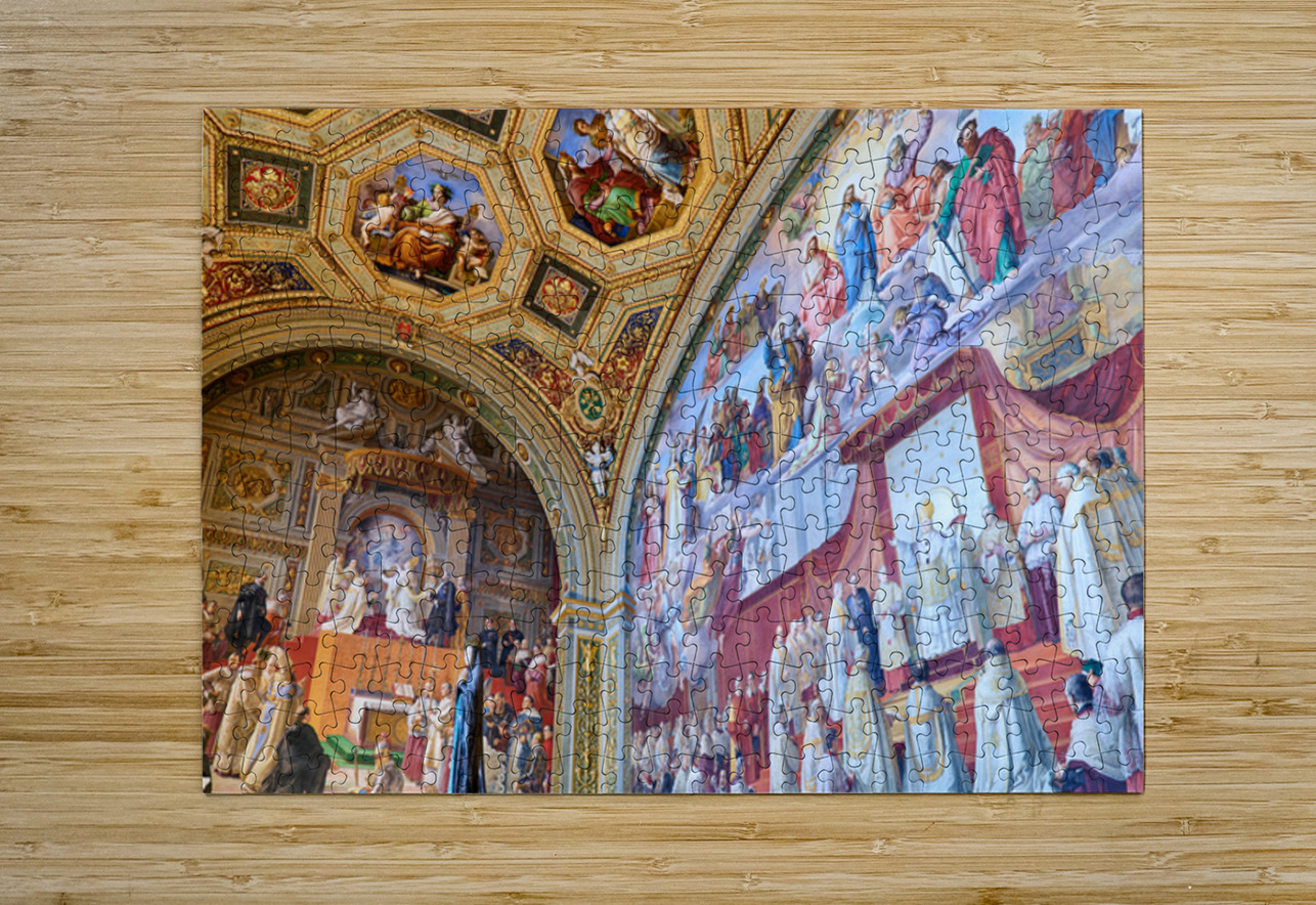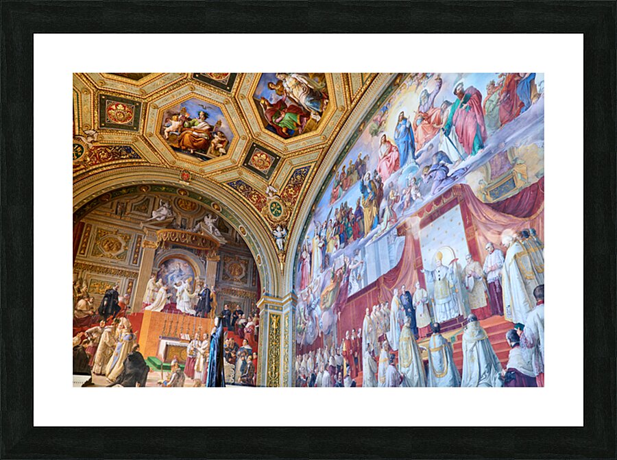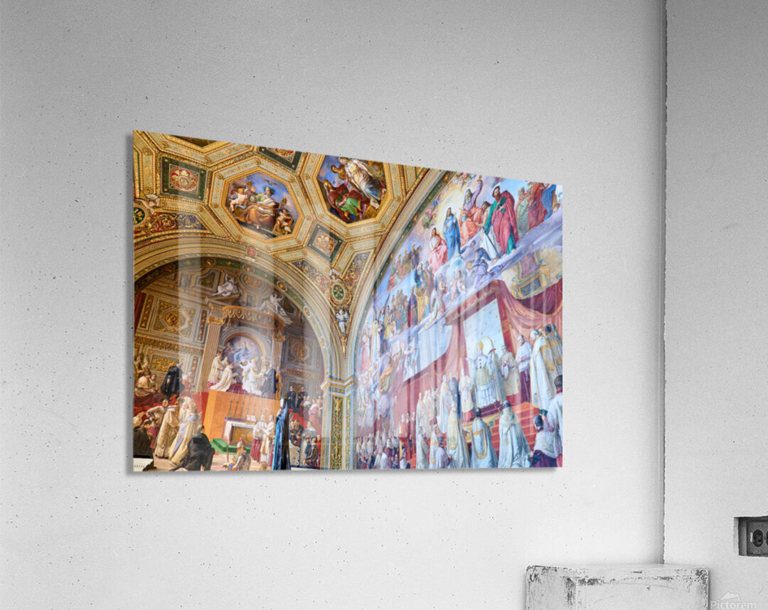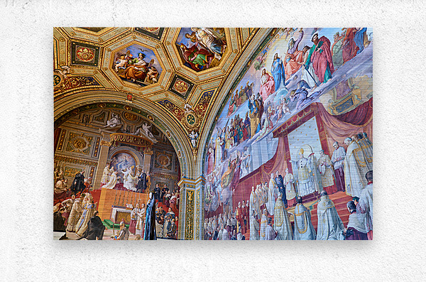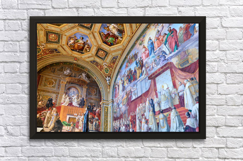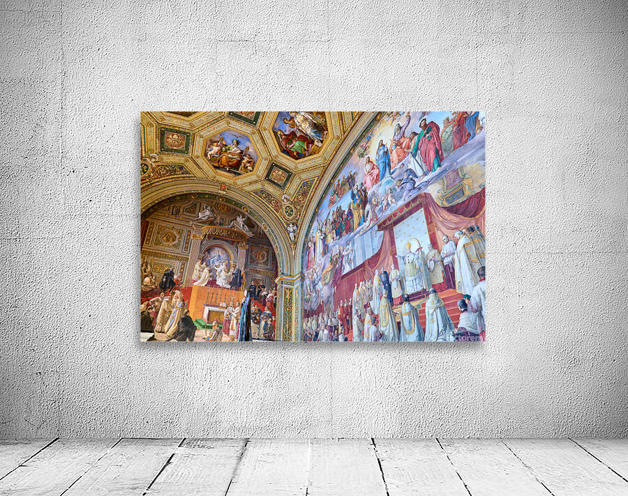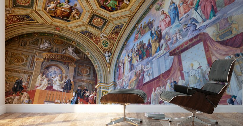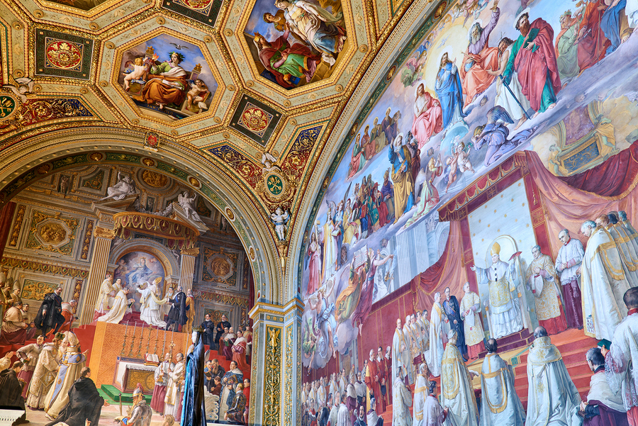 Visitors admire vibrant frescoes in the Raphael rooms at the Vatican Museums. The artwork displays scenes from history and religion.