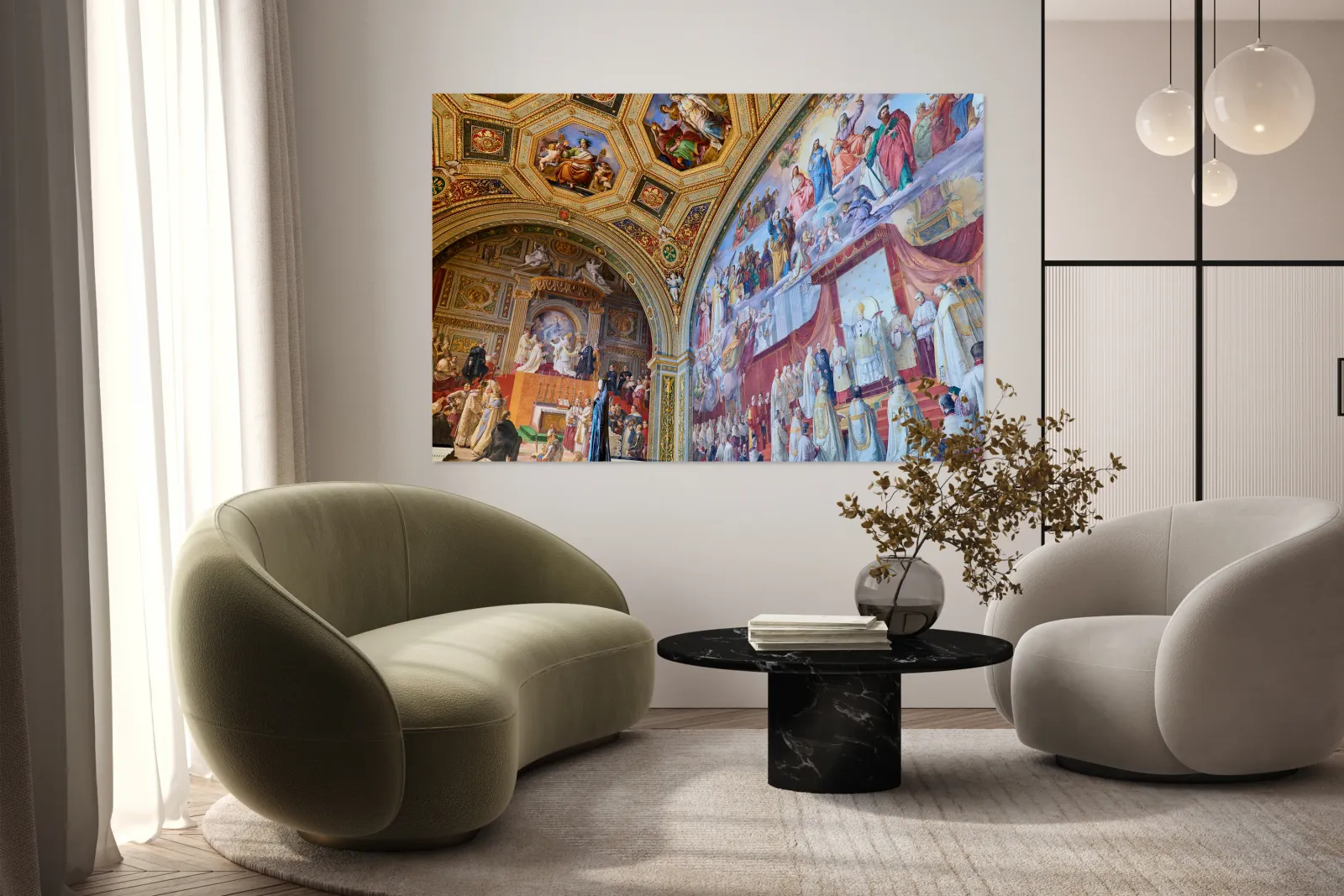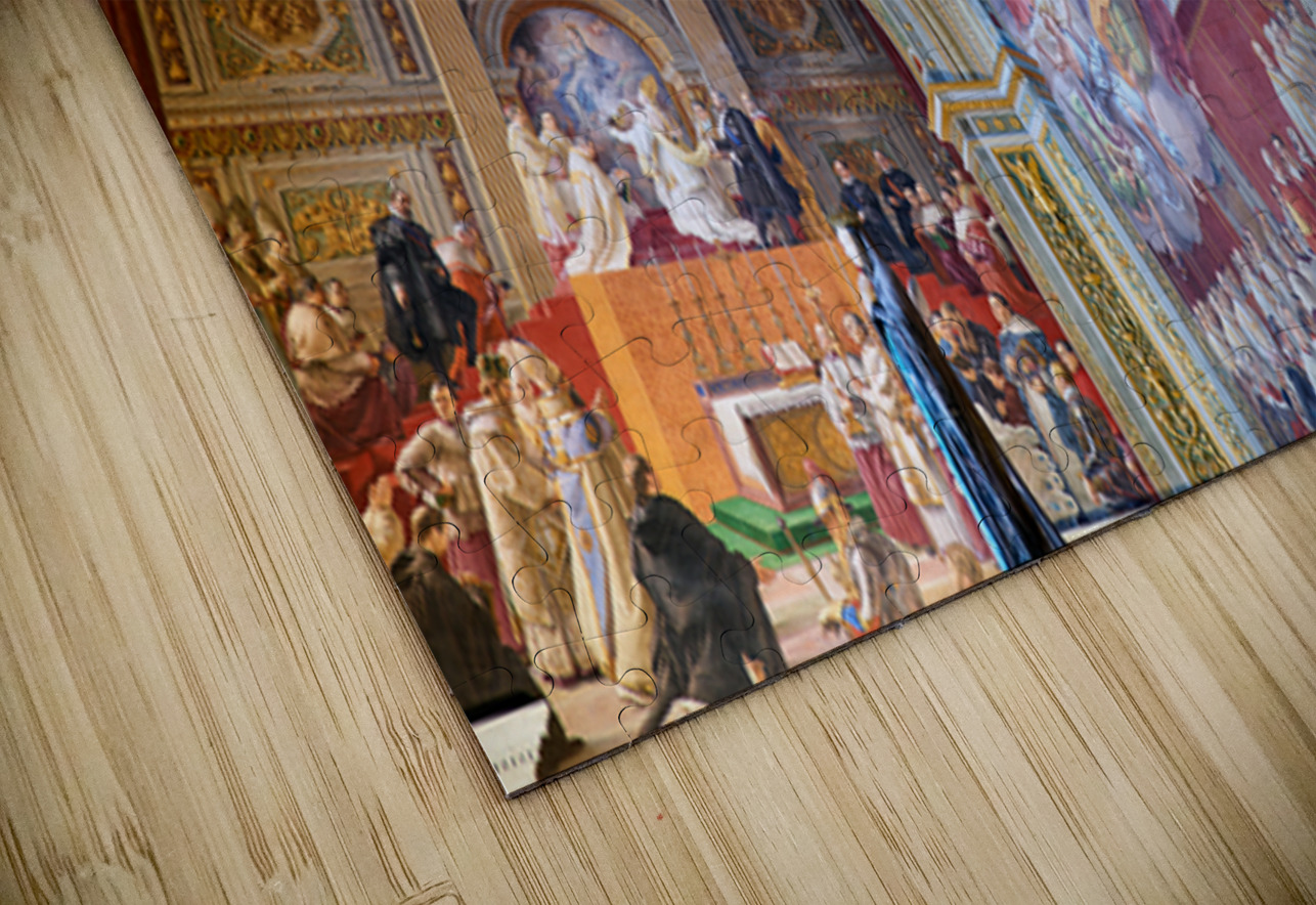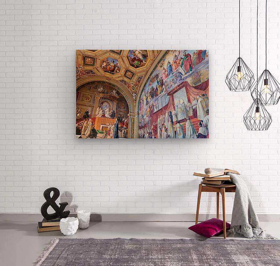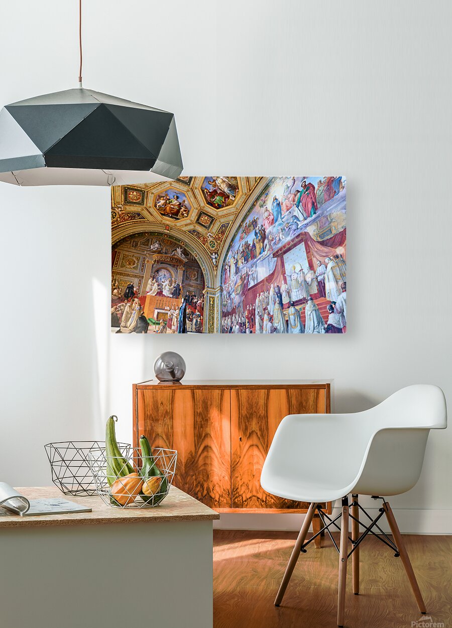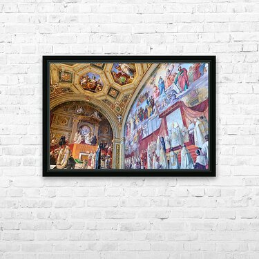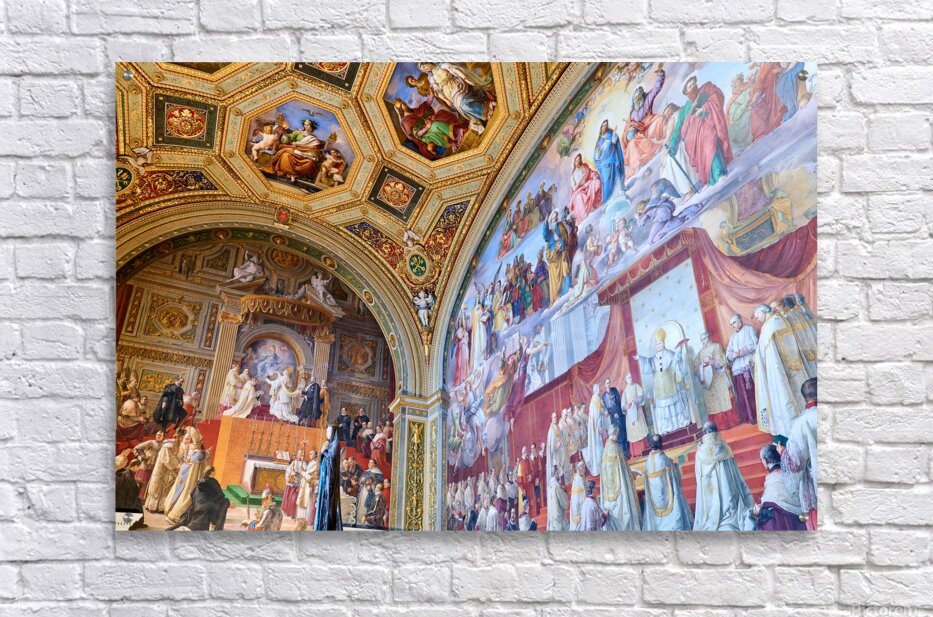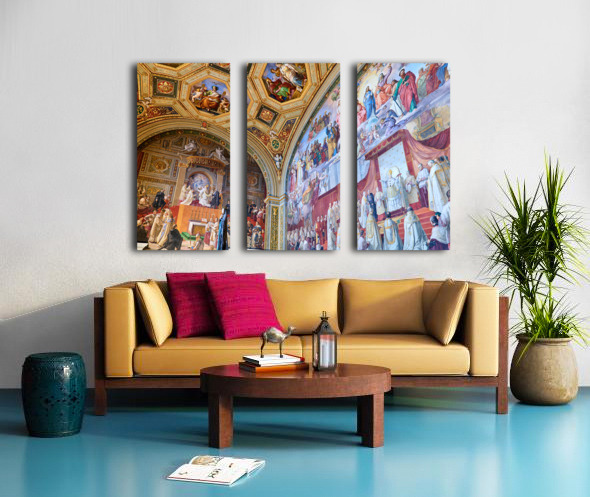 Visitors admire vibrant frescoes in the Raphael rooms at the Vatican Museums. The artwork displays scenes from history and religion.