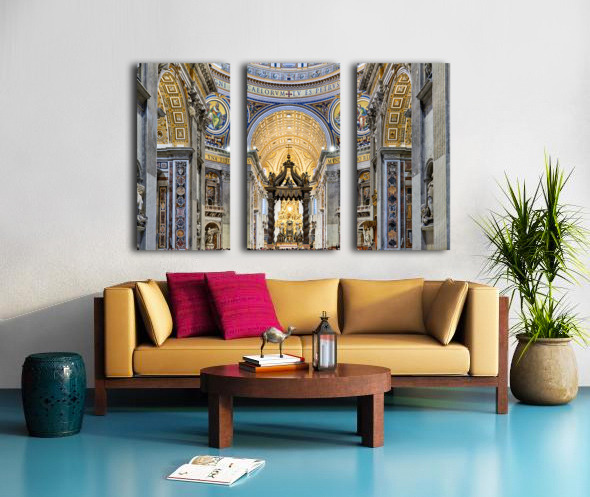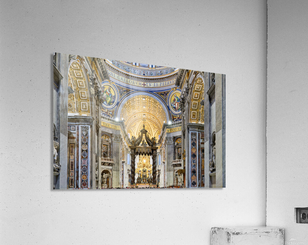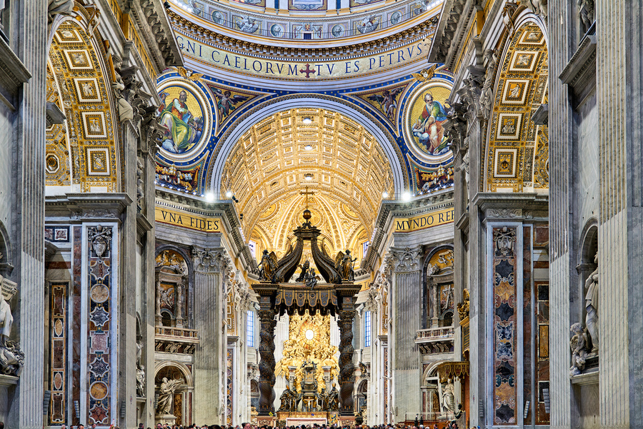 Saint Peters Basilica in Rome shows Berninis baldacchino at the altar. Visitors admire the architecture in Saint Peters Square during a busy day.