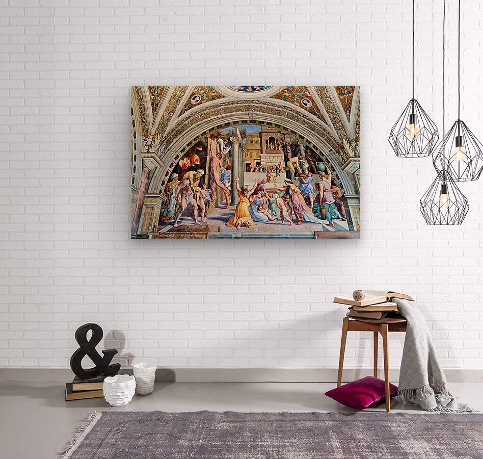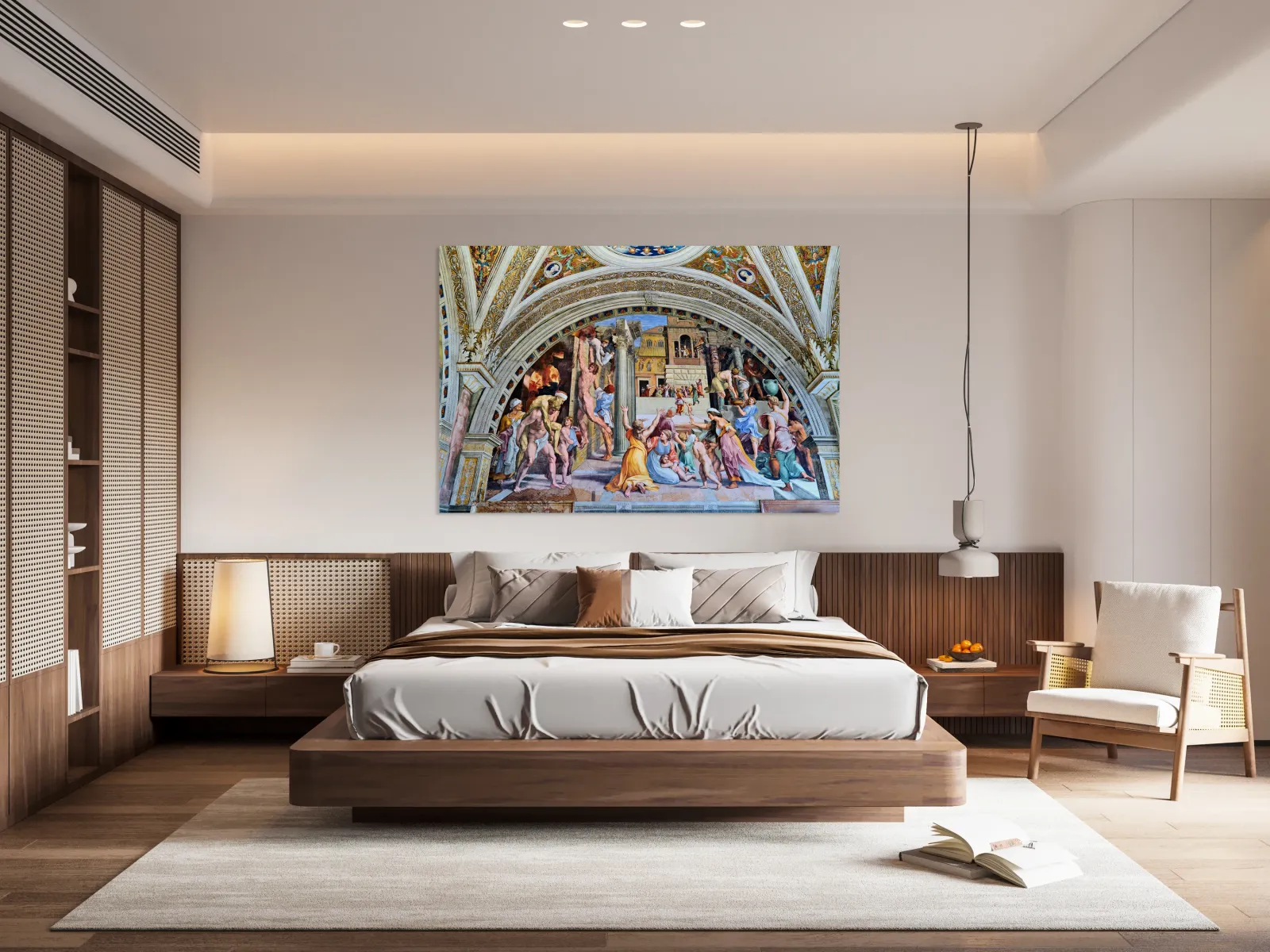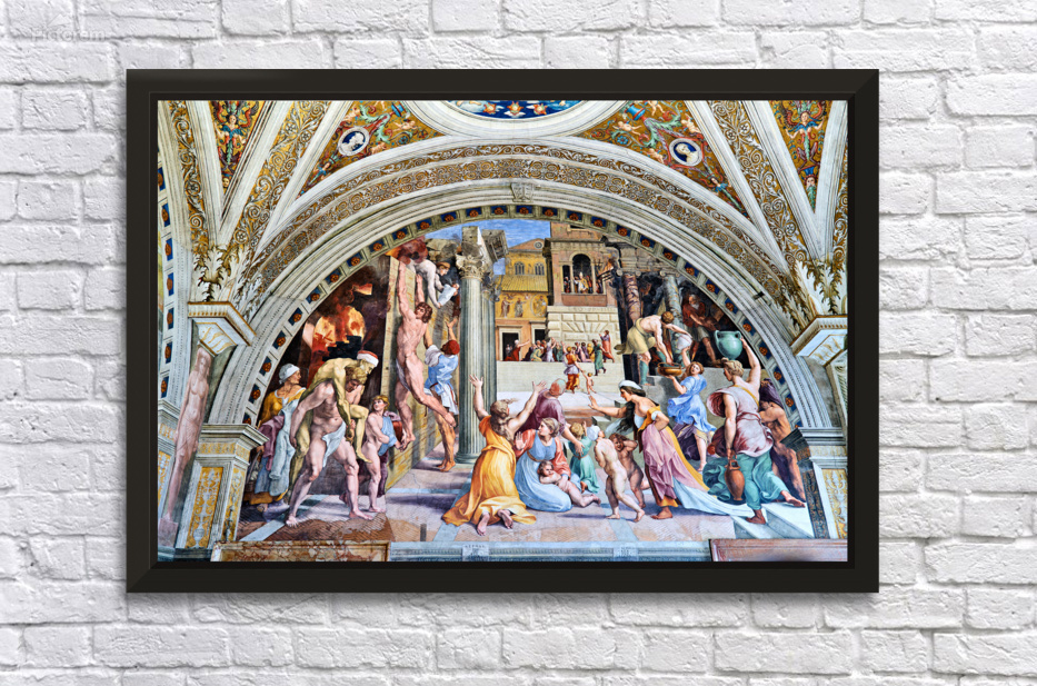 Visitors admire frescoes in the Raphael Rooms at Vatican Museums in Rome. Artwork shows biblical scenes and historical figures from Italian culture.