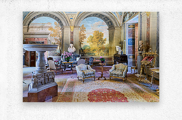 Visitors view art and decor in the Princess Isabelle Apartment at Palazzo Colonna in Rome Italy. The space shows rich colors and sculptures.