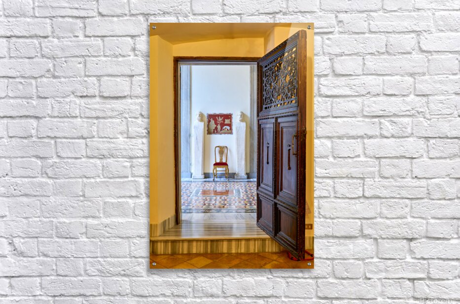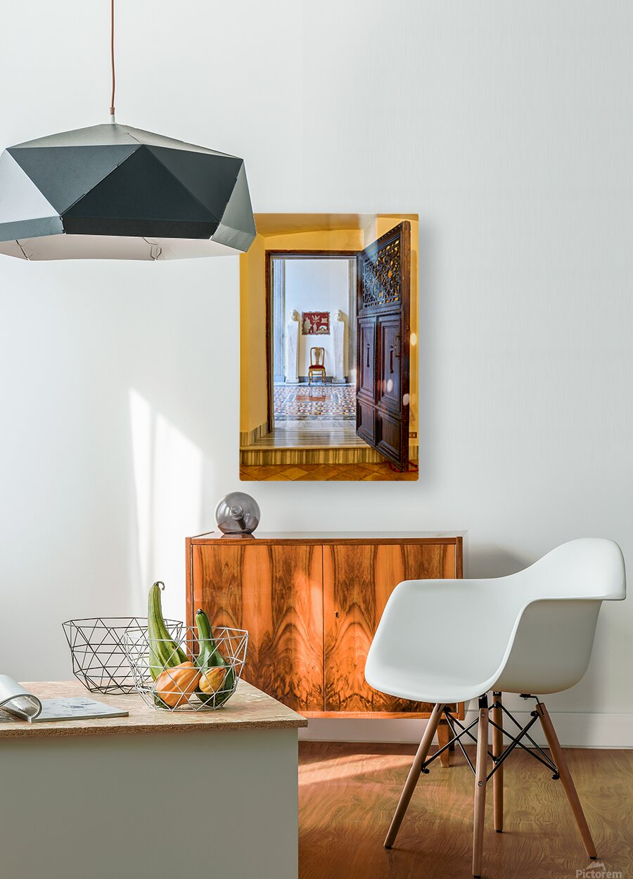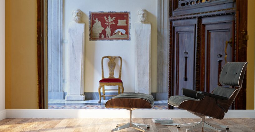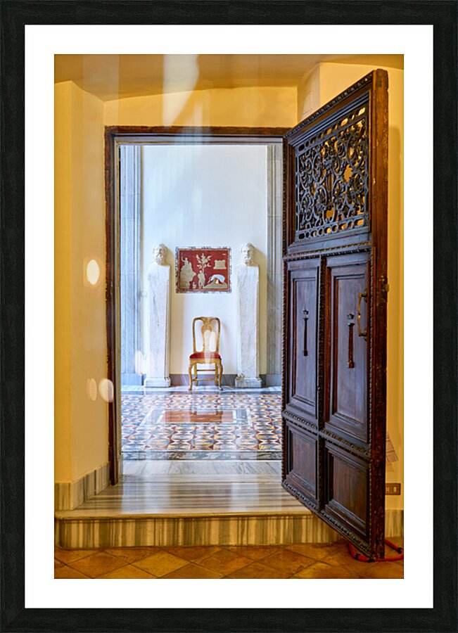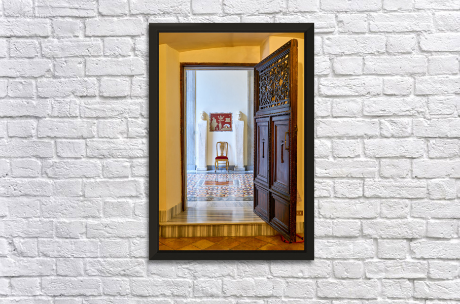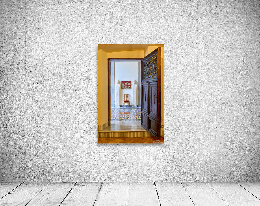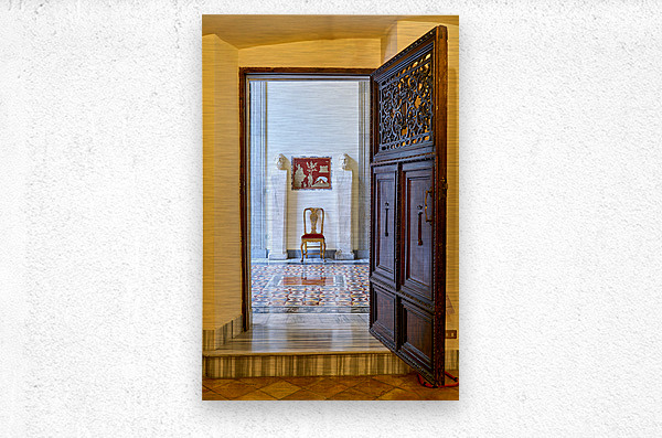 A wooden door opens to reveal the interior of the Princess Isabelle Apartment in the Colonna Art Gallery in Rome. Statues and a chair are visible.