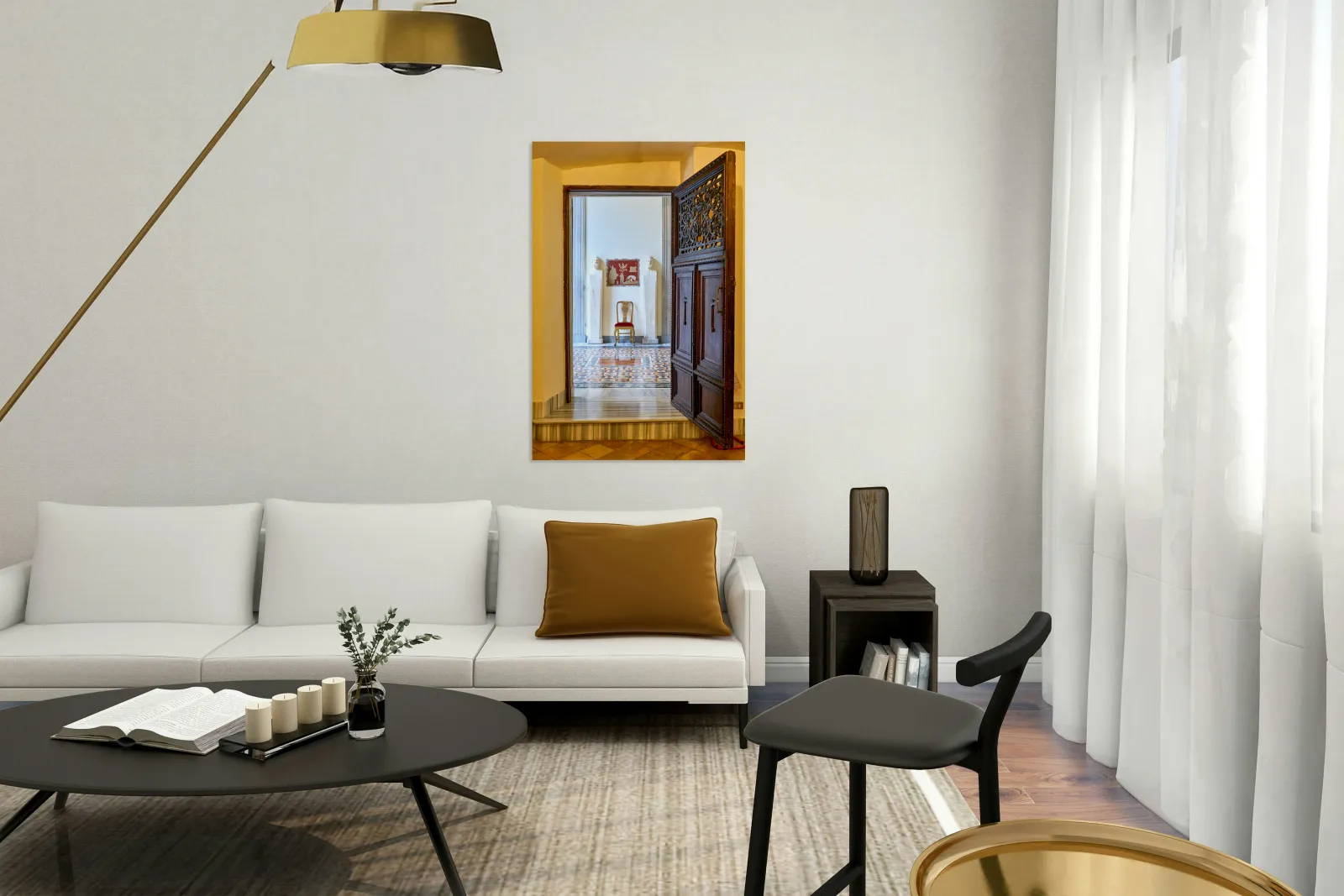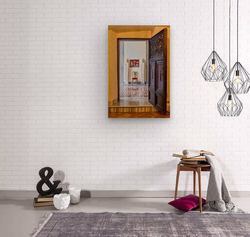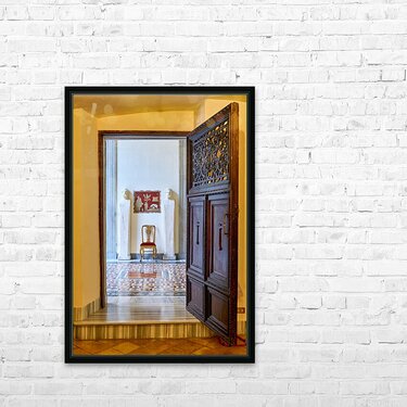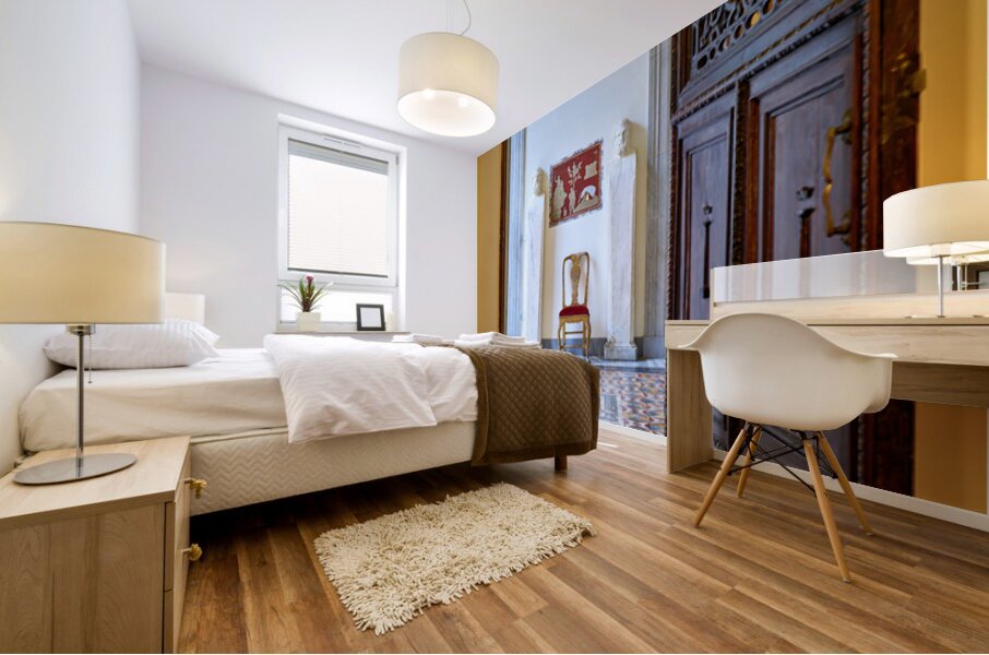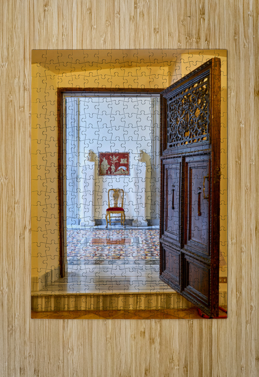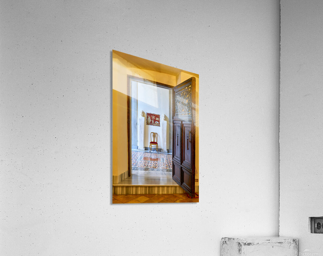 A wooden door opens to reveal the interior of the Princess Isabelle Apartment in the Colonna Art Gallery in Rome. Statues and a chair are visible.