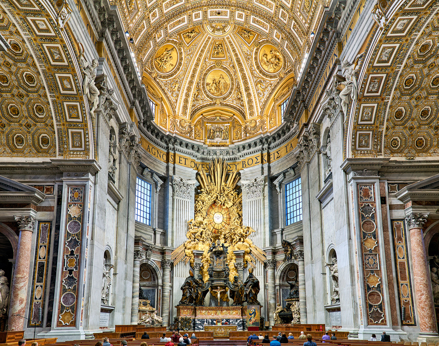 Visitors gather inside Saint Peters Basilica in Rome. They look at Berninis Cathedra Petri and enjoy the grand architecture around them.