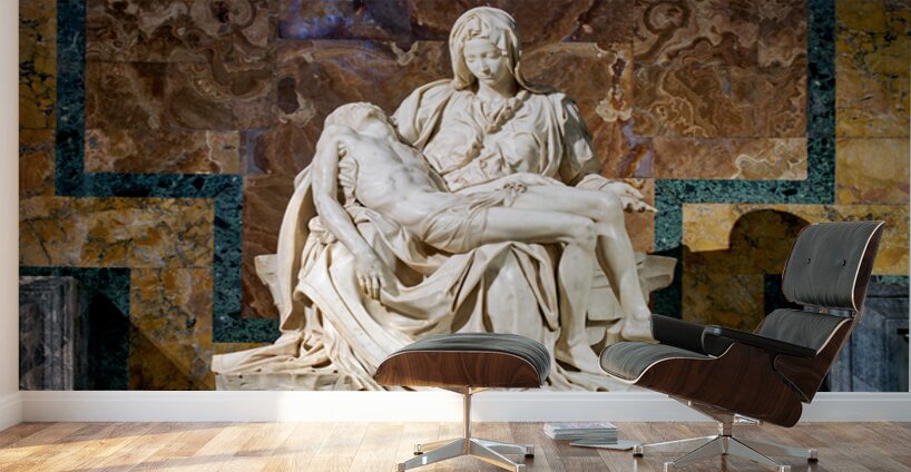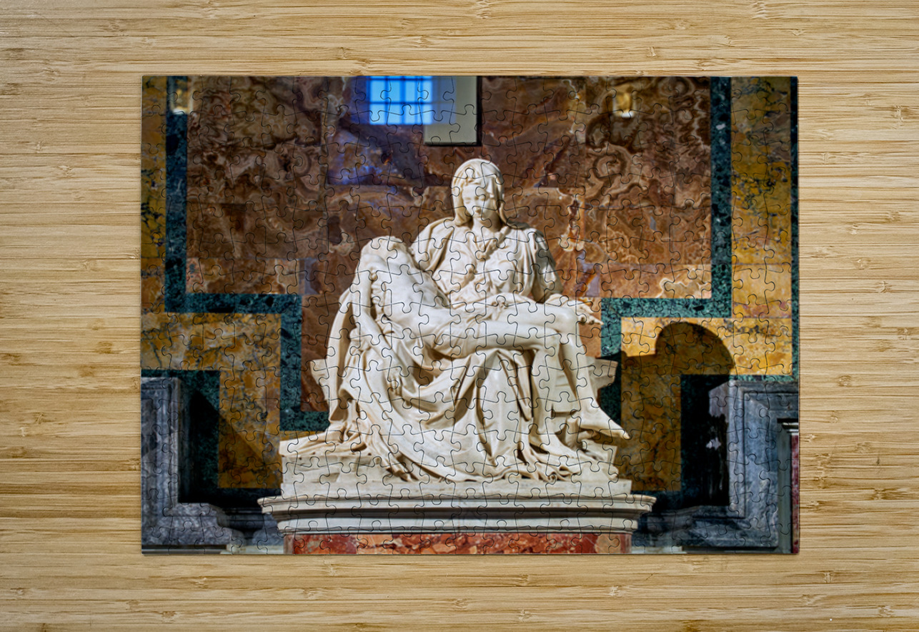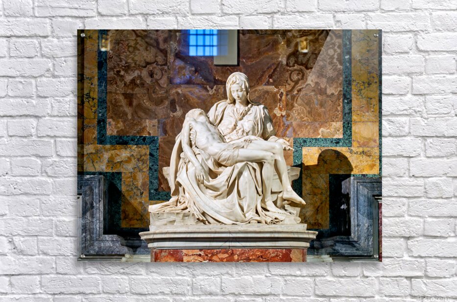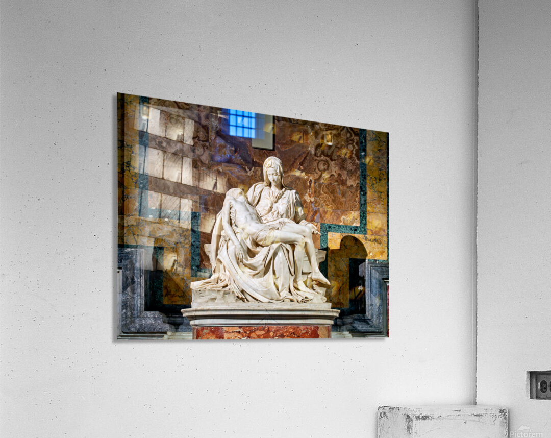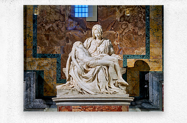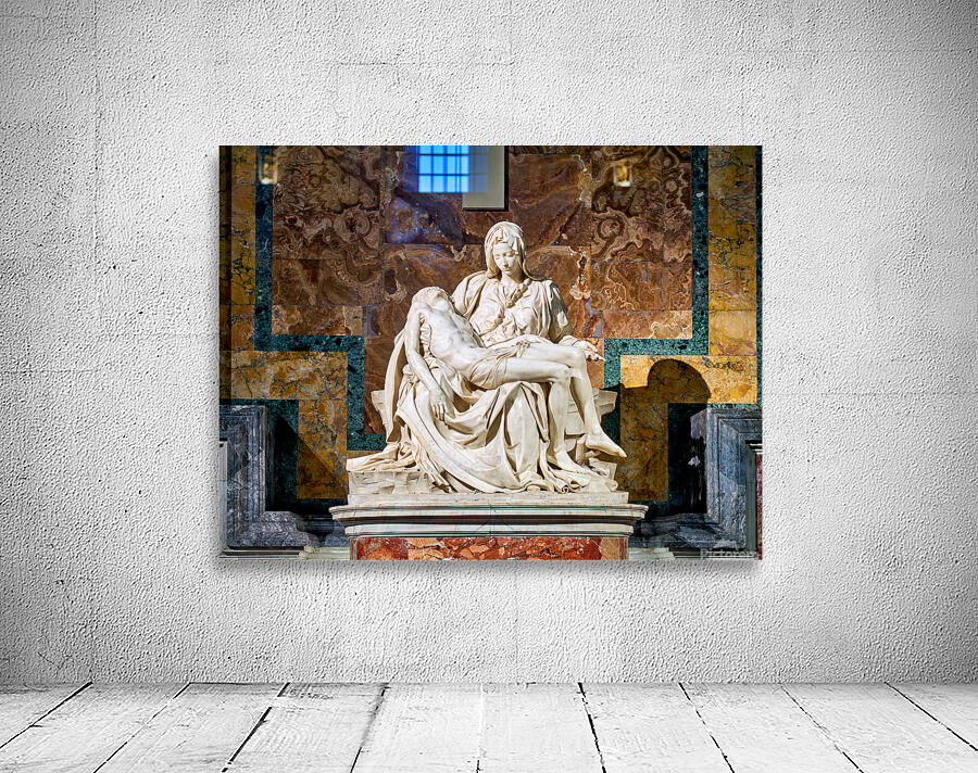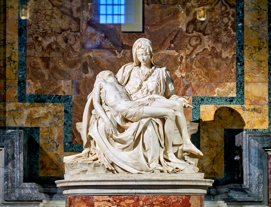 Visitors see Michelangelos Pietà in Saint Peters Basilica located in Saint Peters Square Rome. The sculpture shows Mary holding Jesus.