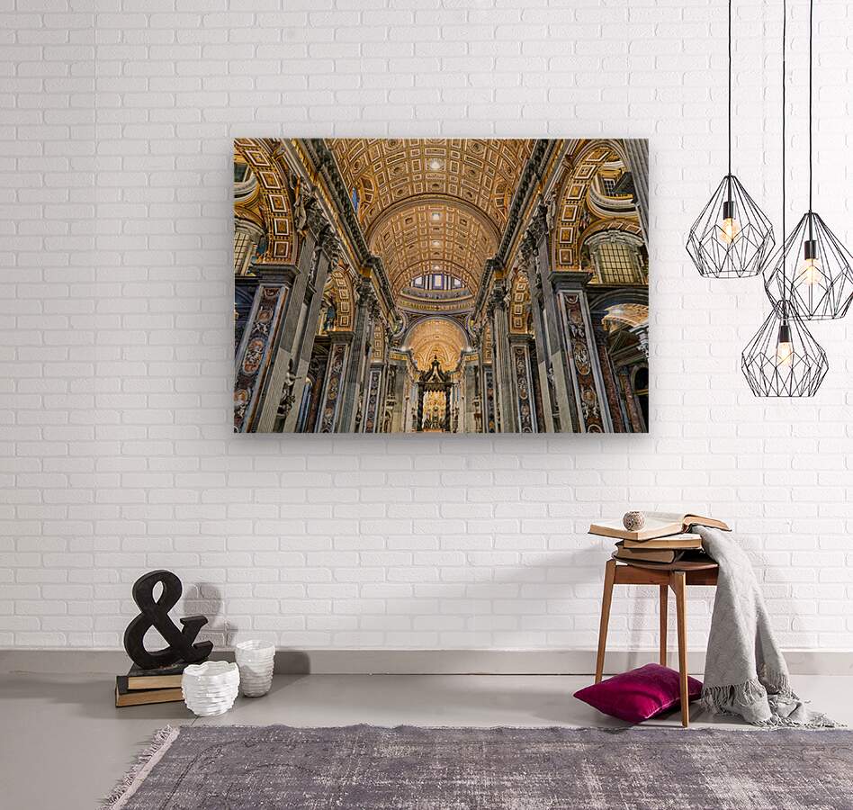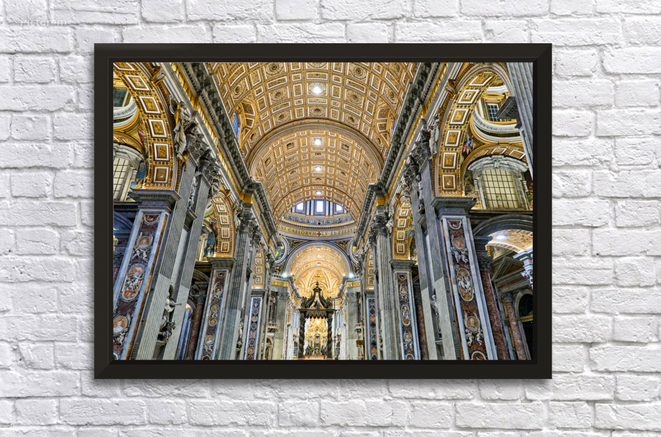 Saint Peters Basilica in Rome. Visitors admire Berninis baldacchino over the altar. The interior features many details.
