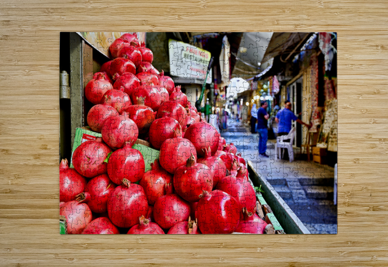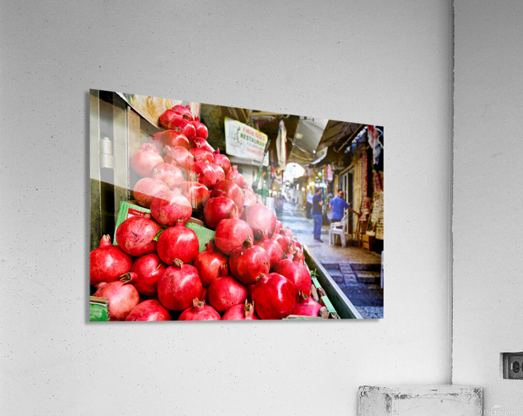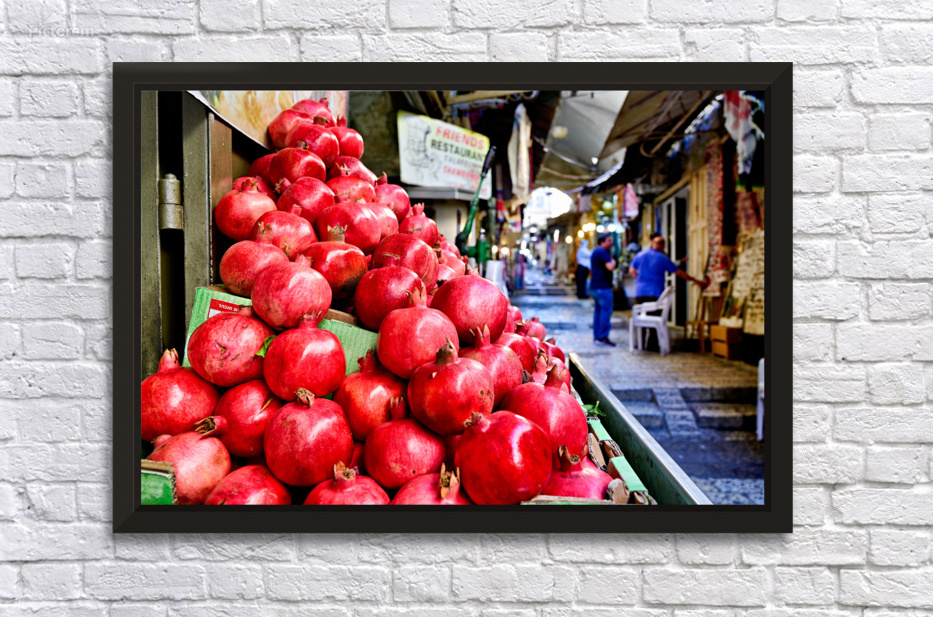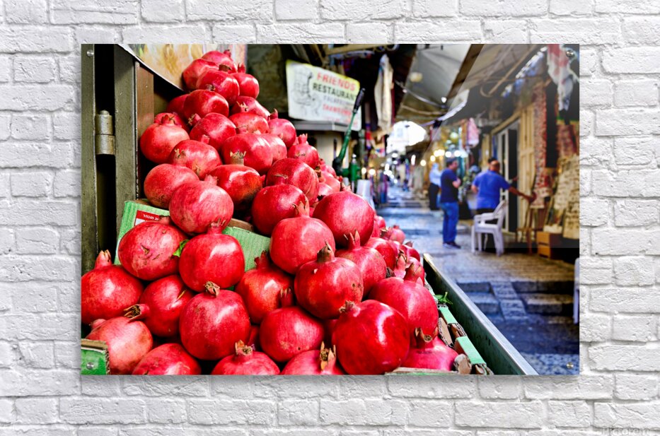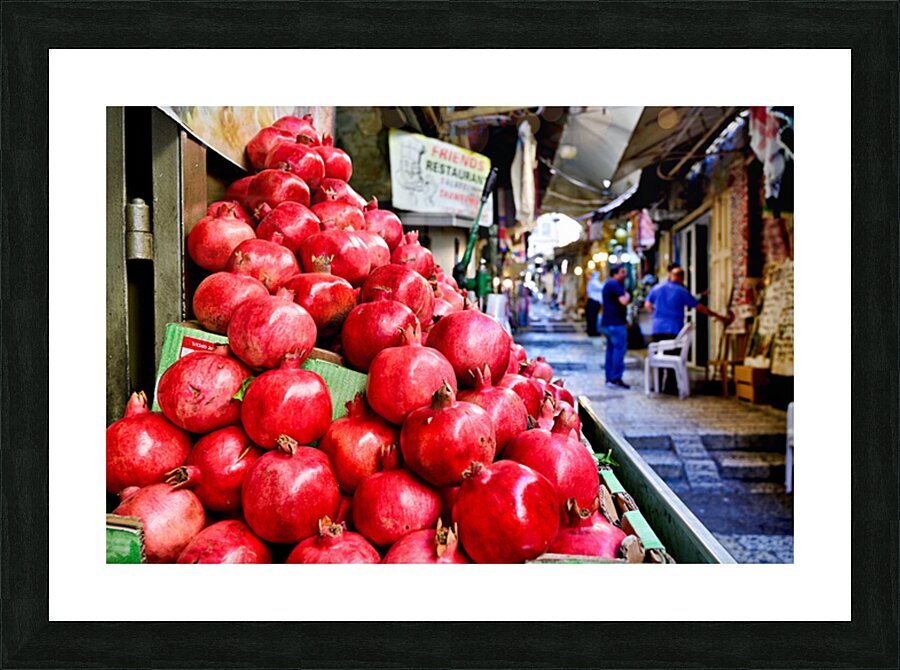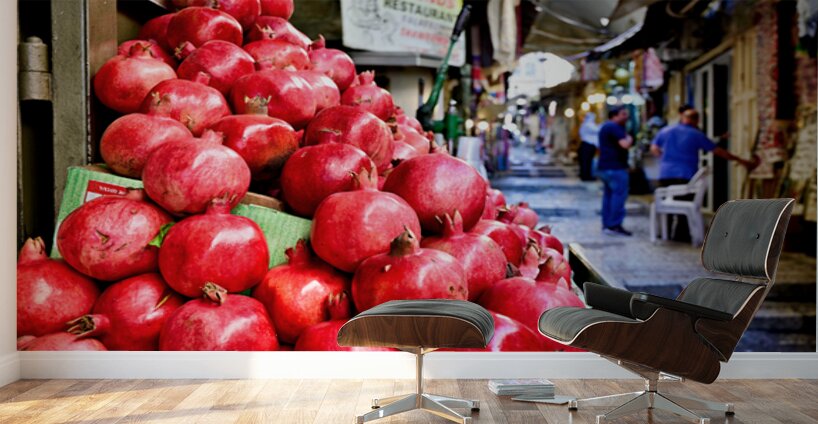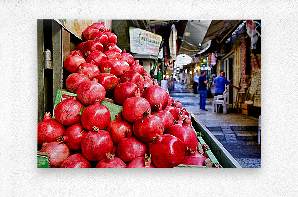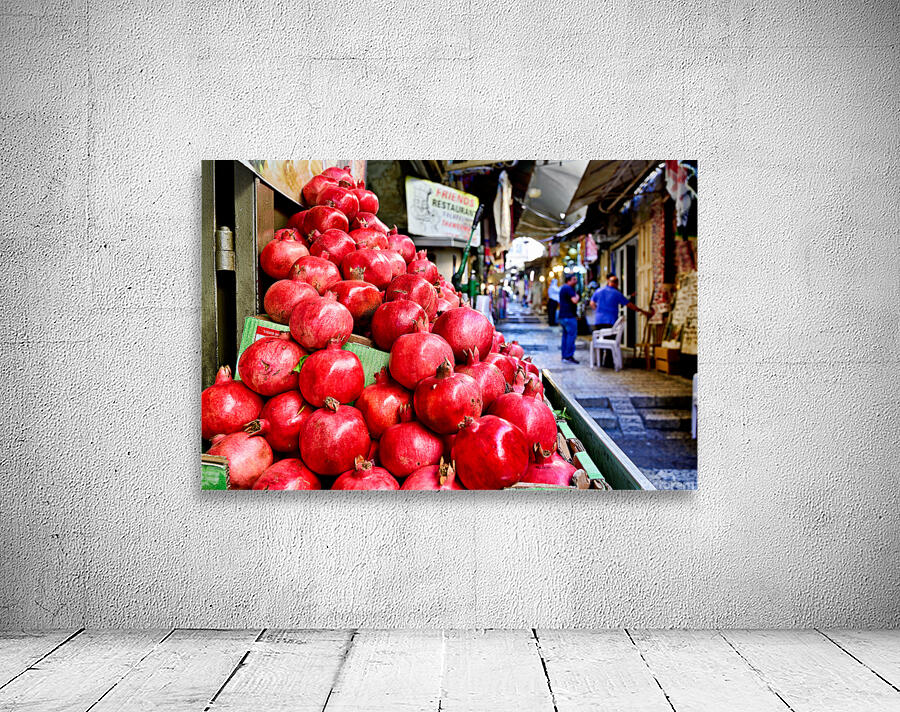 A fruit stall sells red pomegranates in the old city of Jerusalem. People walk by and browse the market. It is a lively place in the afternoon.
