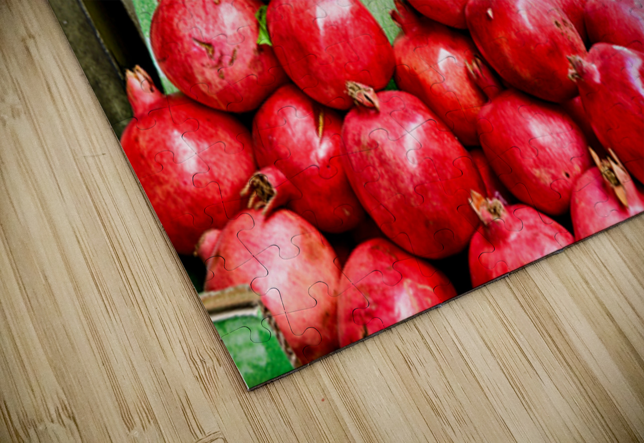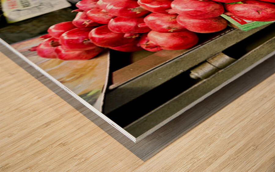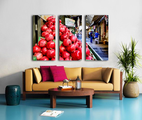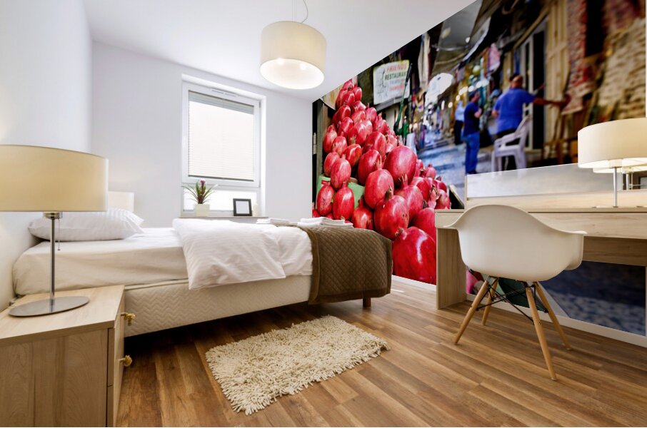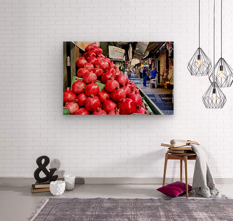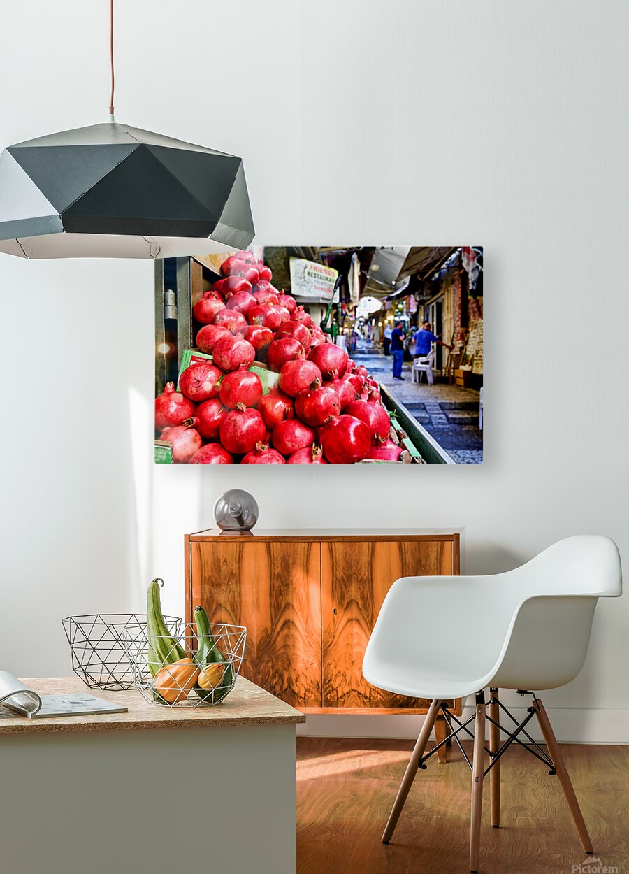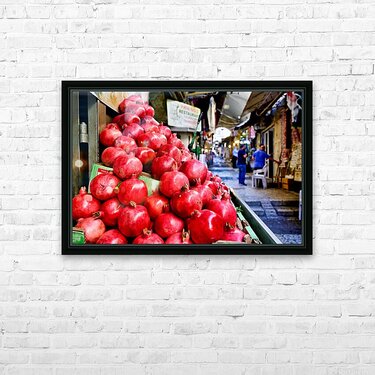 A fruit stall sells red pomegranates in the old city of Jerusalem. People walk by and browse the market. It is a lively place in the afternoon.