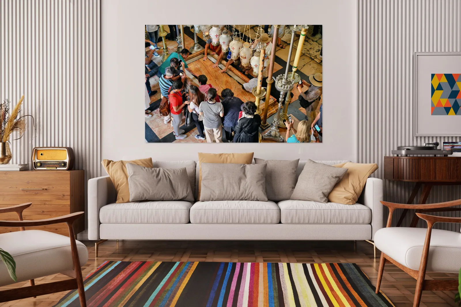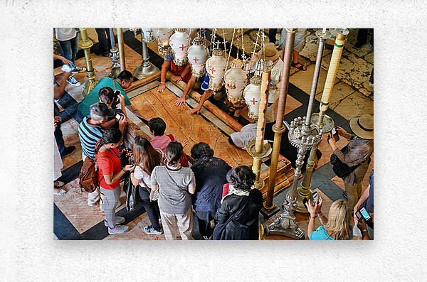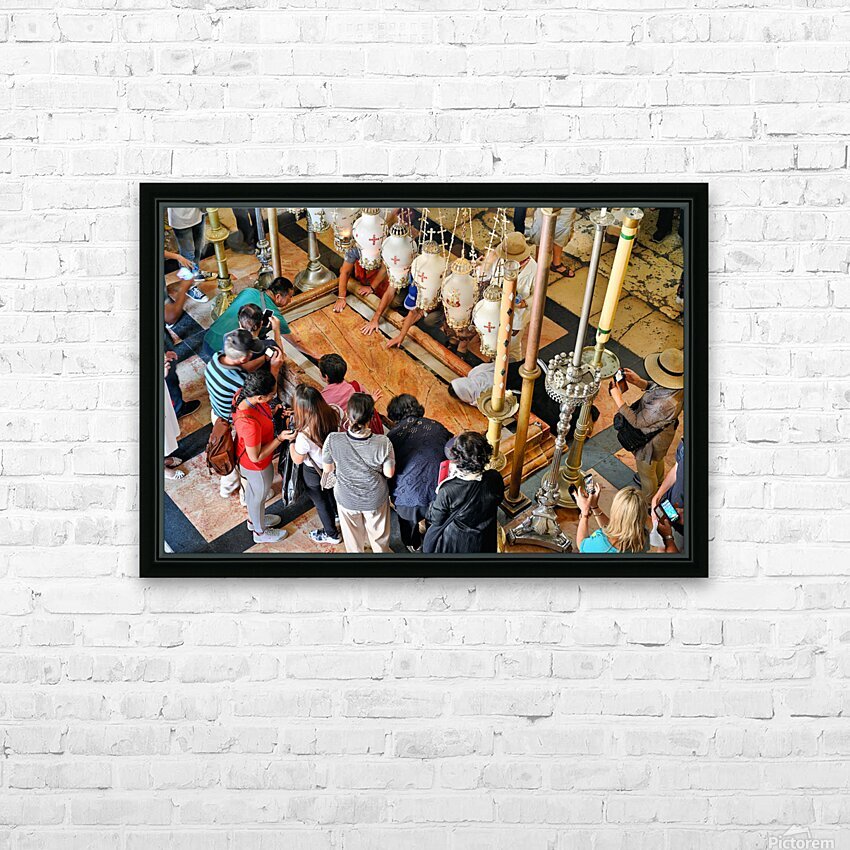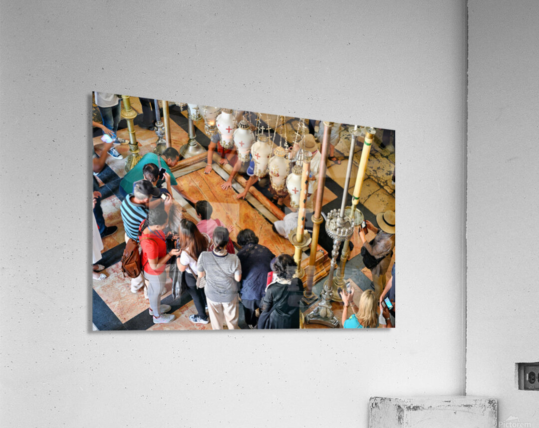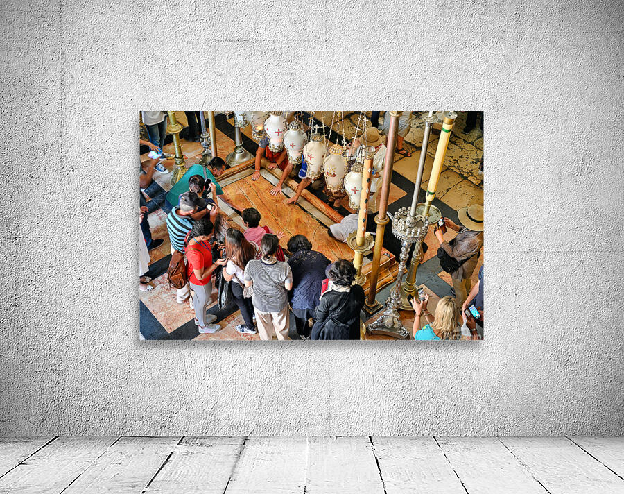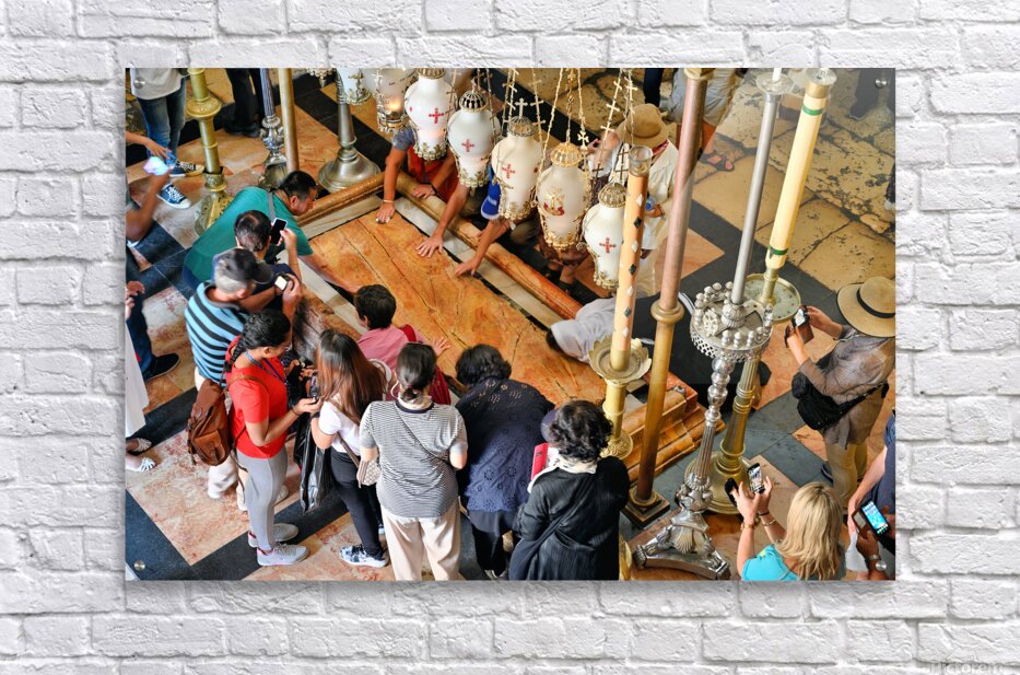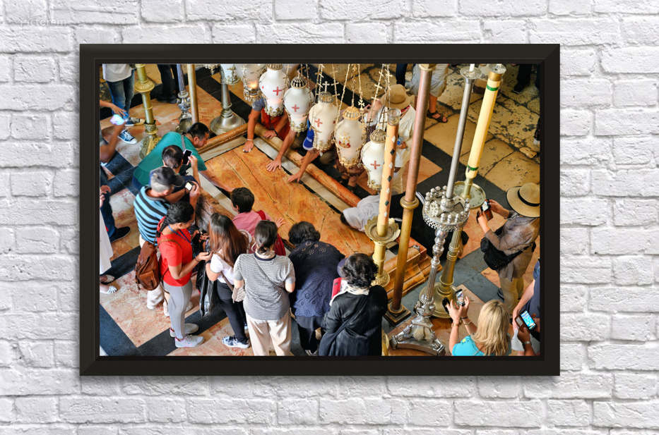 "Visitors gather at the church of the Holy Sepulchre in Jerusalem" in a framed print.