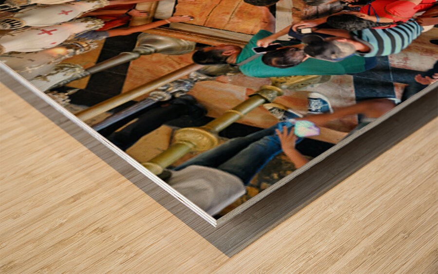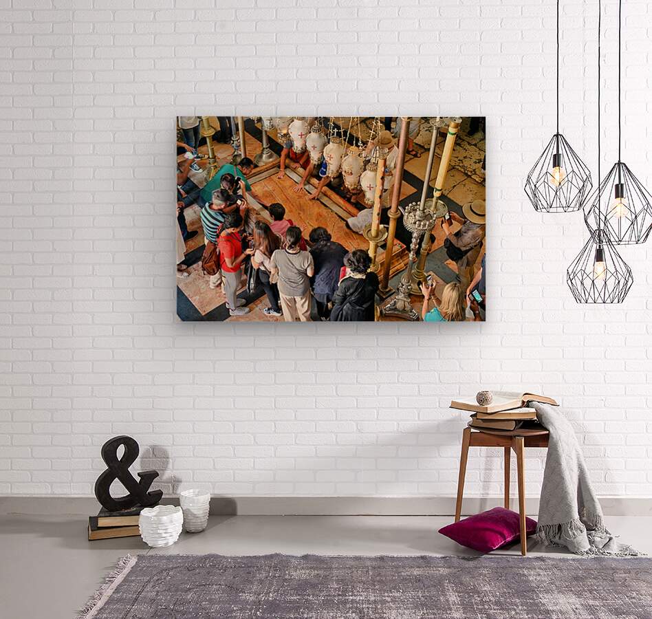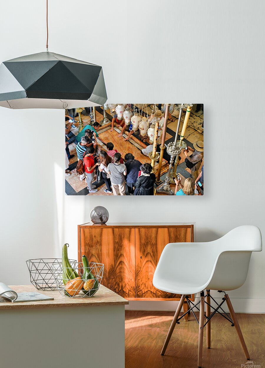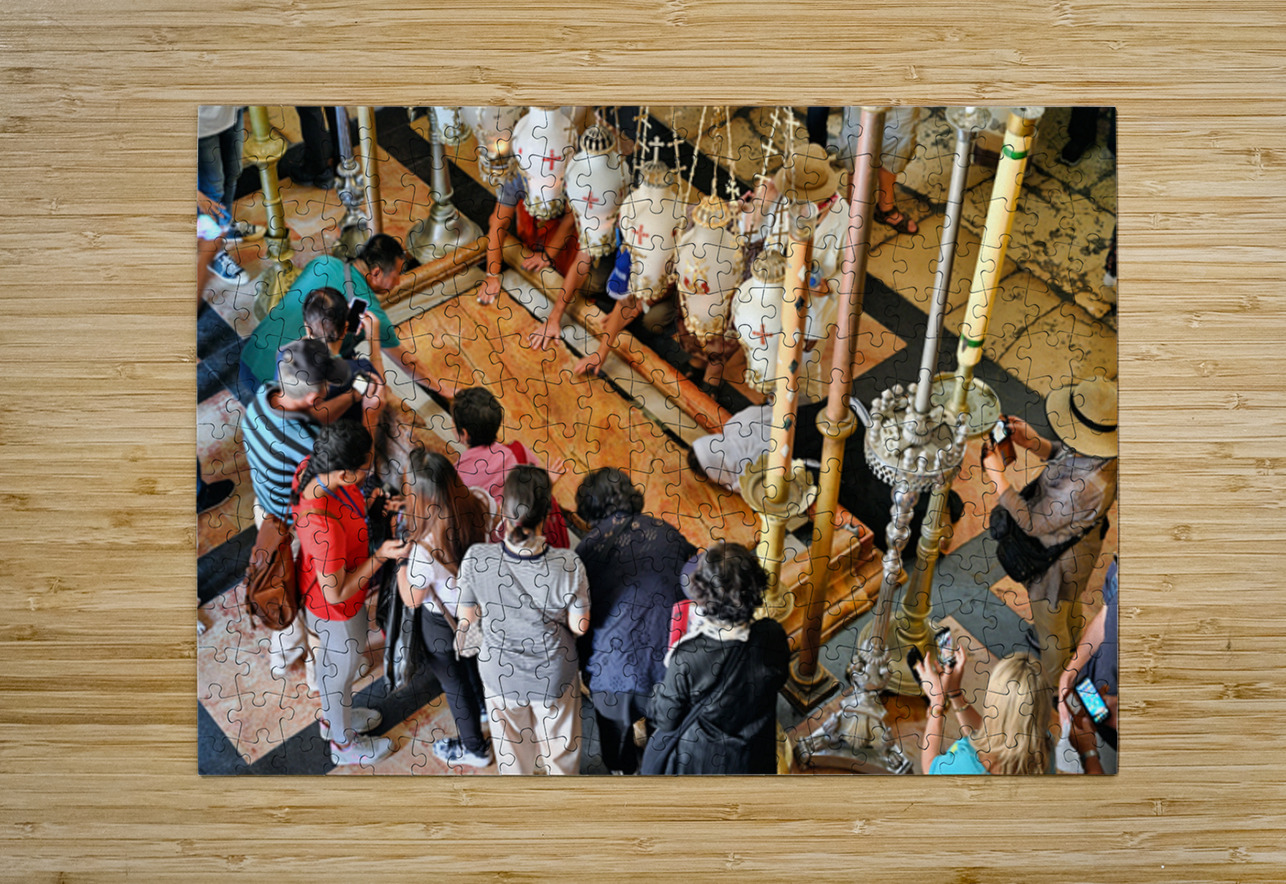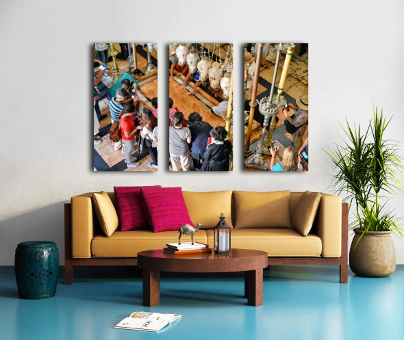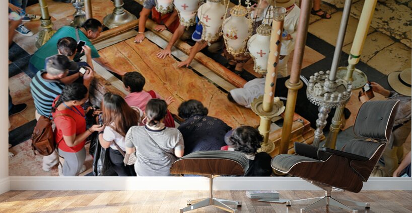 "Visitors gather at the church of the Holy Sepulchre in Jerusalem" in a framed print.