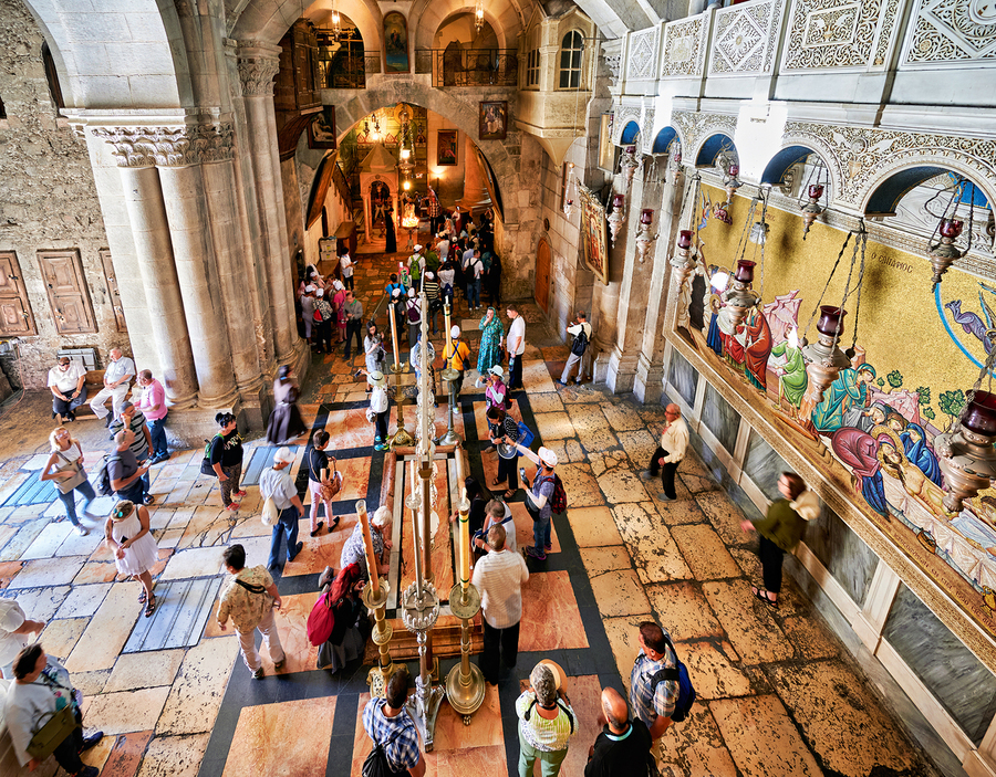 People walk through the Church of the Holy Sepulchre in Jerusalem. The church is an important religious site for visitors.