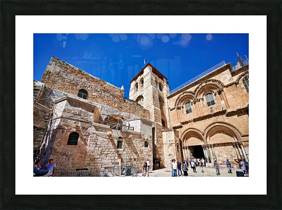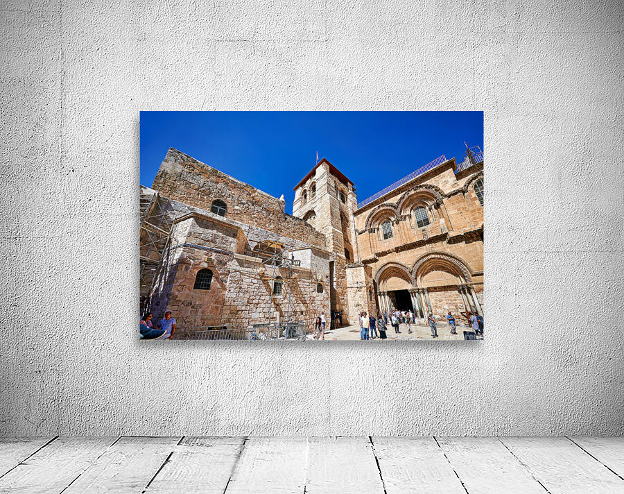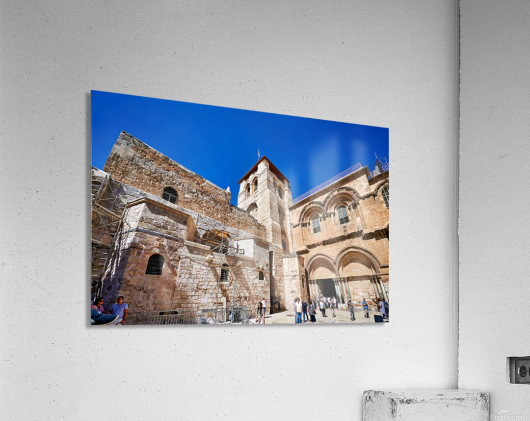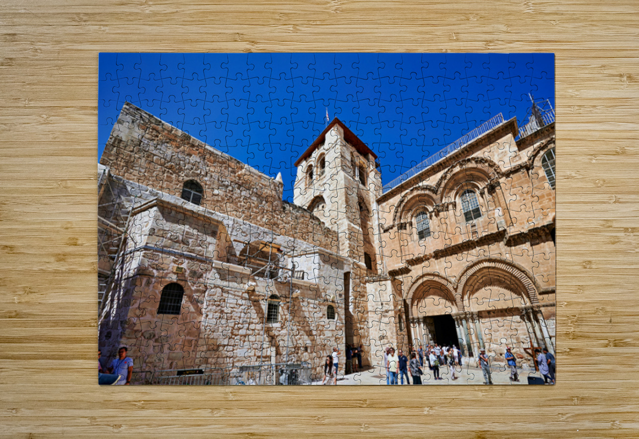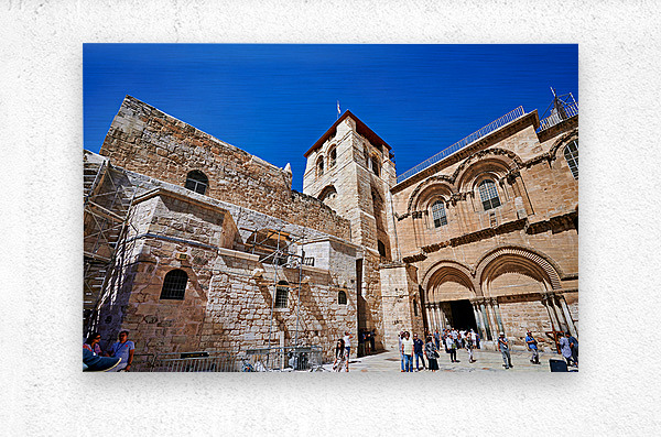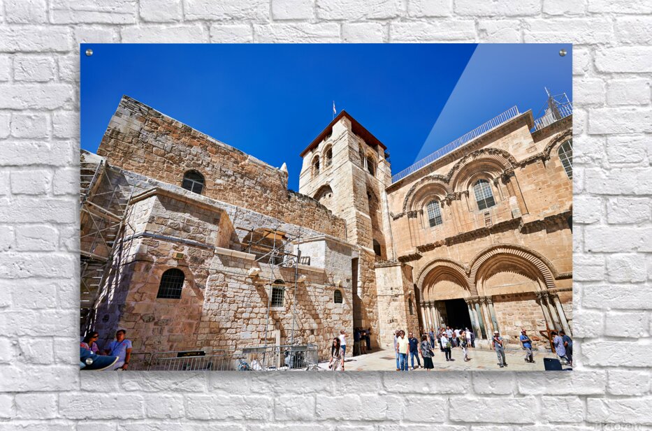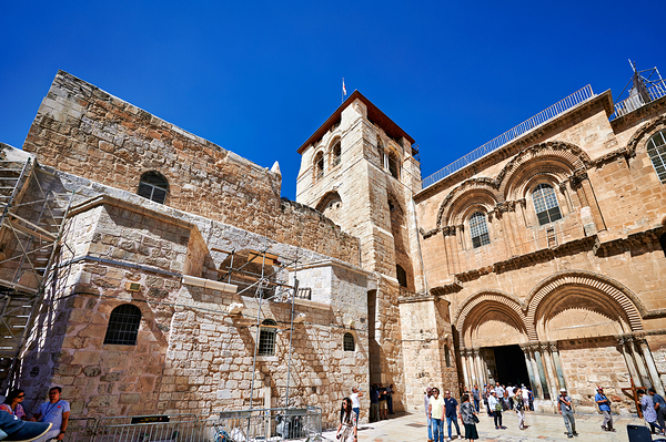 Visitors gather around the Church of the Holy Sepulchre in Jerusalem. The sun shines bright as people explore the historic site and its architecture.