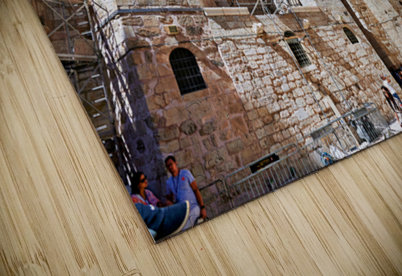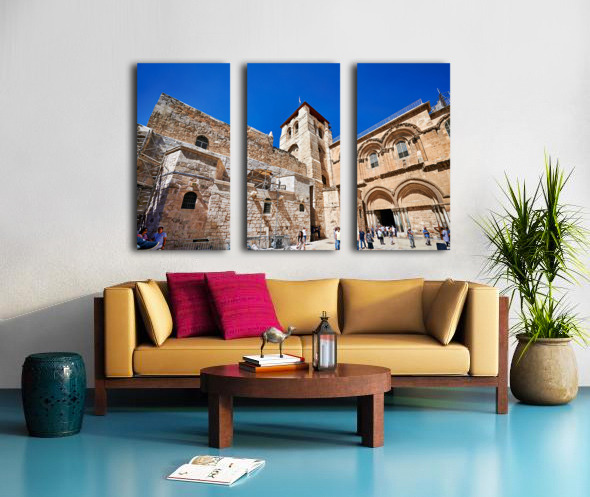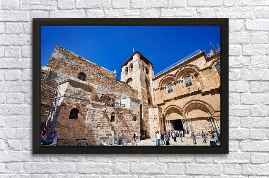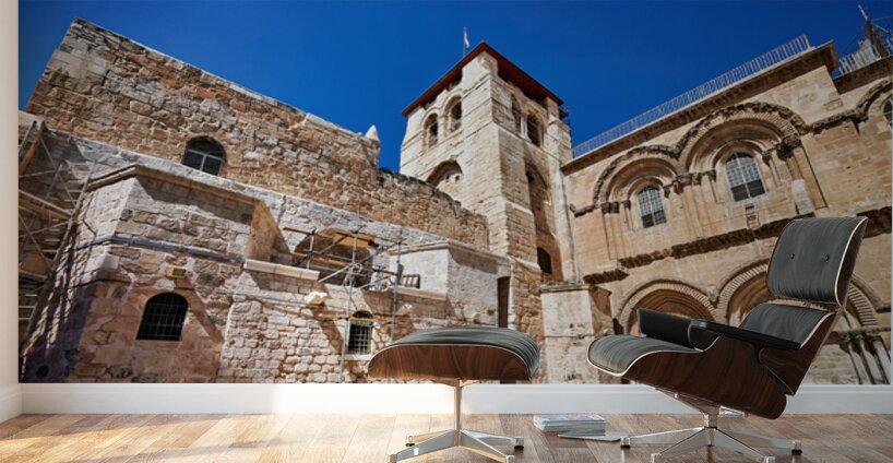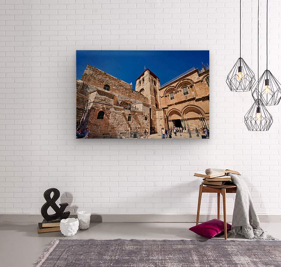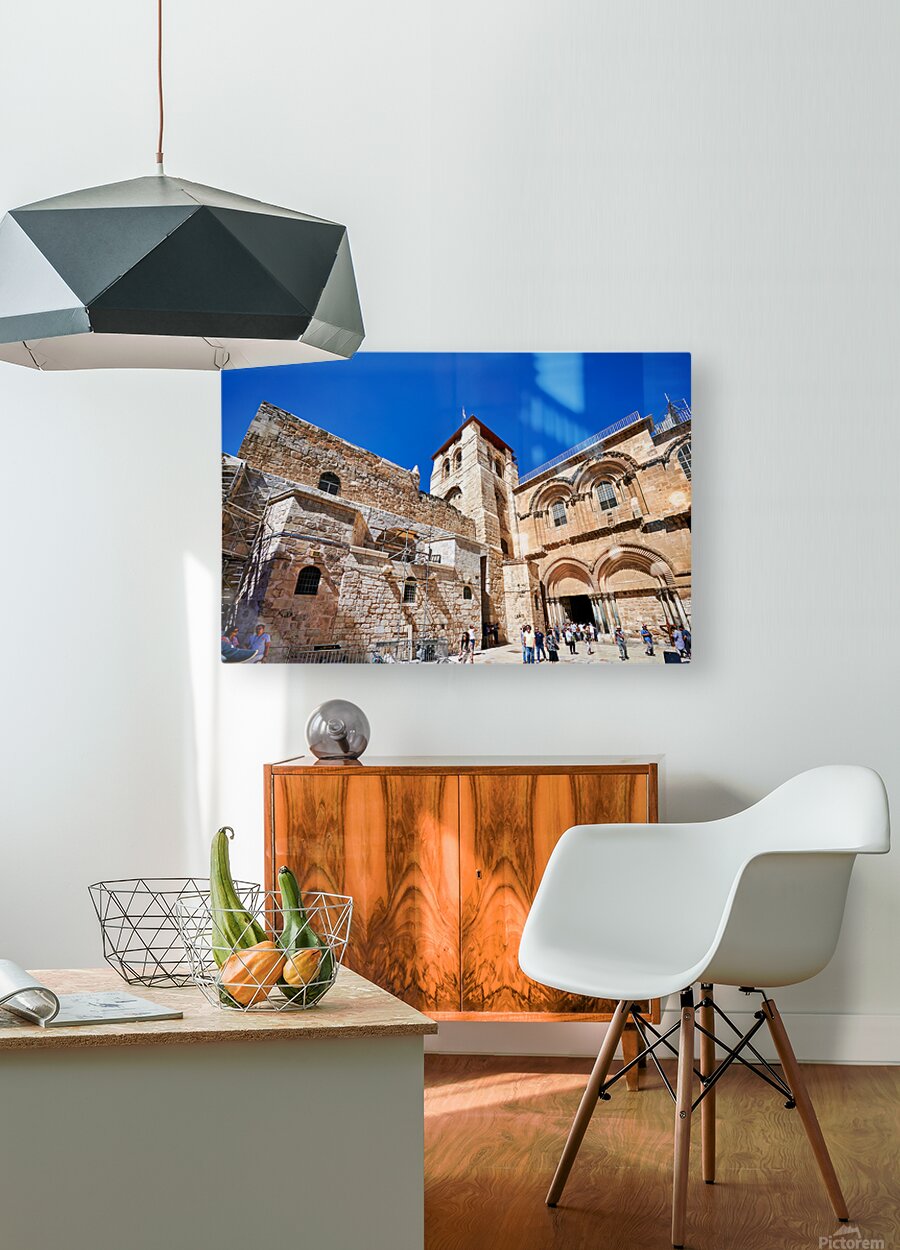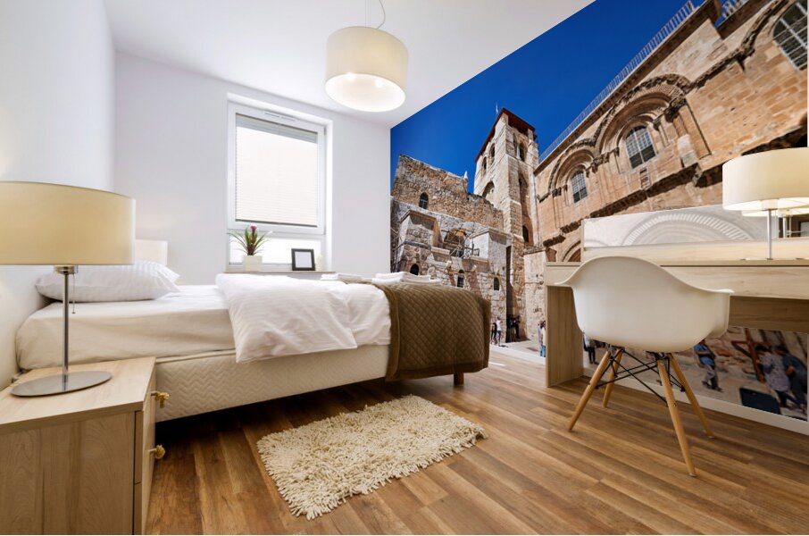 Visitors gather around the Church of the Holy Sepulchre in Jerusalem. The sun shines bright as people explore the historic site and its architecture.
