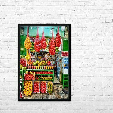Get this artwork "Market in the old city of Jerusalem with fresh fruit and juice" in a framed print.