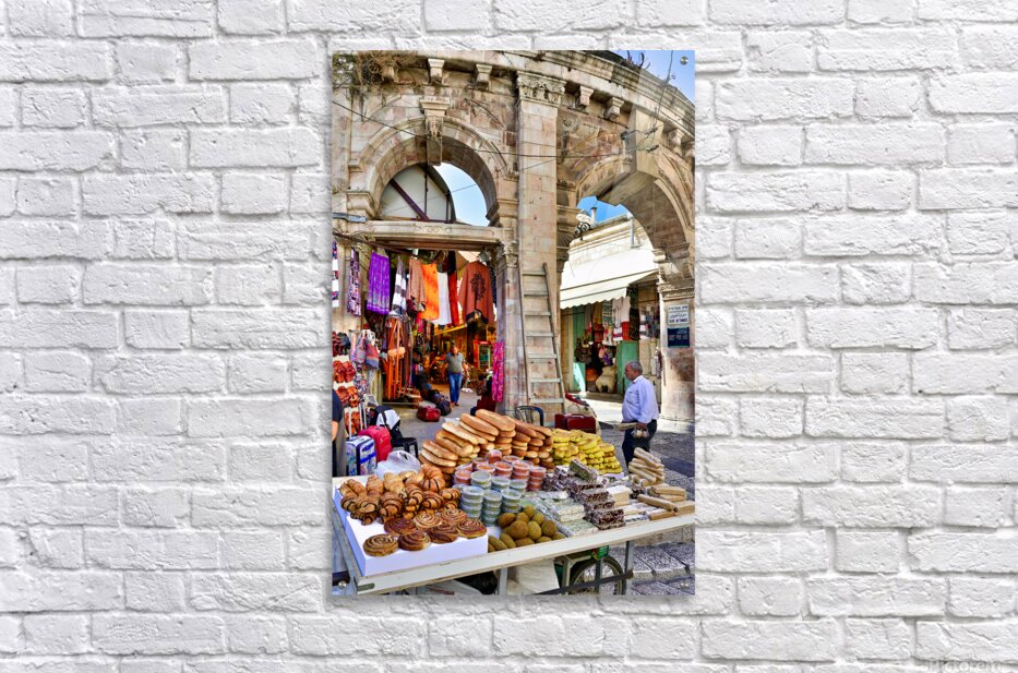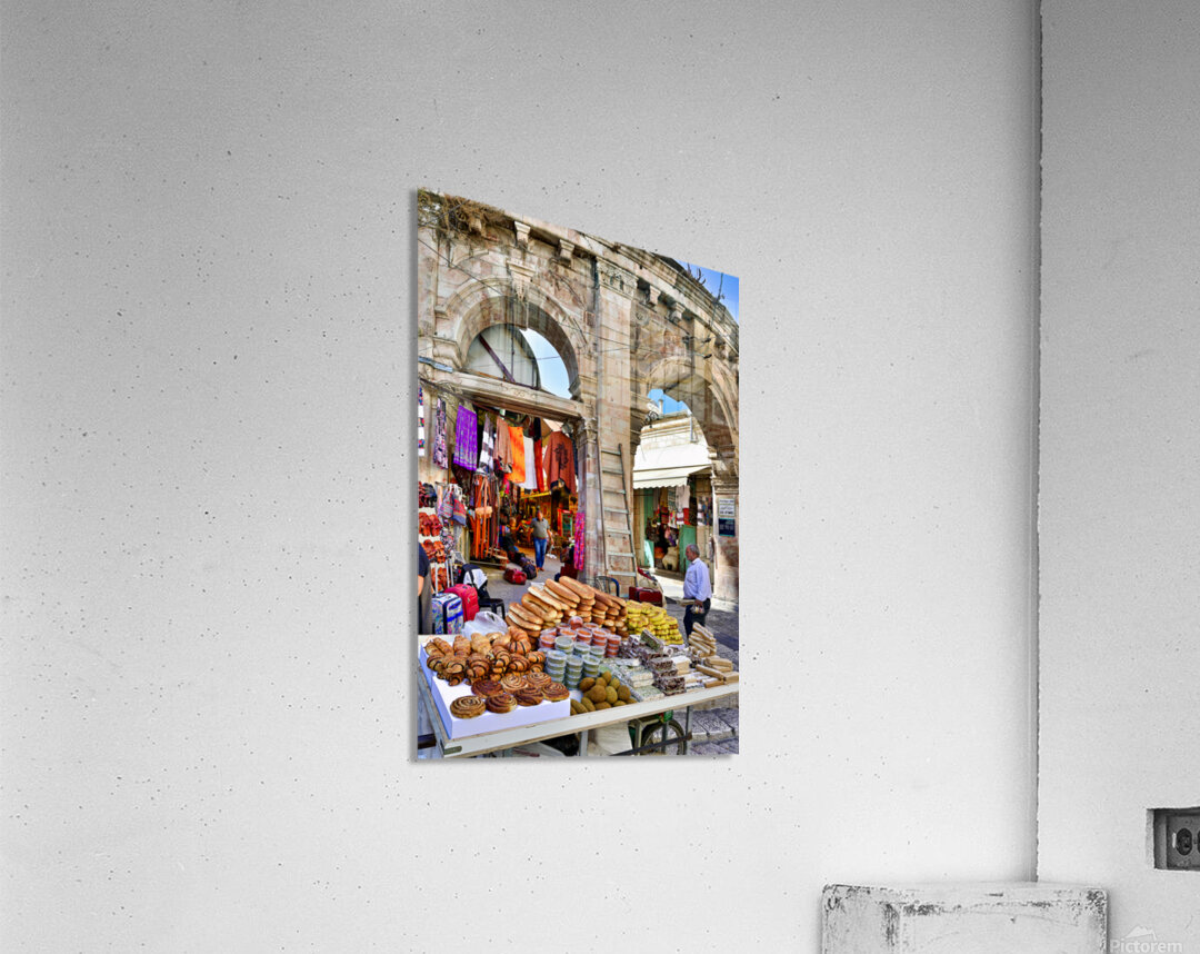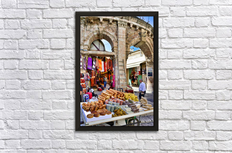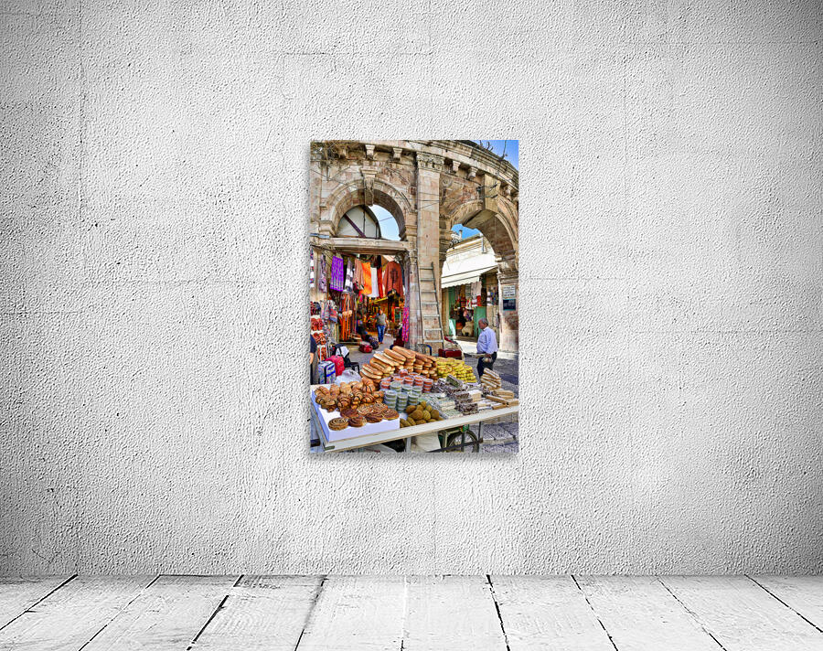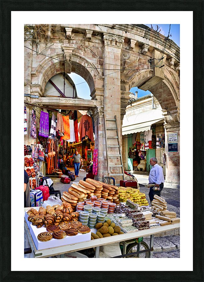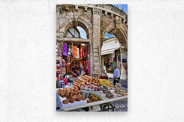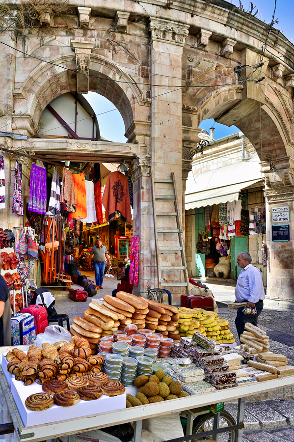 A stall offers bread and sweets in the Old City of Jerusalem. People are walking nearby and interacting with the market scene.
