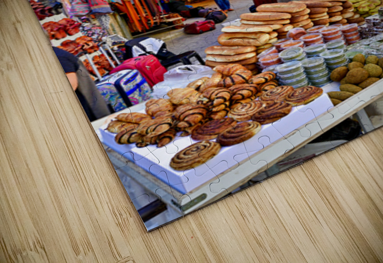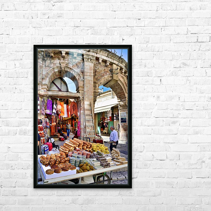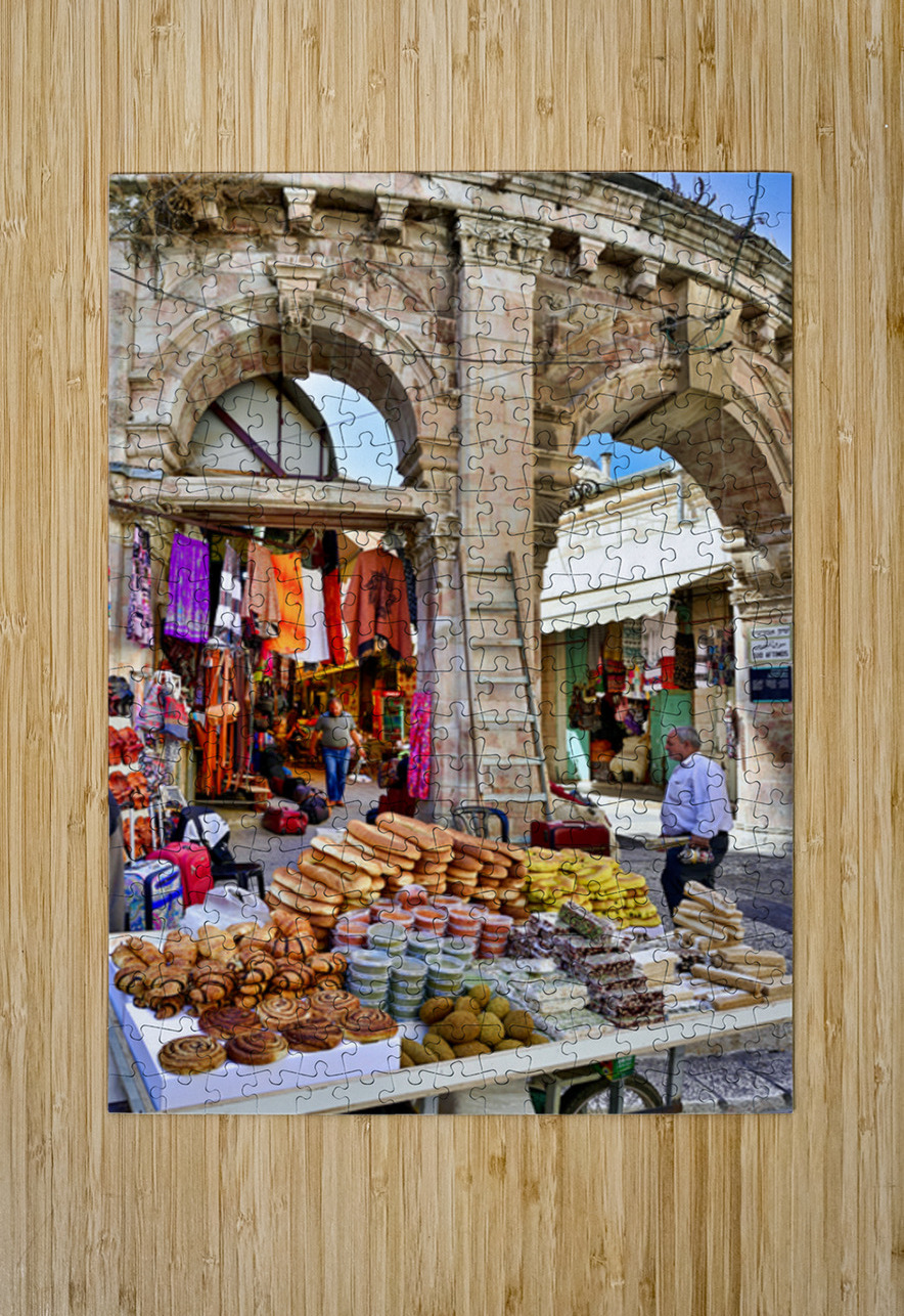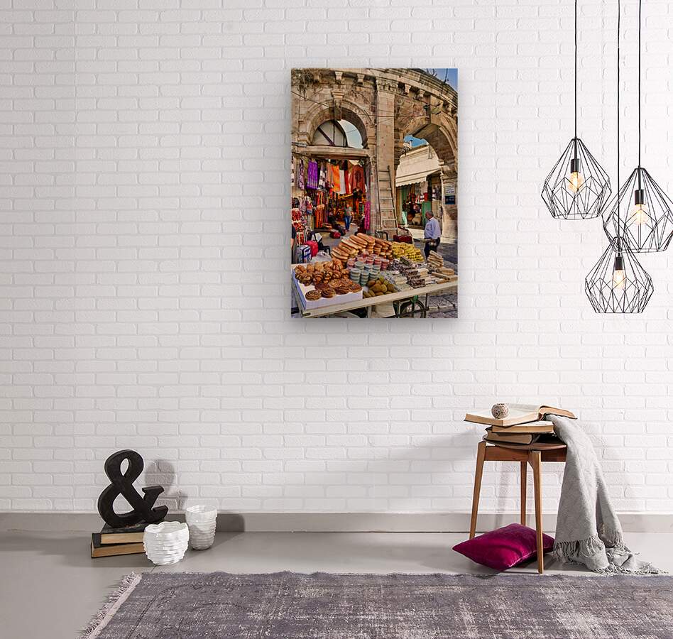 A stall offers bread and sweets in the Old City of Jerusalem. People are walking nearby and interacting with the market scene.